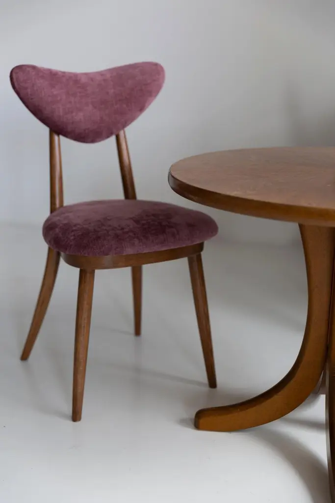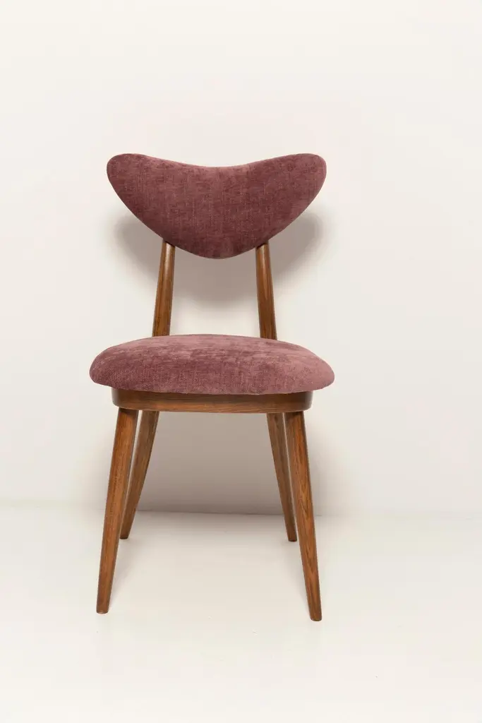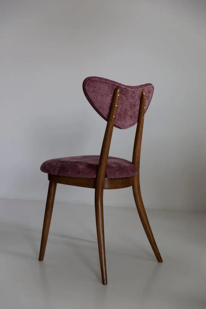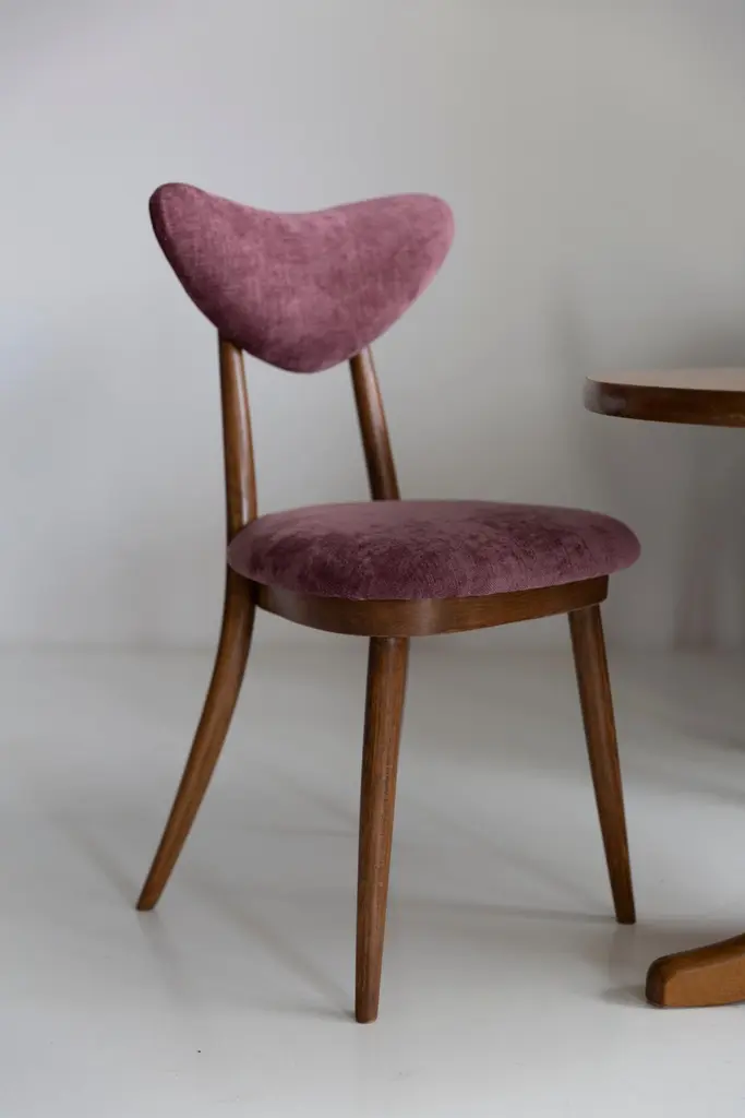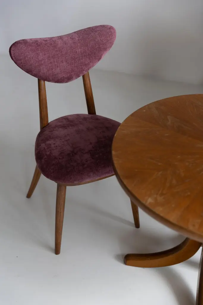 Chair type A5828. Colloquially called "heart". The furniture was designed by Helena and Jerzy Kurmanowicz. They were produced in Radomsko Woodworking Factory and we thoroughly renovated them.The construction is made of beechwood dyed with water light brown. The chairs are protected with acrylic varnish with a satin glow. The upholstery fabric was produced in the Clean boo technology and has water-repellent properties. This means that the fabric limits the absorption of liquids. Spilled liquid on the surface will form balls. The chairs have undergone a complete carpentry and upholstery renovation. Seats covered with high-quality plum violet velvet fabric. ABRASION RESISTANCE Category A (50,000 cycles). This velvet is recommended for public buildings and private interiors. It has Oekotex. We confirm the flame retardancy of the fabric according to the French standard NF P 92-507, classified as M1.We can prepare also smaller or bigger sets of 2, 6, 8, 10 or more chairs in different wood and velvet color.Please check the last pictures with color samples.