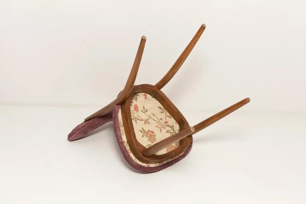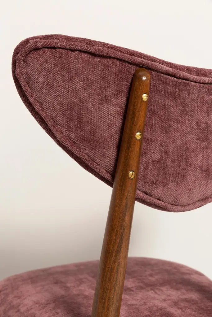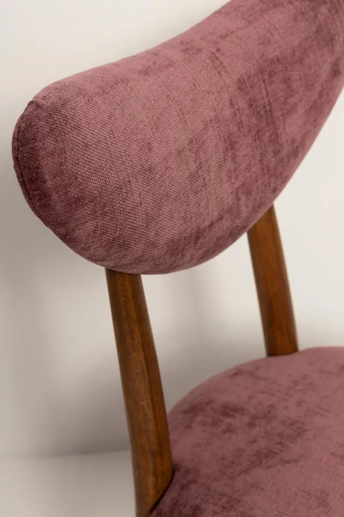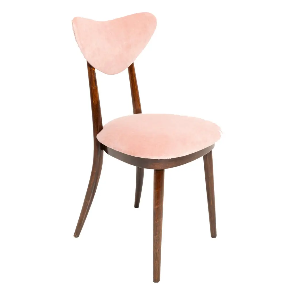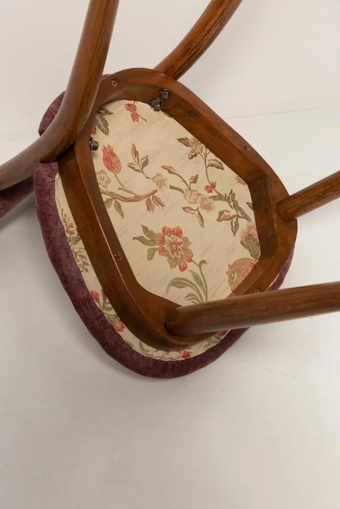 Chair type A5828. Colloquially called "heart". The furniture was designed by Helena and Jerzy Kurmanowicz. They were produced in Radomsko Woodworking Factory and we thoroughly renovated them.The construction is made of beechwood dyed with water light brown. The chairs are protected with acrylic varnish with a satin glow. The upholstery fabric was produced in the Clean boo technology and has water-repellent properties. This means that the fabric limits the absorption of liquids. Spilled liquid on the surface will form balls. The chairs have undergone a complete carpentry and upholstery renovation. Seats covered with high-quality plum violet velvet fabric. ABRASION RESISTANCE Category A (50,000 cycles). This velvet is recommended for public buildings and private interiors. It has Oekotex. We confirm the flame retardancy of the fabric according to the French standard NF P 92-507, classified as M1.We can prepare also smaller or bigger sets of 2, 6, 8, 10 or more chairs in different wood and velvet color.Please check the last pictures with color samples.