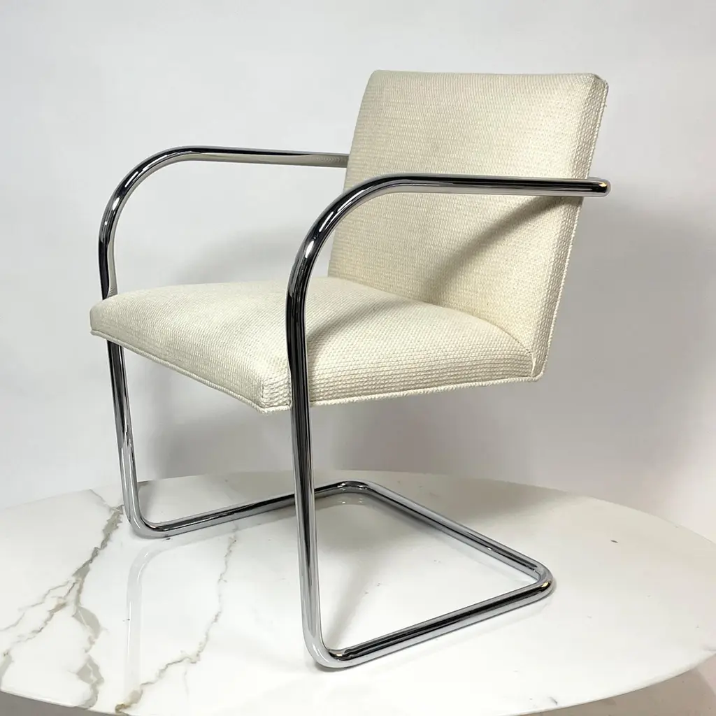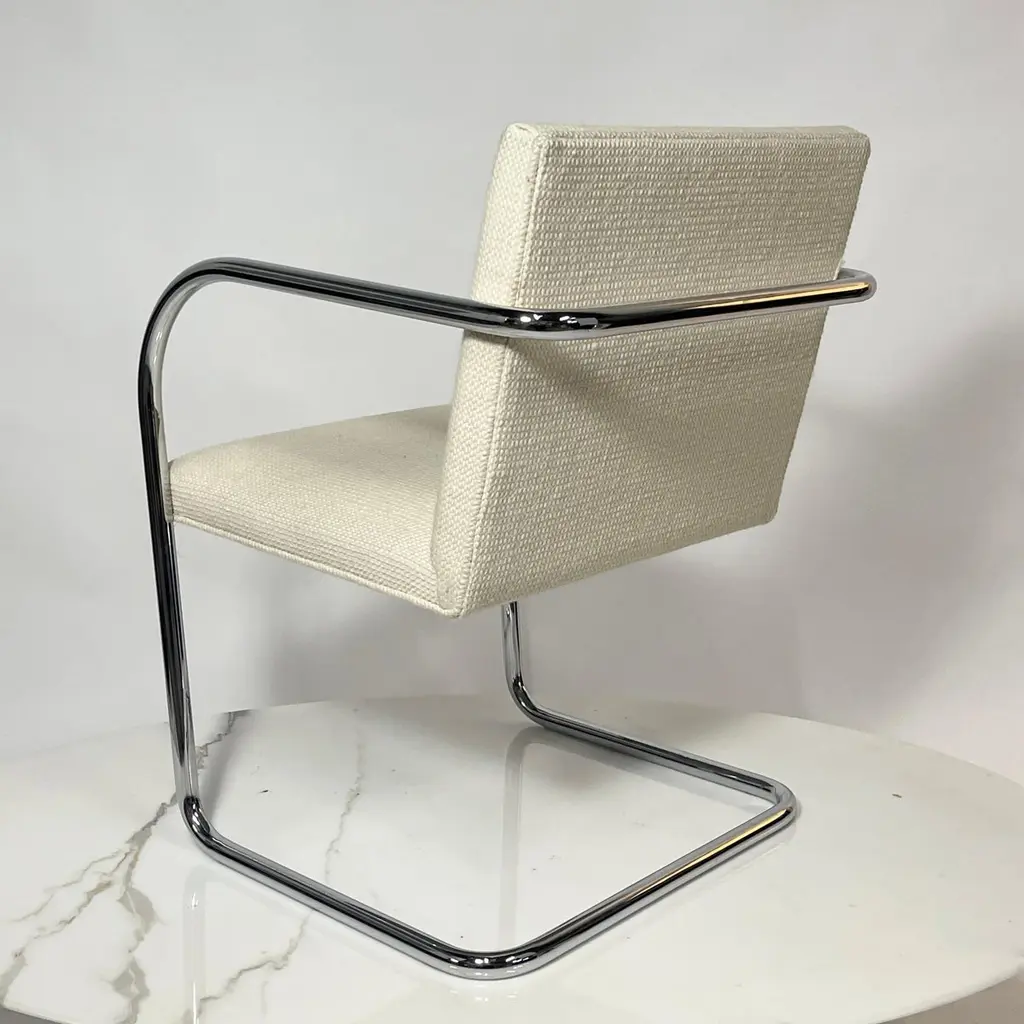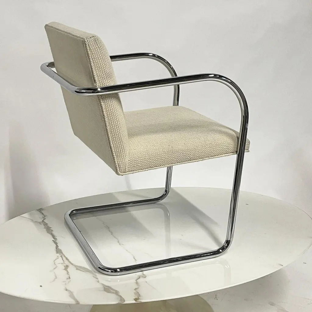 Knoll Brno chair designed by Mies Van der Rohe. These chairs are upholstered in Knoll's Cato upholstery. Color is 'natural'- which reads as a pale oatmeal color. These chairs are from 2018 so in very nice condition. Priced per chair. Approximately 60 available.Cato Upholstery in NaturalDesigned by KnollTextiles 1961--Introduced in 1961, Cato has achieved iconic status among upholstery textiles. Primarily constructed of wool, the exaggerated texture of this pattern recalls the hand weaving tradition.KNOLL BRNO chair.From KNOLL:The elegant Brno Tubular Chair (1930) has a chromed tubular steel frame that fluidly bends into a curving single-piece form, gracefully supporting the sitter while seemingly defying gravity. The Brno Chair is a registered trademark of Knoll, Inc., manufactured by Knoll according to the original and exacting specifications of the designer. Made in Italy.One of the first cantilevered chair designs to be produced.Stamped with the KnollStudio logo and the designer’s signature.