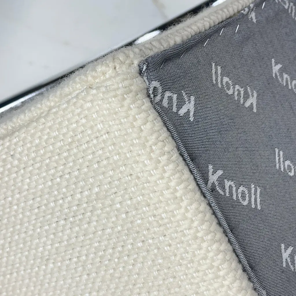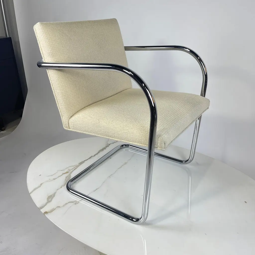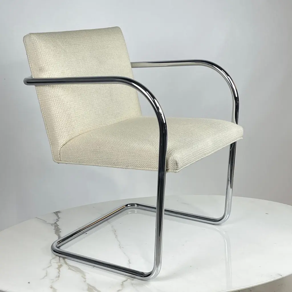 Knoll Brno chair designed by Mies Van der Rohe. These chairs are upholstered in Knoll's Cato upholstery. Color is 'natural'- which reads as a pale oatmeal color. These chairs are from 2018 so in very nice condition. Priced per chair. Approximately 60 available.Cato Upholstery in NaturalDesigned by KnollTextiles 1961--Introduced in 1961, Cato has achieved iconic status among upholstery textiles. Primarily constructed of wool, the exaggerated texture of this pattern recalls the hand weaving tradition.KNOLL BRNO chair.From KNOLL:The elegant Brno Tubular Chair (1930) has a chromed tubular steel frame that fluidly bends into a curving single-piece form, gracefully supporting the sitter while seemingly defying gravity. The Brno Chair is a registered trademark of Knoll, Inc., manufactured by Knoll according to the original and exacting specifications of the designer. Made in Italy.One of the first cantilevered chair designs to be produced.Stamped with the KnollStudio logo and the designer’s signature.