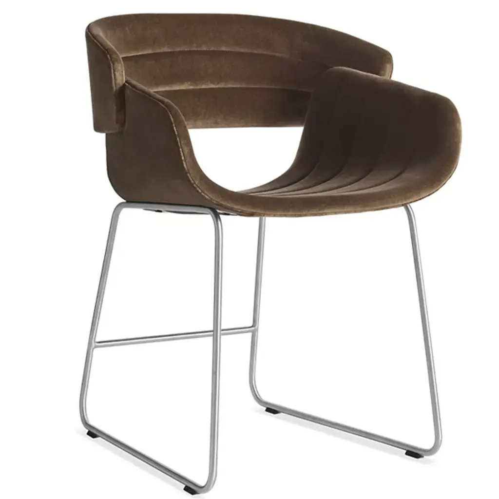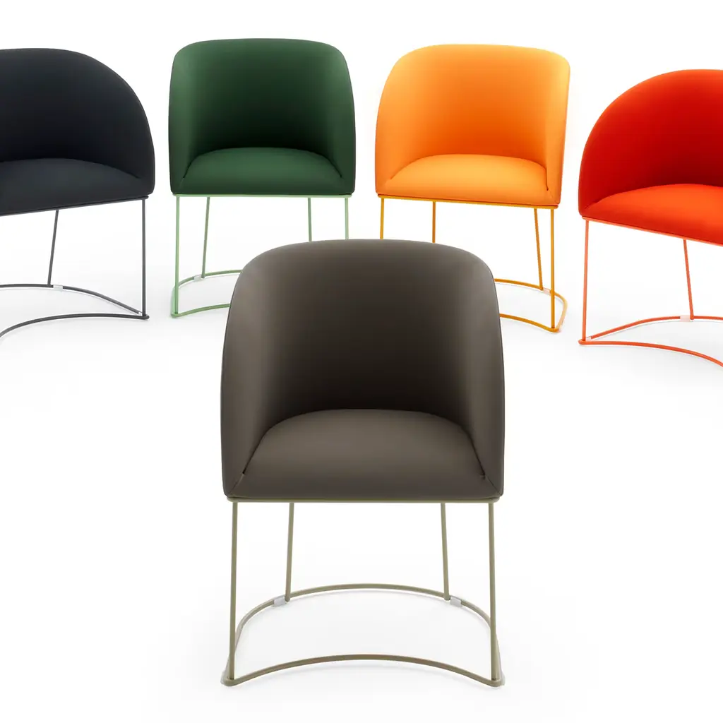 Milly was born from an awareness of all the time we spend sitting. In the office, in waiting rooms and during meetings, the innovative single radius curve in steel rod makes it a chair with essential, contemporary shapes. Visitor chair with internal steel frame with fire retardant cold foam padding, frame in sand-colored steel rod, diameter 11 mm, upholstered in dove-gray flame-resistant fabric. Please ask the Concierge for customization options.
