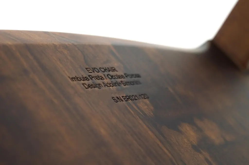 Evo Chair collection.Our Evo collection is based in the harmonic fusion between geometrical forms and the modern interpretation of wood archetypes. All elements that compose the chair are precisely engineered to input full hardwood blocks to a Hybrid 5-Axis CNC milling machine that carves and sculpt the wood with precision to achieve minimal thicknesses, transitions between elements and milimetricamente definition, every little piece of the chair passes in a array of posterior processes until a they are assemble together to create the final product, that contains precise and tangent junctions between pieces, that give life to a sturdy and durable chair that will live thru out many generations to come. Expect a stunning, elegant chair, designed with passion in a project that evolved with our studio story.We offer many Tauarí solid wood options and a back imbuia limited edition of 120 units, the black imbuia is a hardwood very difficult to find because it is an extinct wood species, so there is no more to extract since many years. Listing illustrates the tauari solid black (ebanized) without arms version. We use only high quality, premium woods, the, tonality and veins drawing vary from item to item, been a living material. Items are made upon order, usually take 20-30 days to dispatch depending on the order size this may vary. All shipping’s are insured, we follow all orders closely keeping our clients informed of every update on the order. Any additional information about the product or anything you might need we are always available to help, you can reach us sending a message or calling in the 1stdibs platform.
