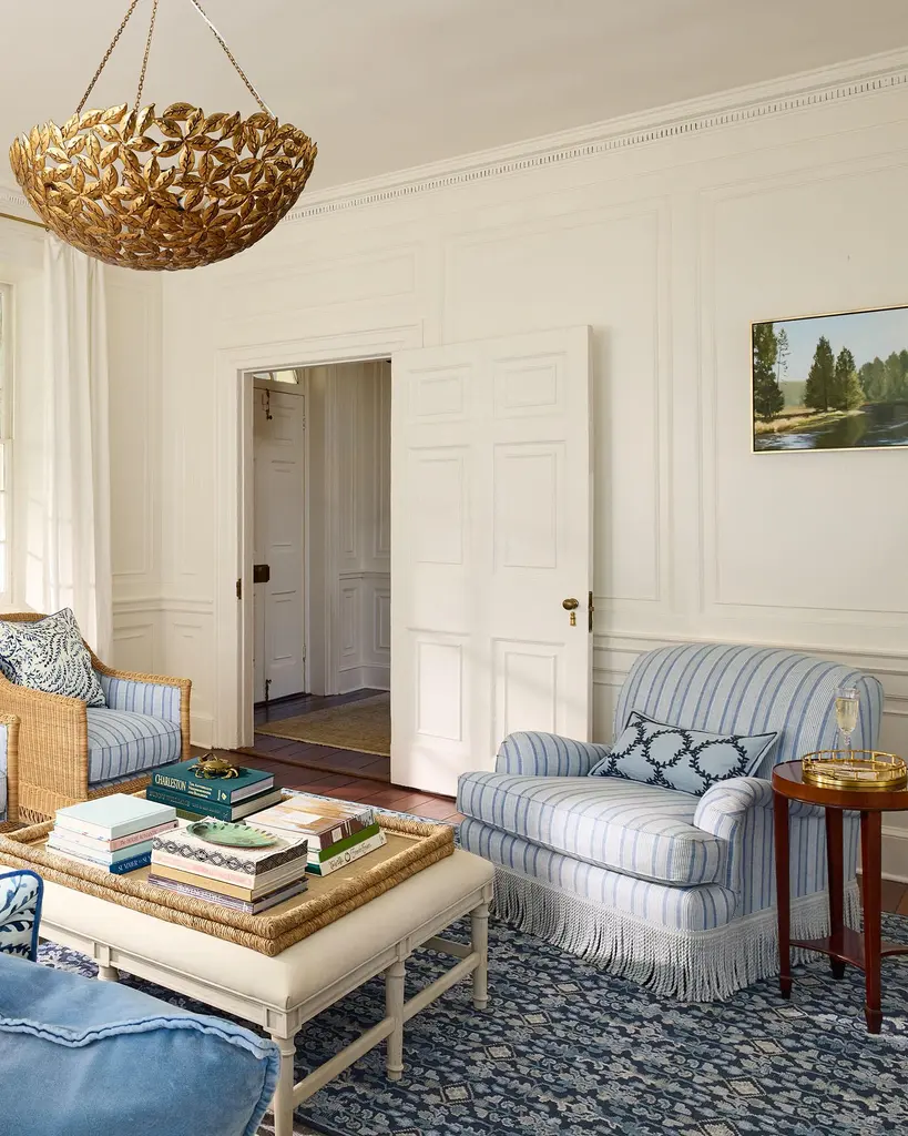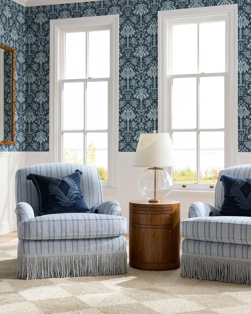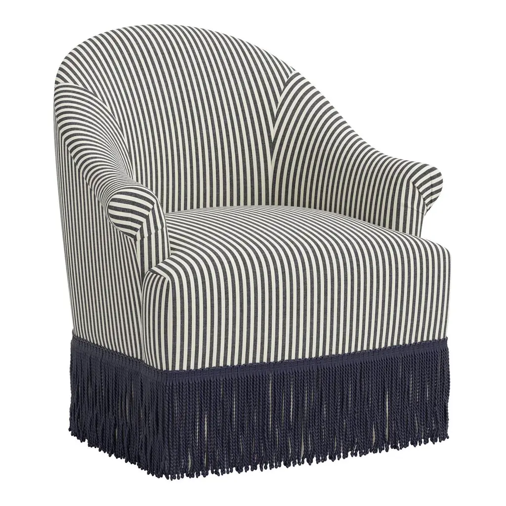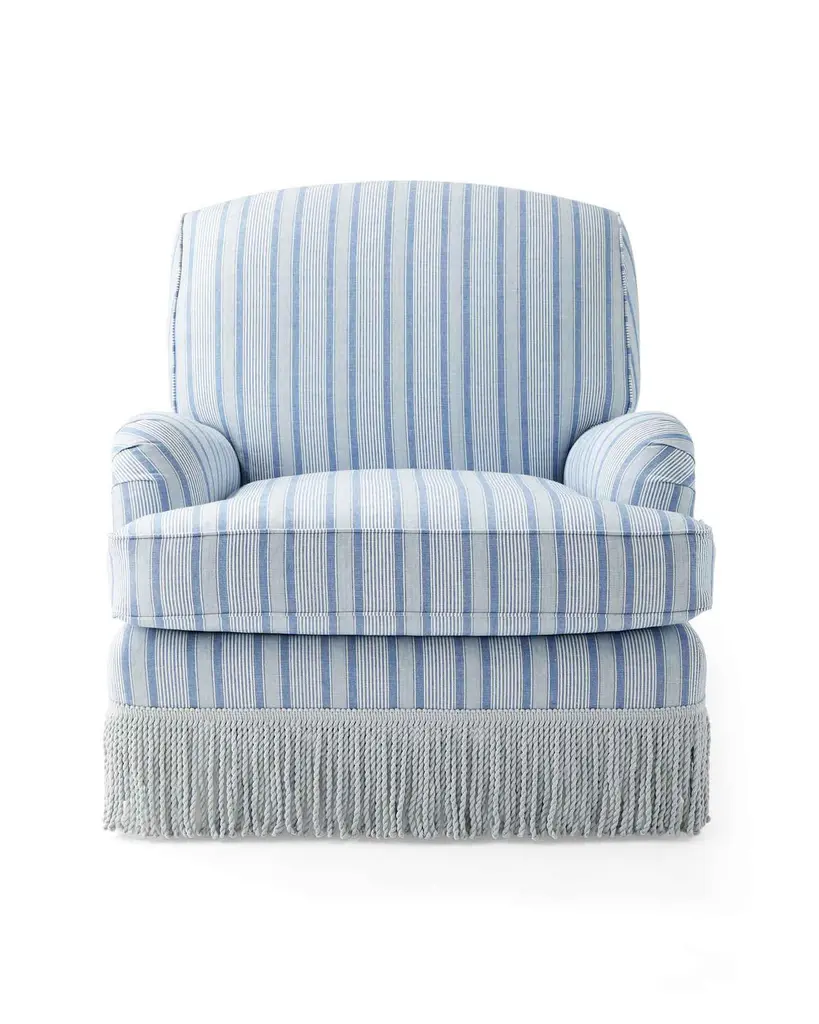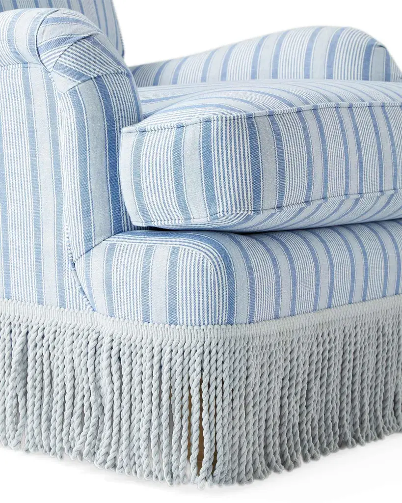 Miramar English Roll Arm Chair In French Blue Kensington Stripe With Coastal Blue Bullion Fringe