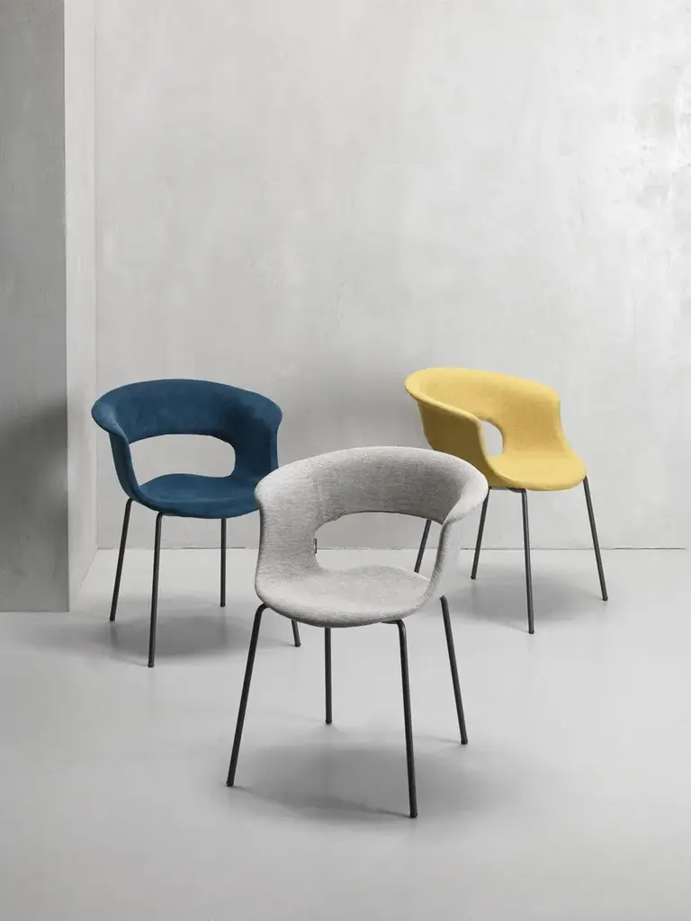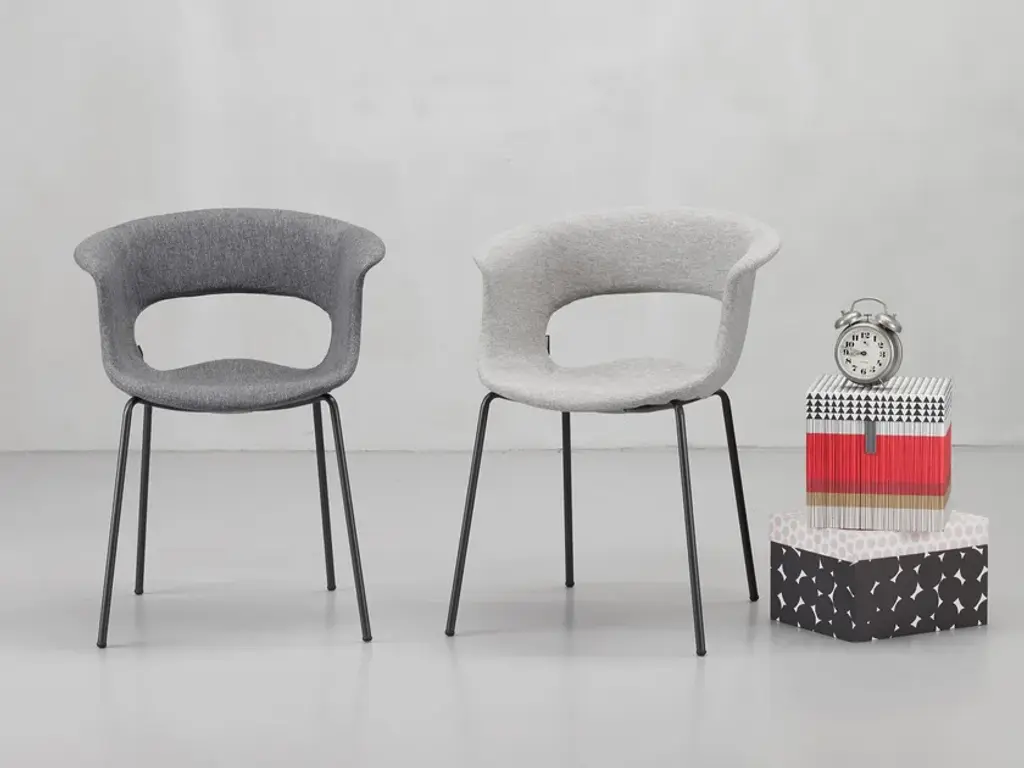 Natural Miss B Pop e Miss B Pop are the perfect combination between elegance and functionality, in order to make the indoor settings spaces to live. Both of them show a soft upholstered shell - extremely comfortable - available in three tonalities of colours: sand, classic grey to give a touch of sobriety, saffron to express vitality. Natural Miss B Pop displays a frame in natural or wenge stained beech, Miss B Pop instead has a steel frame coated in anthracite grey. Product Information: Anthracite grey coated steel frame for Miss B Pop. Natural or wenge stained beech frame for Natural Miss B Pop. Not removable upholstery. Fits perfectly in any indoor environment. For indoor use. Fabric colours: Sand, Classic grey and Saffron.