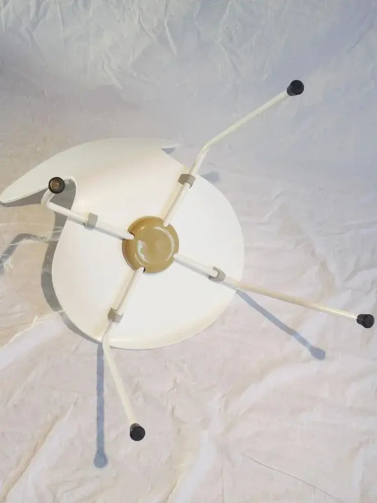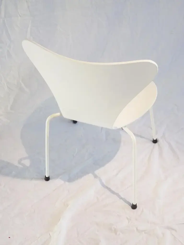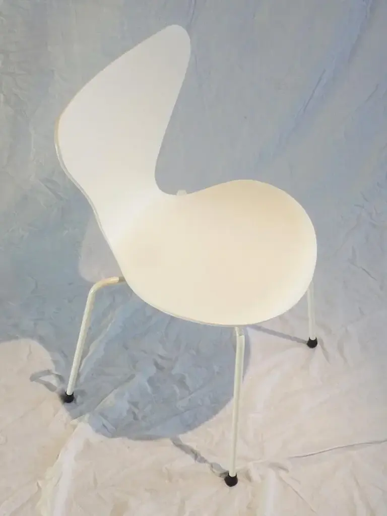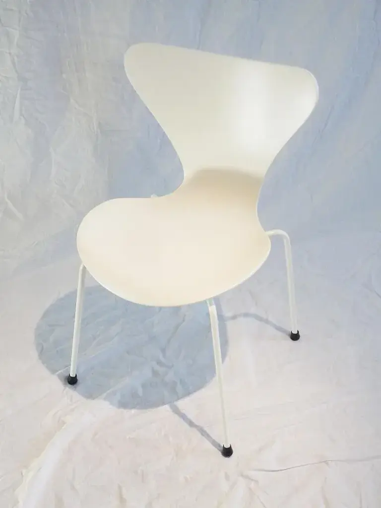 Chair Mod. 3107 created by Arne Jacobsen. FRITZ-HANSEN manufacturing. White epoxy lacquered steel structure. New rubber feet and seat bumper. White lacquered shell. Iconic chair of the 1950s. Stacking. 2 copies available in this finish. This piece has an attribution mark, I am sure that it is completely authentic and take full responsibility for any authenticity issues arising from misattribution