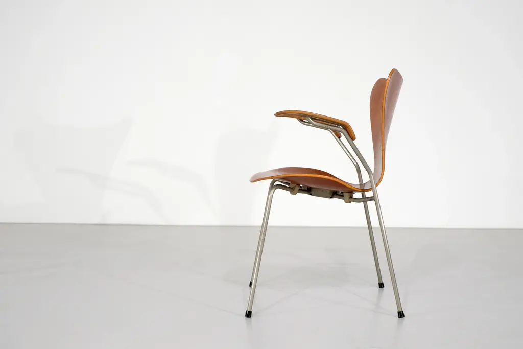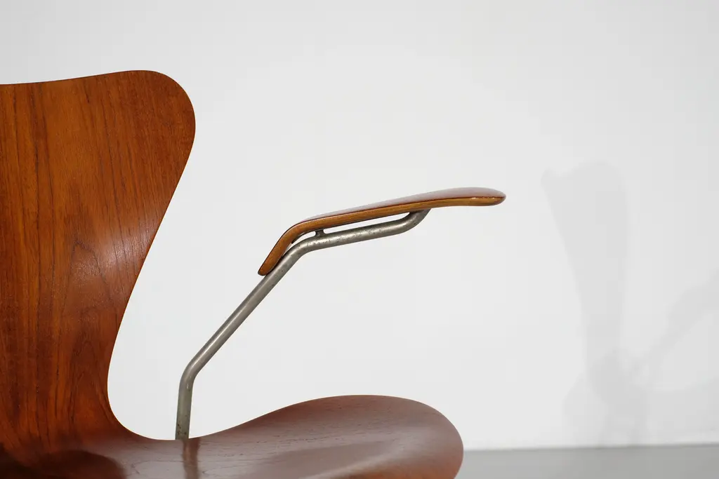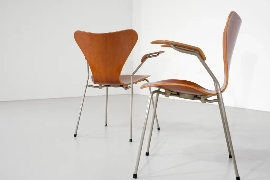 Butterfly chairs with armrests, model "3207," series 7, made of teak on a metal frame, very early version. Designed by Arne Jacobsen, produced by Fritz Hansen, Denmark, 1955. Designer - Arne Jacobsen. Manufacturer - Fritz Hansen. Model - 3207. Production period - 1950s - 1960s. Dimensions - Width 63 cm x Depth 50 cm x Height 74 cm x Seat height 43 cm. Materials - Wood, metal. Color - Brown, gray. Condition and comments - Good condition, wood restored and refinished, some scratches. Light signs of use consistent with age and use (see photos). This piece has an attribution mark, I am sure that it is completely authentic and take full responsibility for any authenticity issues arising from misattribution