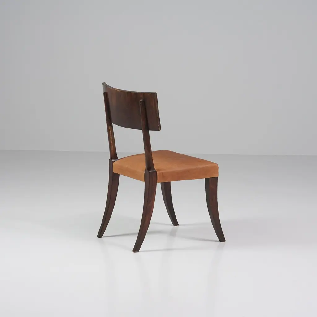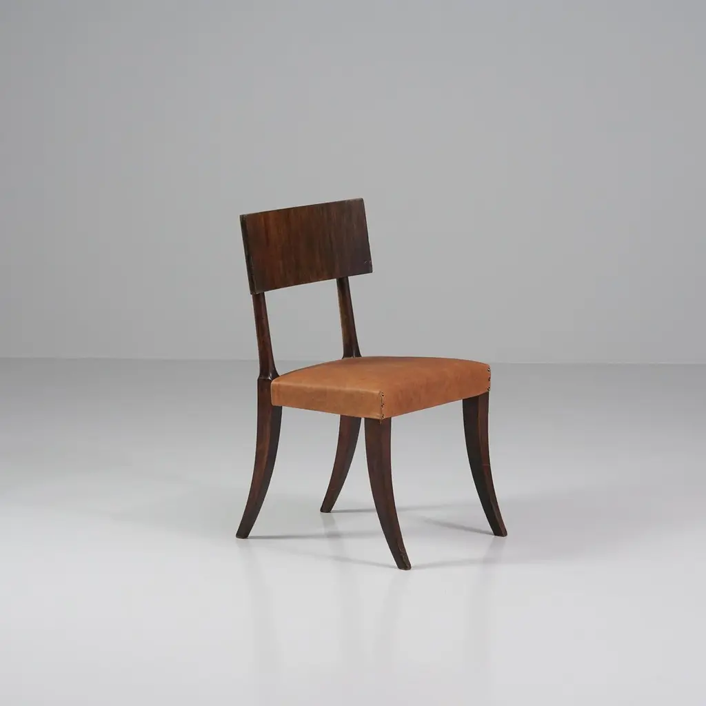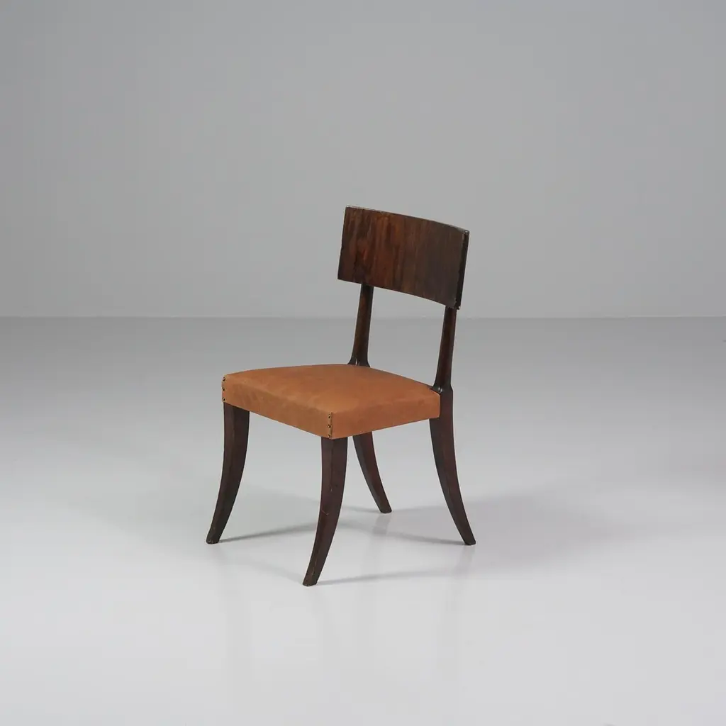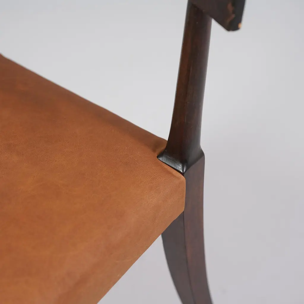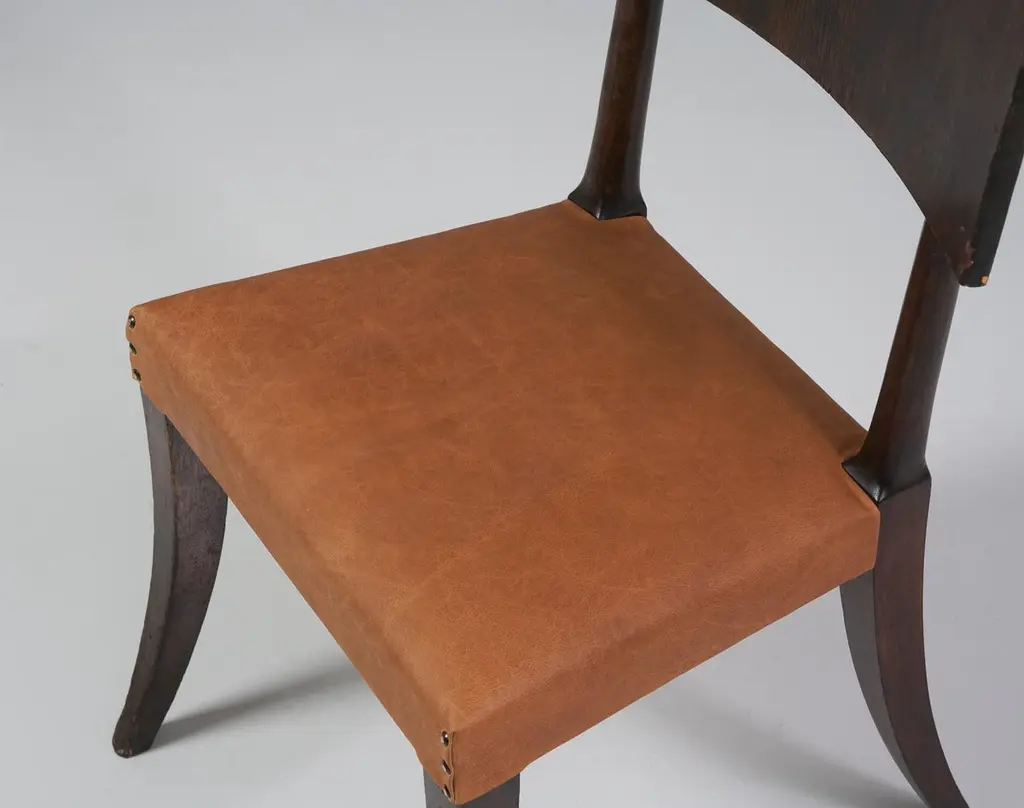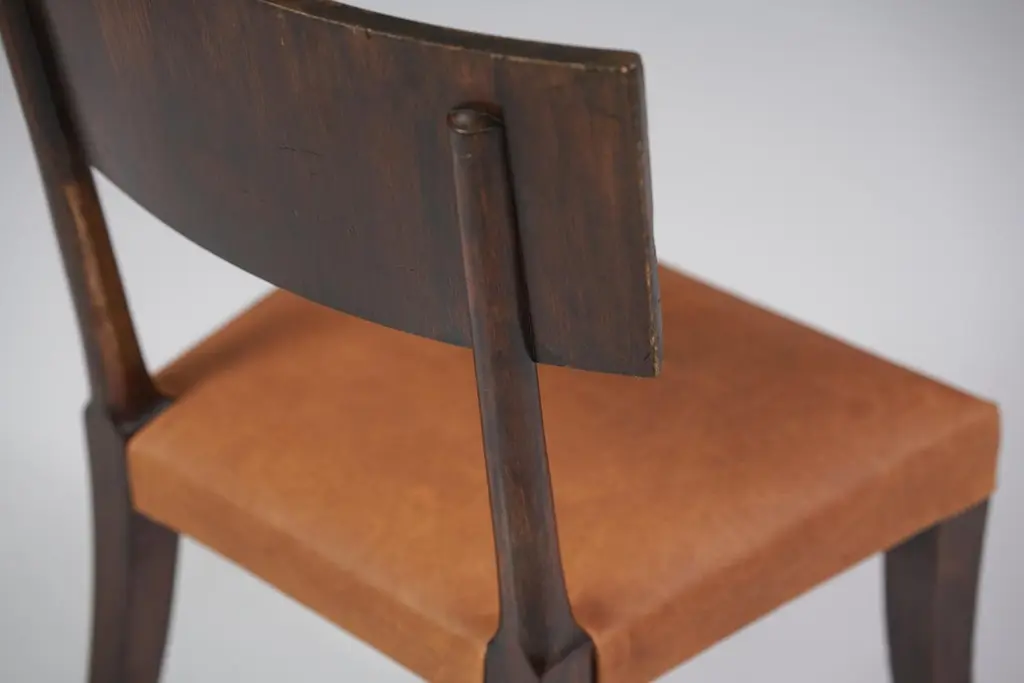 Model "Klismo" chairs, 8 pieces in total sold separately. Design Arttu Brummer for Helsinki University banquet hall, 1930s Stained birch frame with leather upholstery. Good vintage condition, patina and minor wear consistent with age and use.