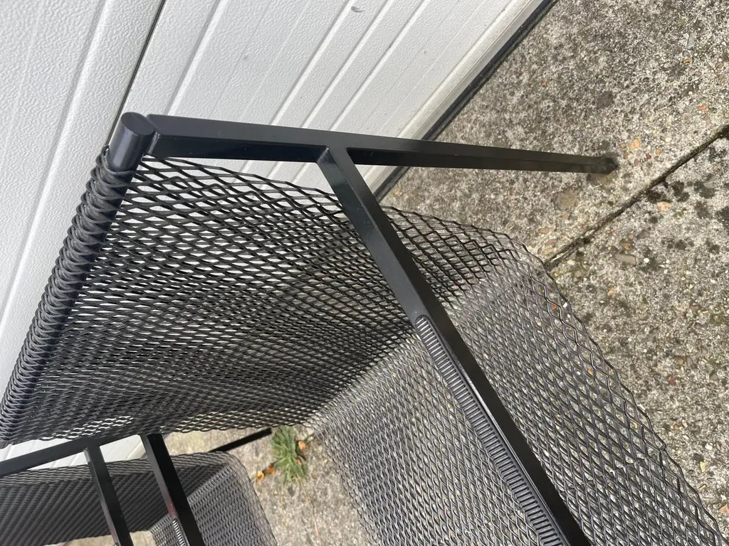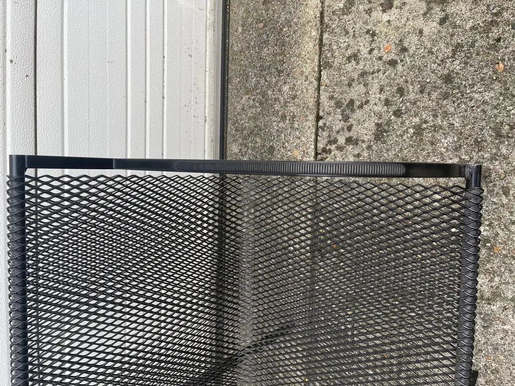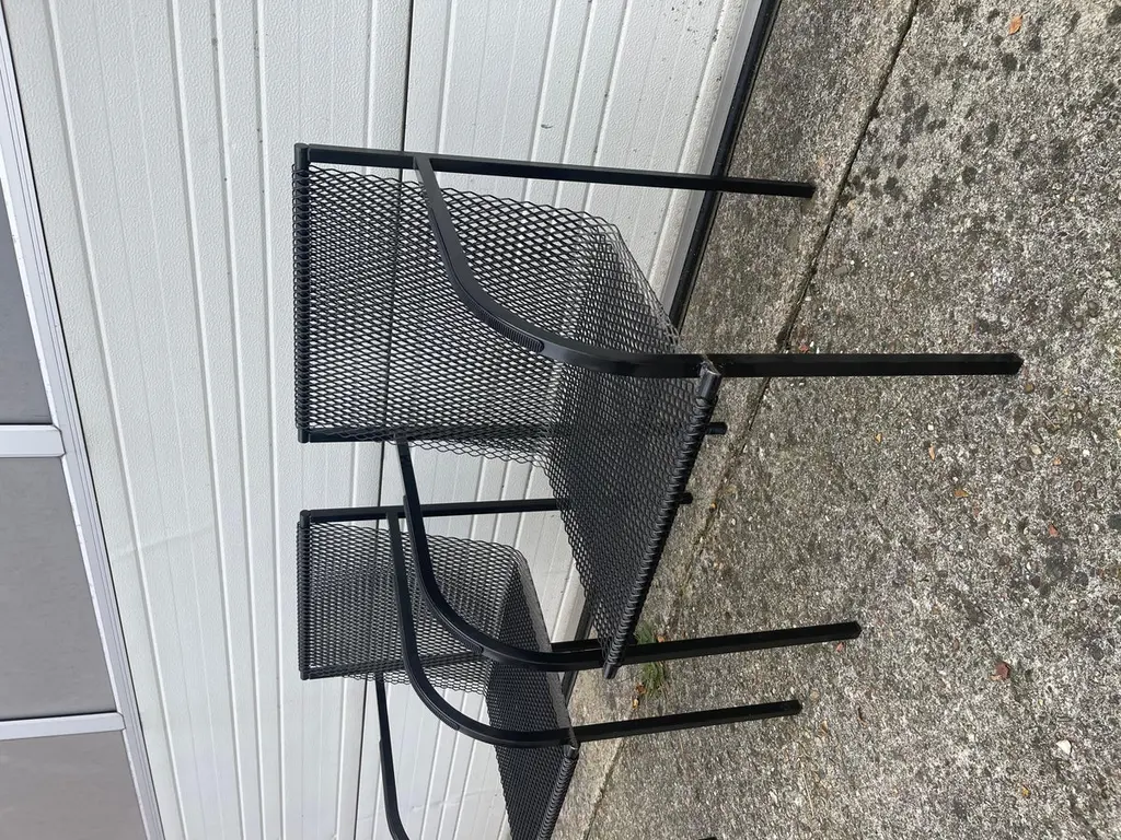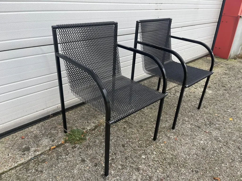 Rare Shiro Kuramata design chairs model R401 Produced by Pastoe 1986Black metal square frame with mesh seating.Rubber details on the armrest There are 6 chairs available.The price is per chair!