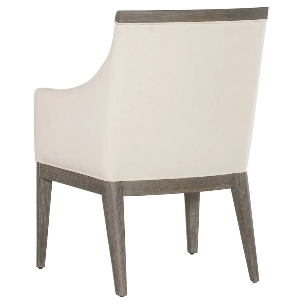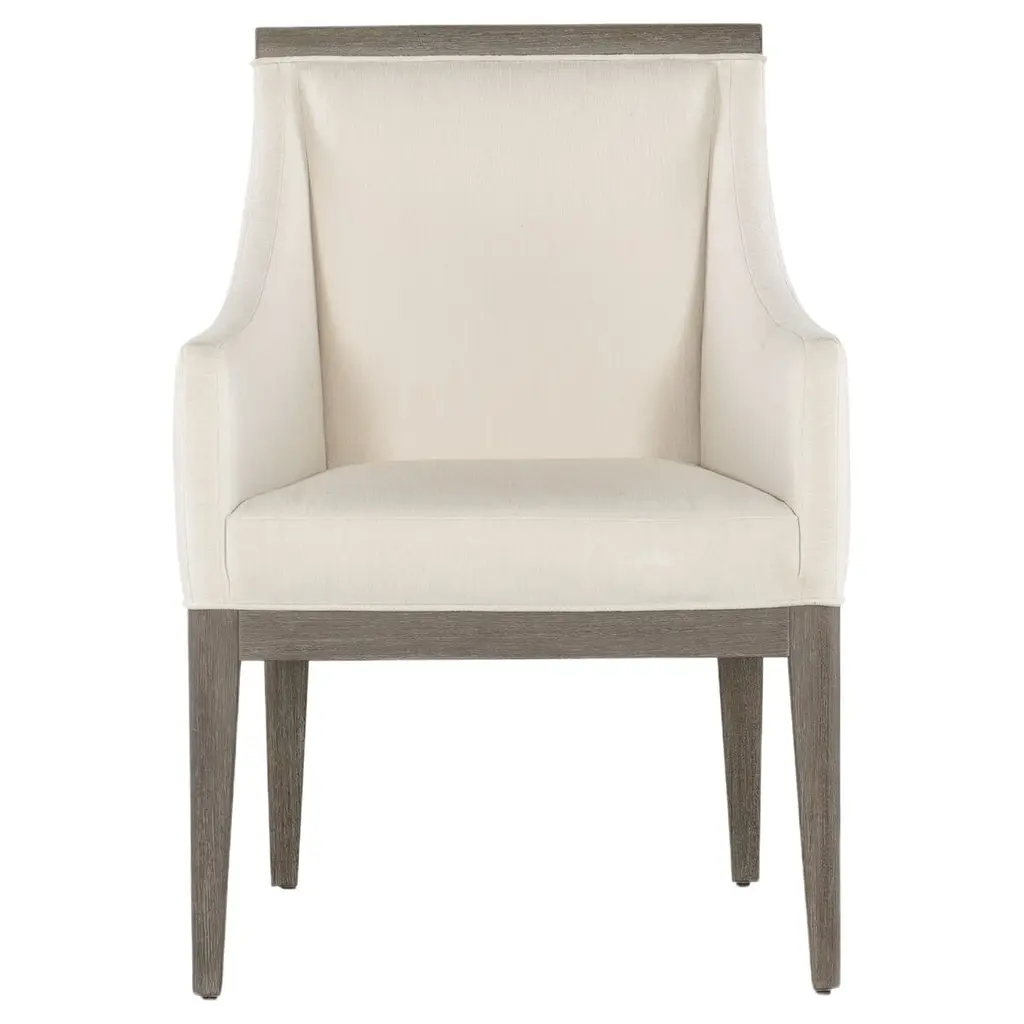 Cozy chic is married to a clean modern profile with the Modern Mood Arm Chair, featuring a comfortable upholstered seat, back and arms. The wood trim along the top of the chair and the wood base and legs are crafted of Flat-Cut Quartered Oak Veneers with wire-brush detailing in a light finish with crystal-like alabaster and pewter hues, delivering a soft sophistication. The sloped-arm chair is upholstered in the Cottony Cotton cover.