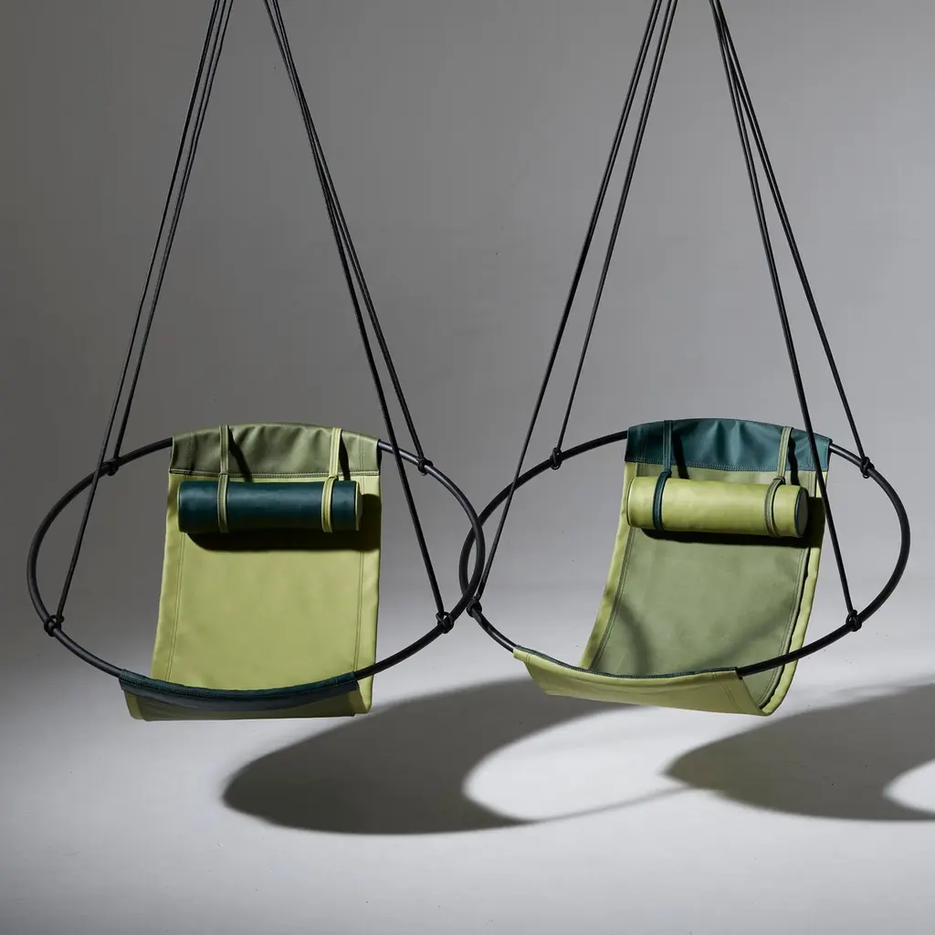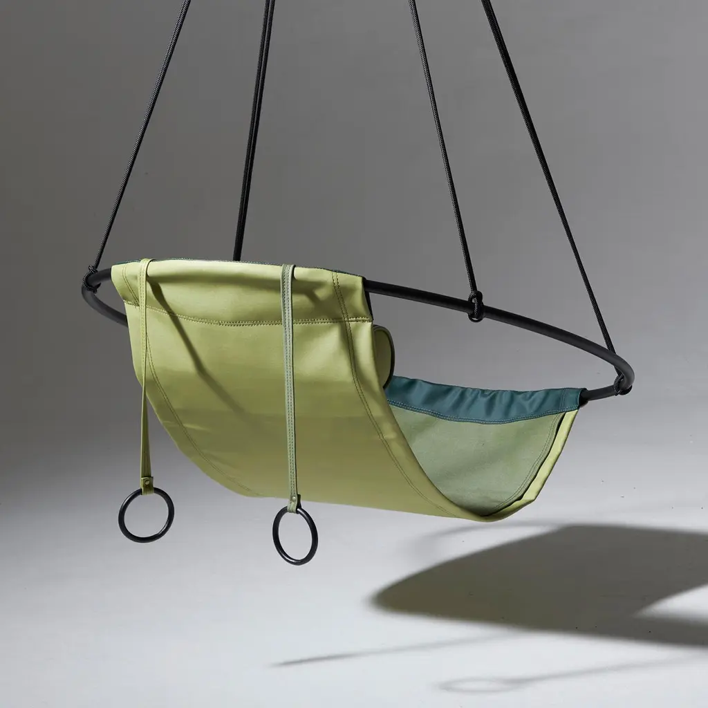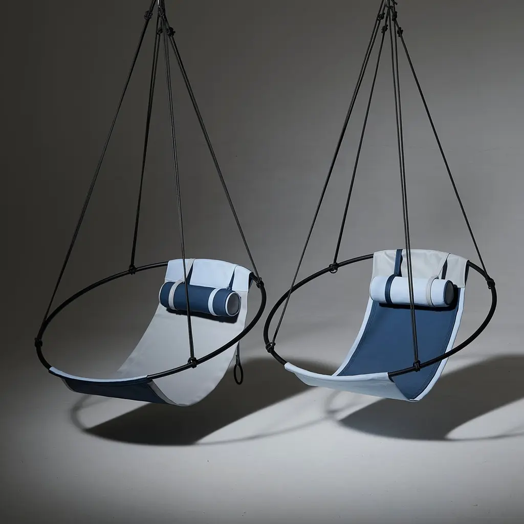 Our Outdoor Sling hanging chair swing seat is crafted with Spradling Silvertex material – a highly sustainable environmentally-friendly vegan material.The Slings can be ordered as a single but also works together as a pair which is slightly different from each other – making an interesting and fun ‘twin’ look. Stripped away from all excess, this hanging chair has a circular frame with the sheets of fabric hanging loose within it, to create a sleek, sexy, and oh so comfortable experience. This chair’s clean lines and lightness makes it a perfect fit for any space.It has a sleek look and an air of functional elegance. Each one is handmade with care by our craftsmen. Form-fitting comfort, perfect for any indoor, under cover patio or outdoor space.Hanging mechanisms are supplied in standard lengths, ready for installation. Contact us for:- available colour options- information on hanging options and standsMade with SPRADLING® Silvertex material – a highly-sustainable vegan and environmentally-friendly material A bolster / neck cushion is included in matching fabric with the straps and weights to hold it in place – dependent on which ones we have in stock Beautiful Modern Contemporary and unique Made By Hand Disassembles and splits in half for flat packing – great in economising packing and freight Indoor & Under Cover Patio & Outdoor Use Maximum Capacity 120 kgs / 265 lbs Powder Coated Frame made from Stainless Steel Made in South AfricaDimensions: L (arm to arm) x W (front to back) x H (top to bottom)100 cm x 100 cm x 35 cm Inches approx. 39.4" x 39.4'' x 13.8"Weight: 8kg / 18 lbs1 Year Warranty-Products to be free from defects in material and workmanship for a period of one (1) year from date of sale. Any product found to be defective within this time period may be returned to our factory, freight prepaid, with prior return authorization for repair or replacement.