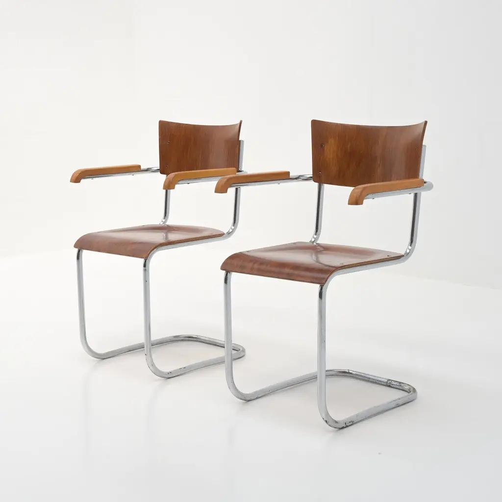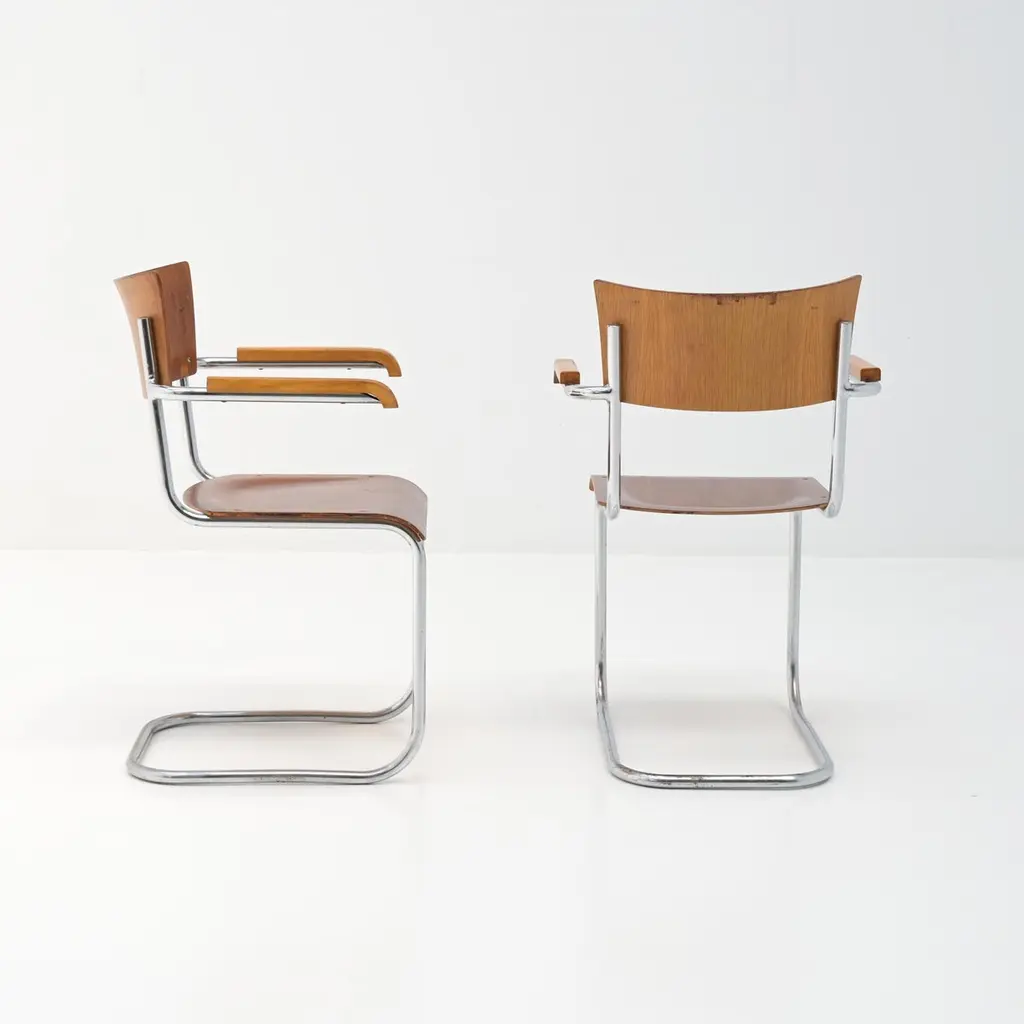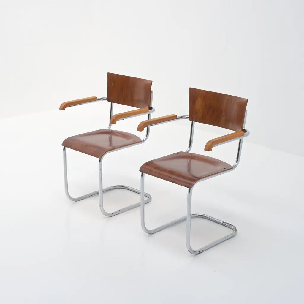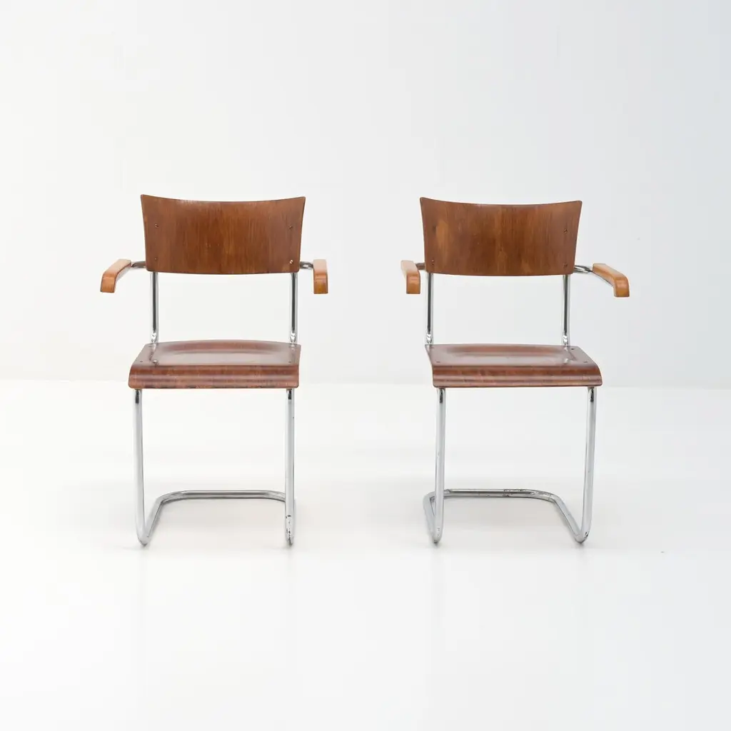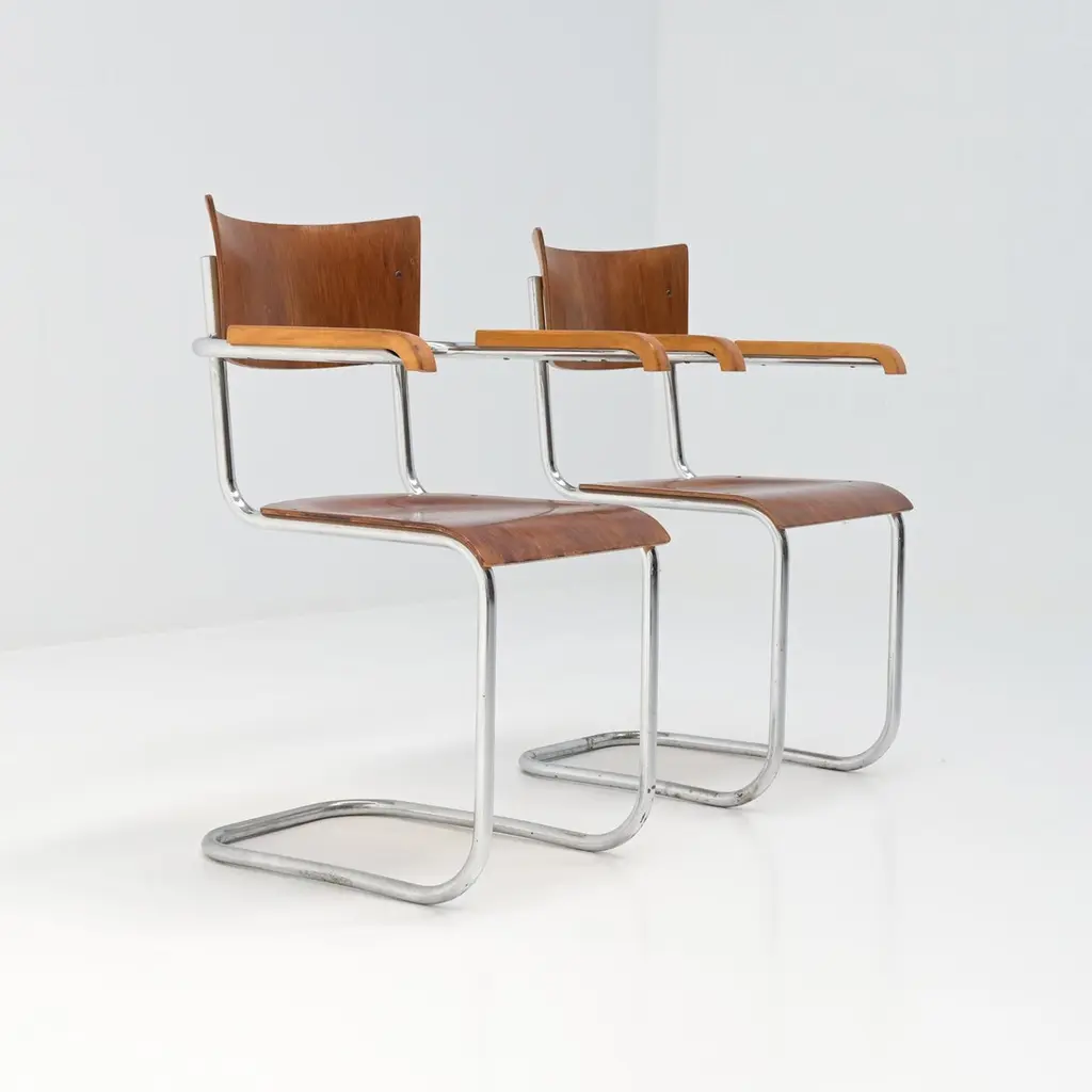 These tubular cantilever chairs can be dated in the early 1930s. Since Mart Stam invented the cantilever chair in 1926, a lot of designers experimented with this new design.This anonymous design is a great example of craftsmanship: the nice detailed chrome tubular metal base with special screws, the plywood seat and back rest, the armrests finished with solid wood.This pair modernist chairs is in very good condition.