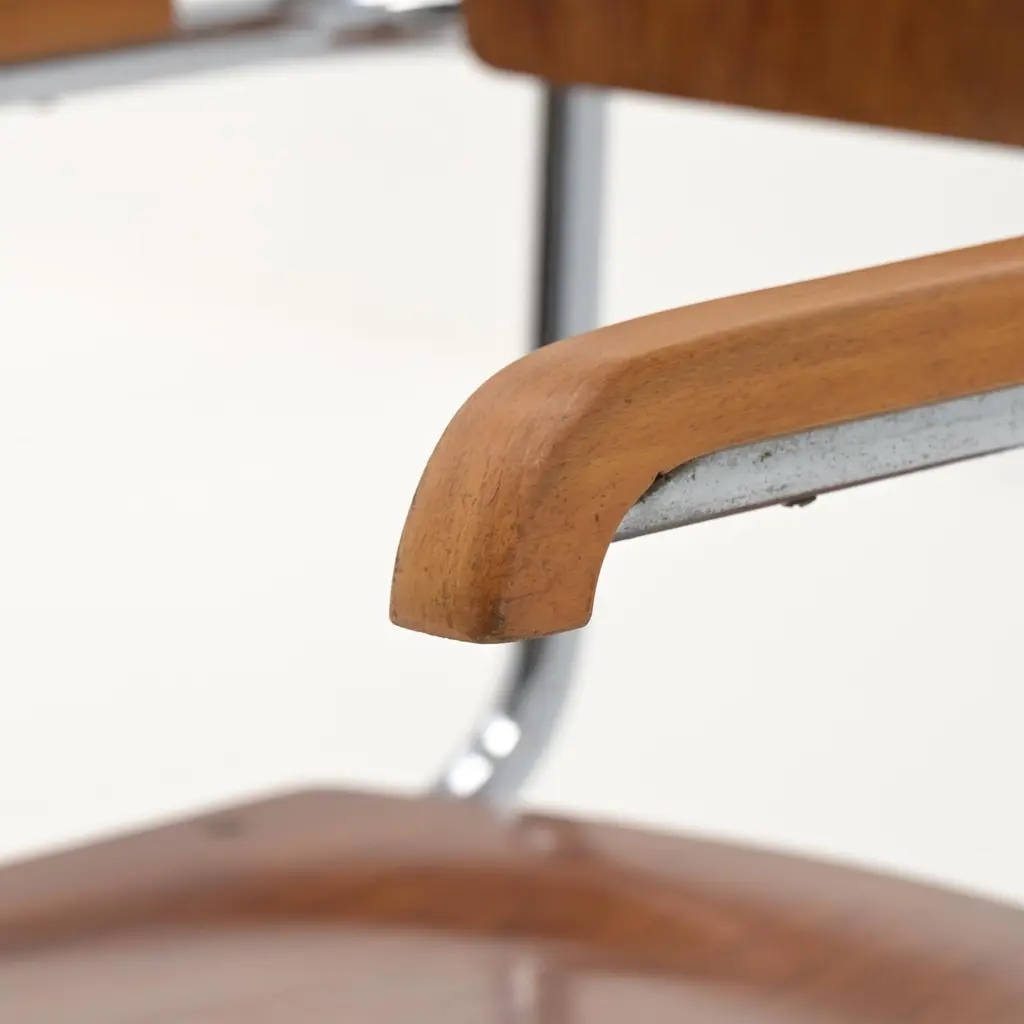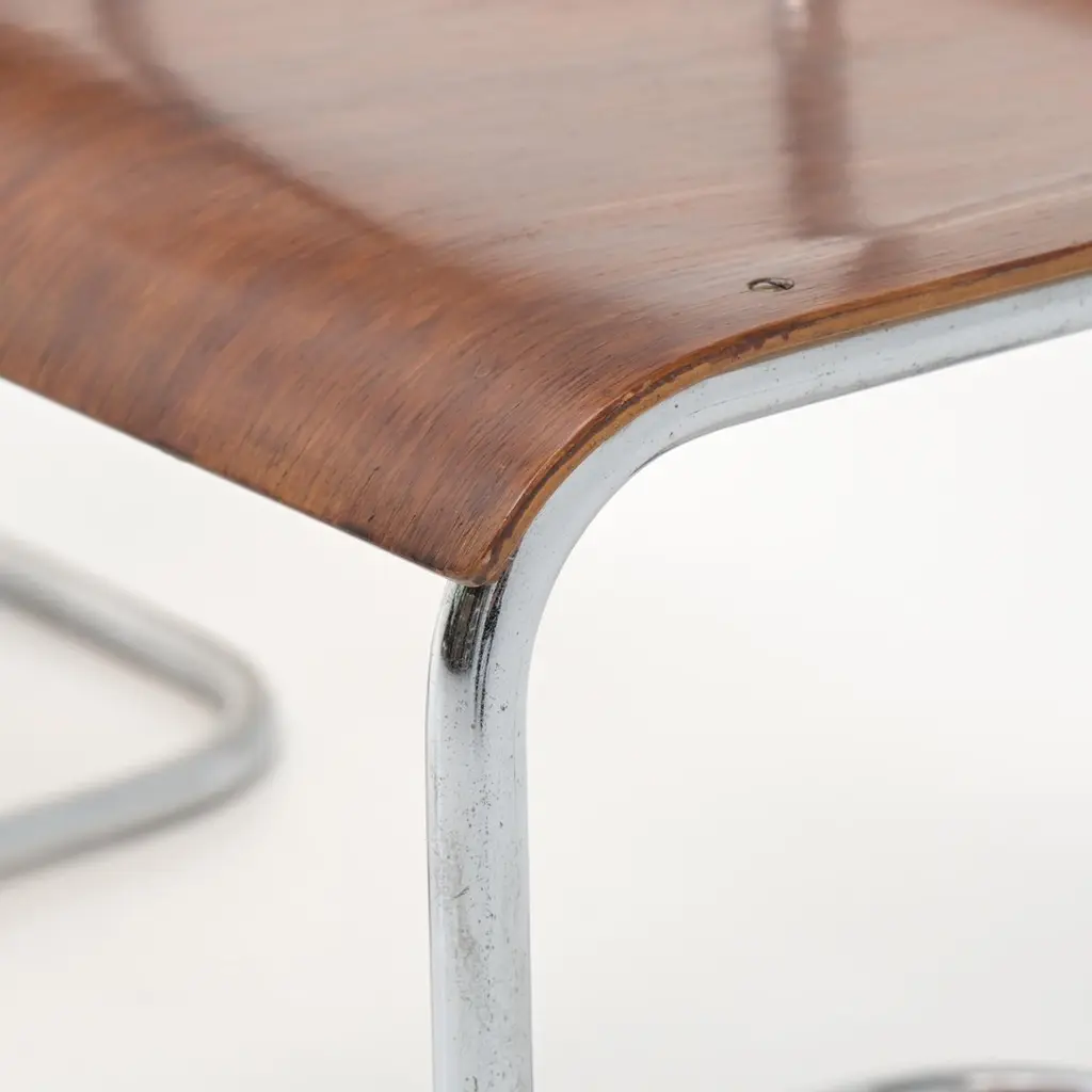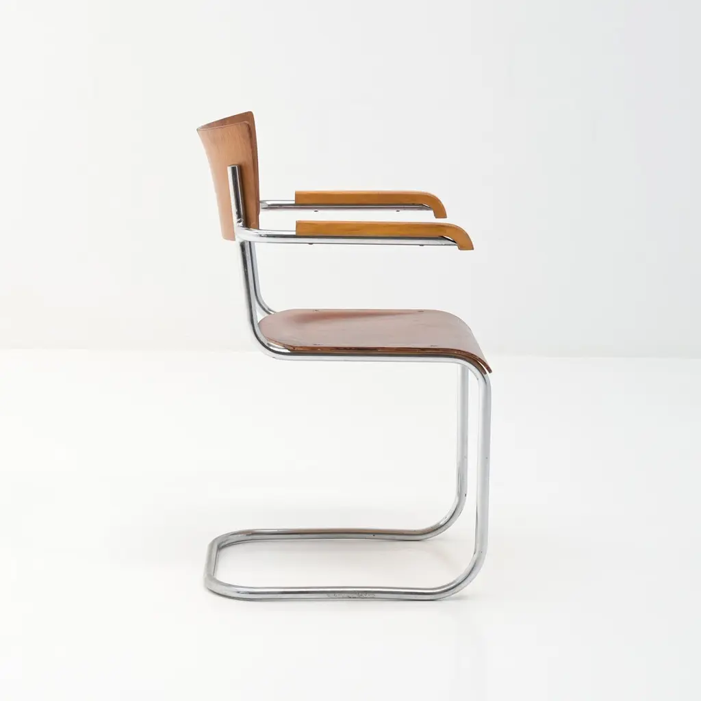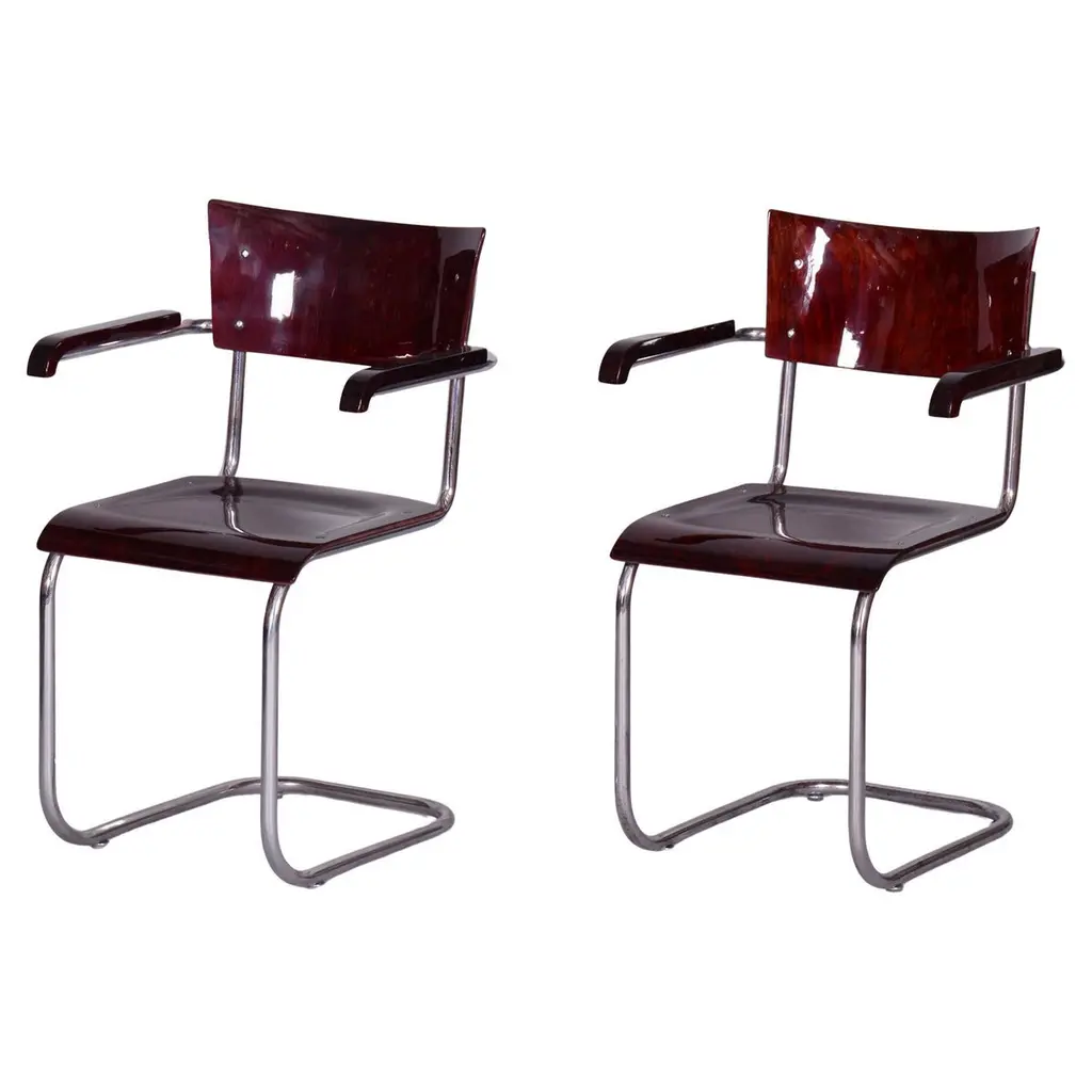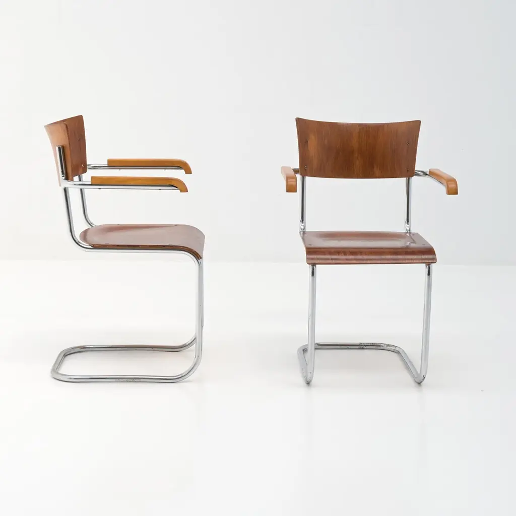 These tubular cantilever chairs can be dated in the early 1930s. Since Mart Stam invented the cantilever chair in 1926, a lot of designers experimented with this new design.This anonymous design is a great example of craftsmanship: the nice detailed chrome tubular metal base with special screws, the plywood seat and back rest, the armrests finished with solid wood.This pair modernist chairs is in very good condition.