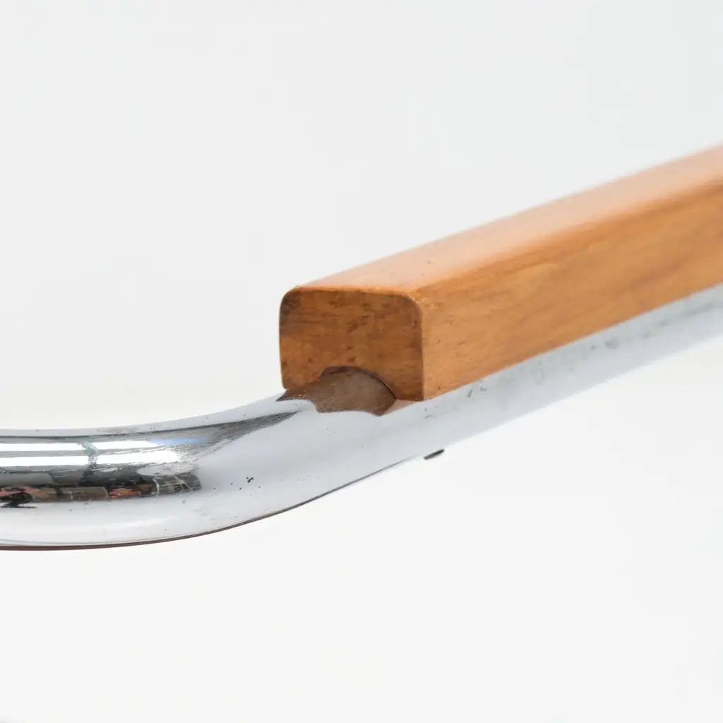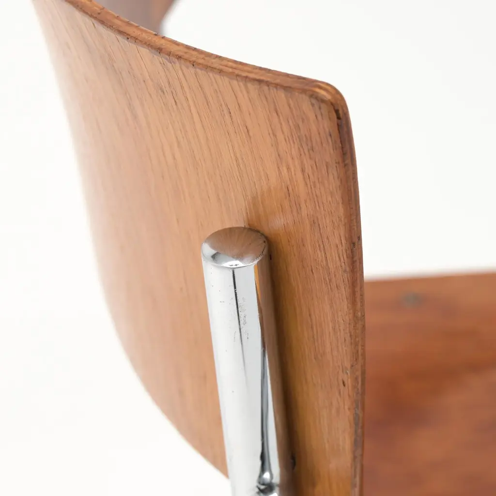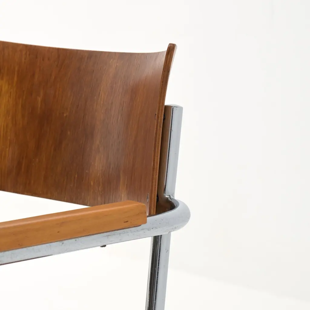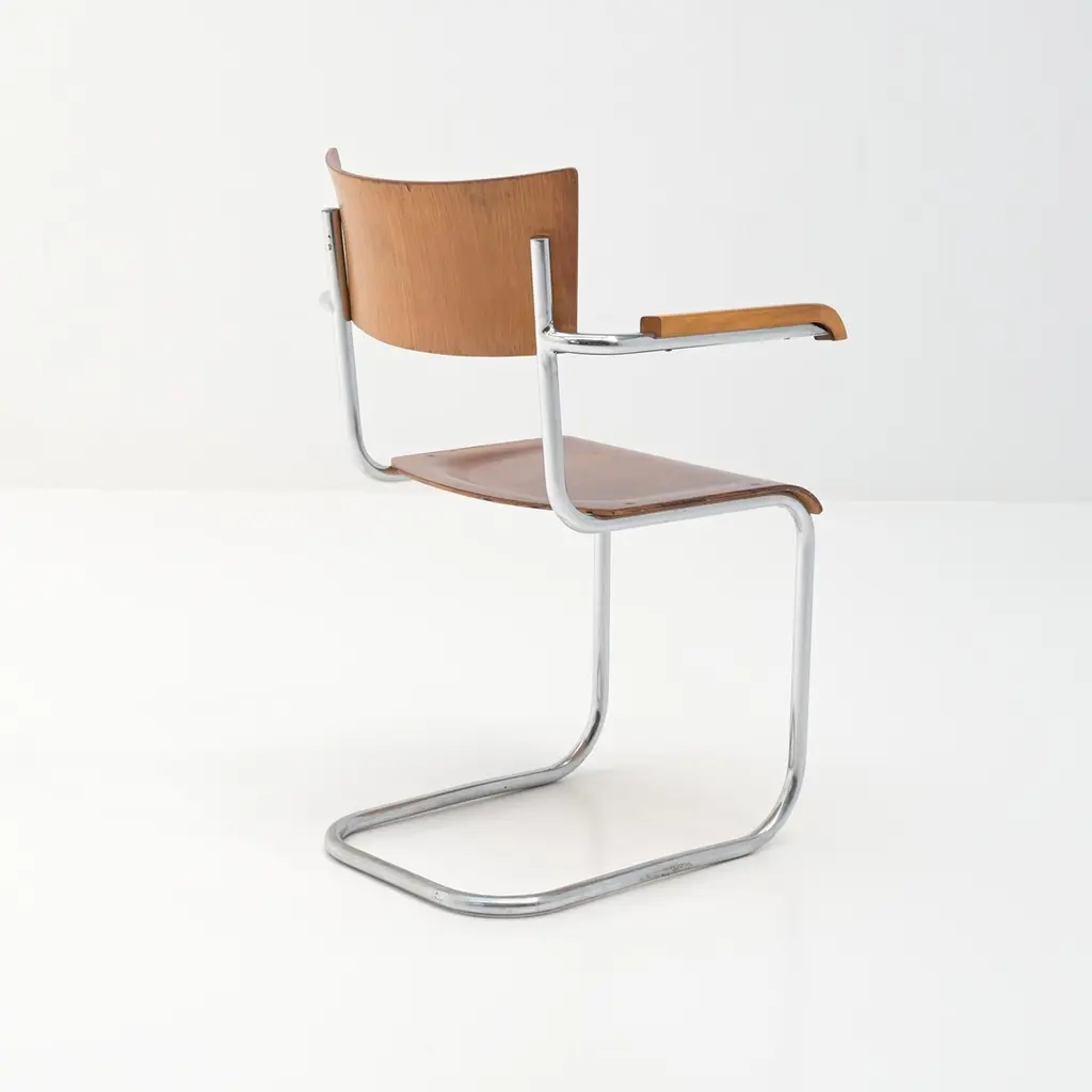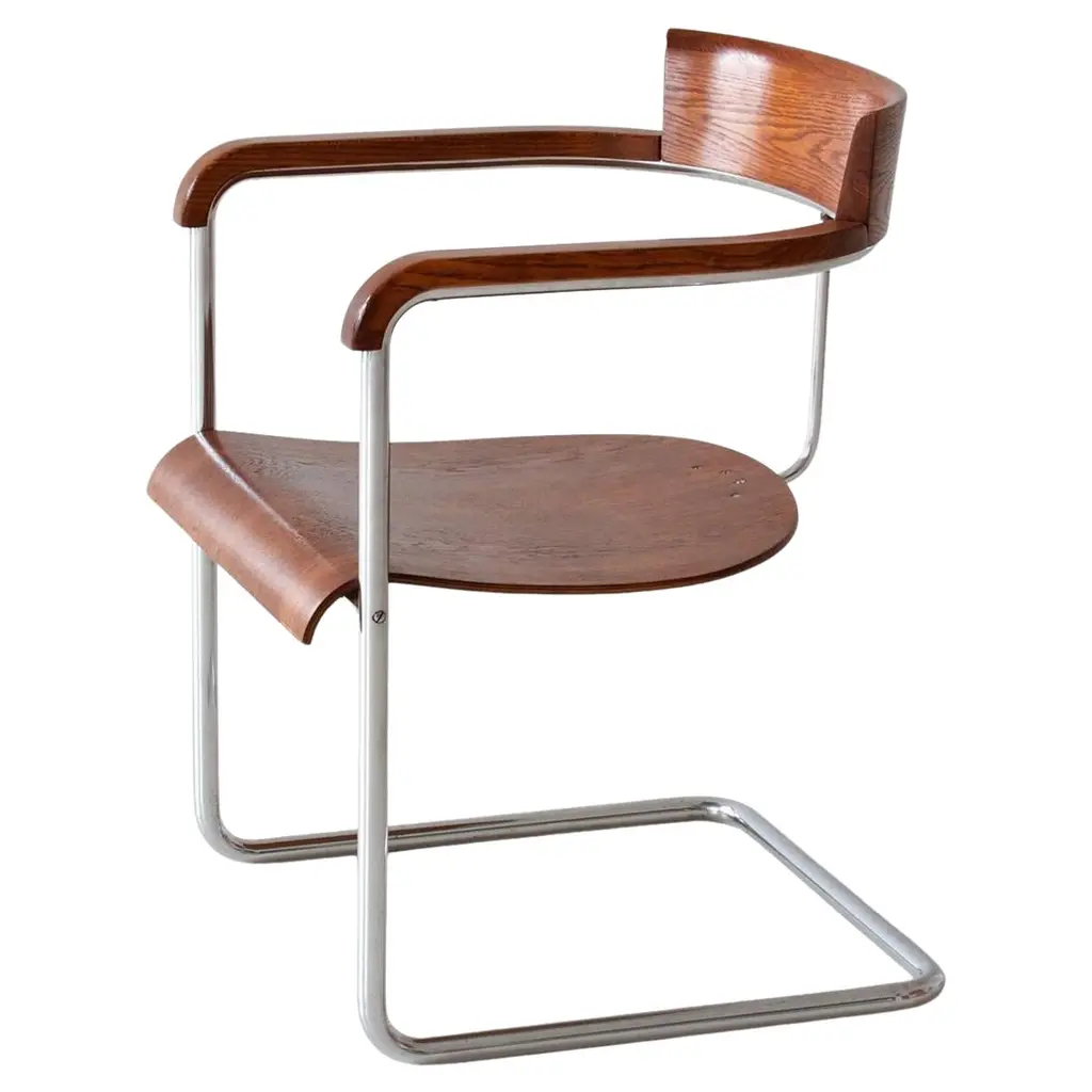 These tubular cantilever chairs can be dated in the early 1930s. Since Mart Stam invented the cantilever chair in 1926, a lot of designers experimented with this new design.This anonymous design is a great example of craftsmanship: the nice detailed chrome tubular metal base with special screws, the plywood seat and back rest, the armrests finished with solid wood.This pair modernist chairs is in very good condition.