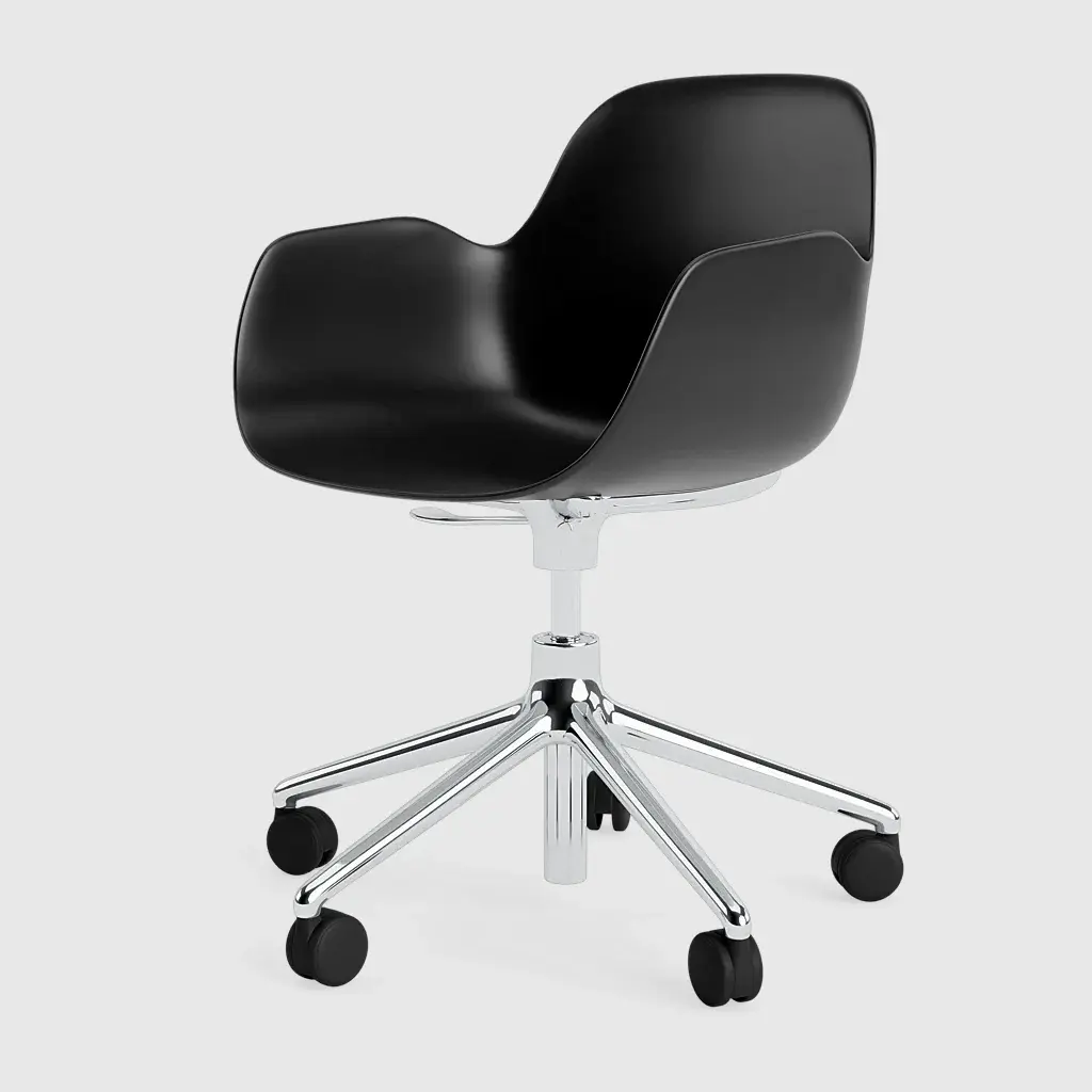 Offering wraparound support with sober open armrests and ergonomic seat/backrest crafted of black polyamide, this caster variant of the Modus basic model will allow to easily move from a side of the desk to the other, while briefly taking a look out of the window. From original dining spaces to offices, this mobile seat raised on a five-spoke base in die-cast aluminum will provide an enjoyable seating experience.