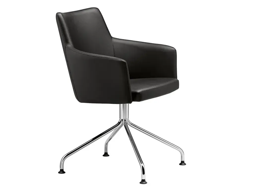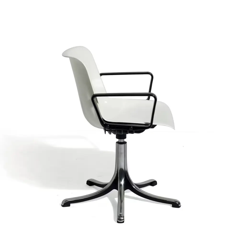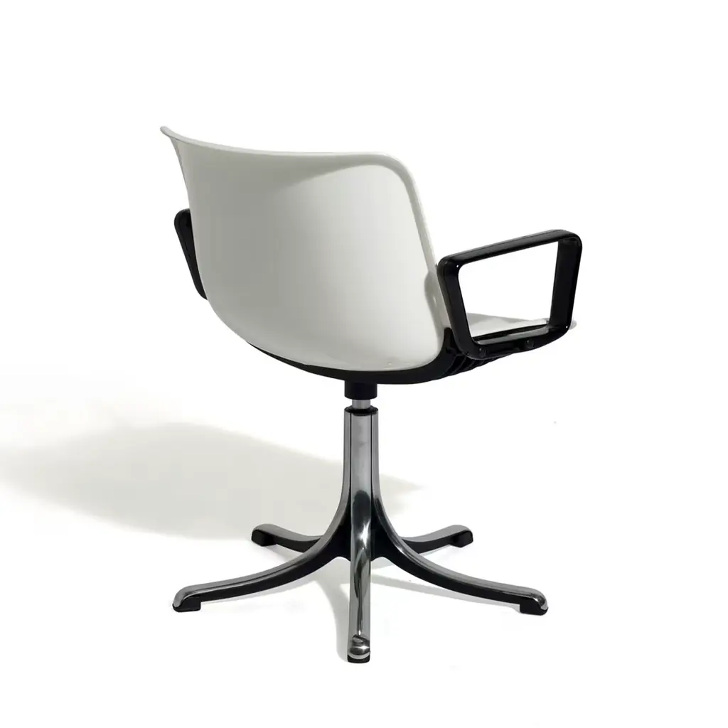 This variant from the basic Modus chair was conceived by Centro Progetti Tecno to meet the needs of users who favor arm support over padded components in a chair design. Ideal to complement any working or studying space, it is comprised of a five-spoke base in die-cast aluminum functioning as a sturdy support for the seat, whose white polyamide body is flanked by two squared black armrests.