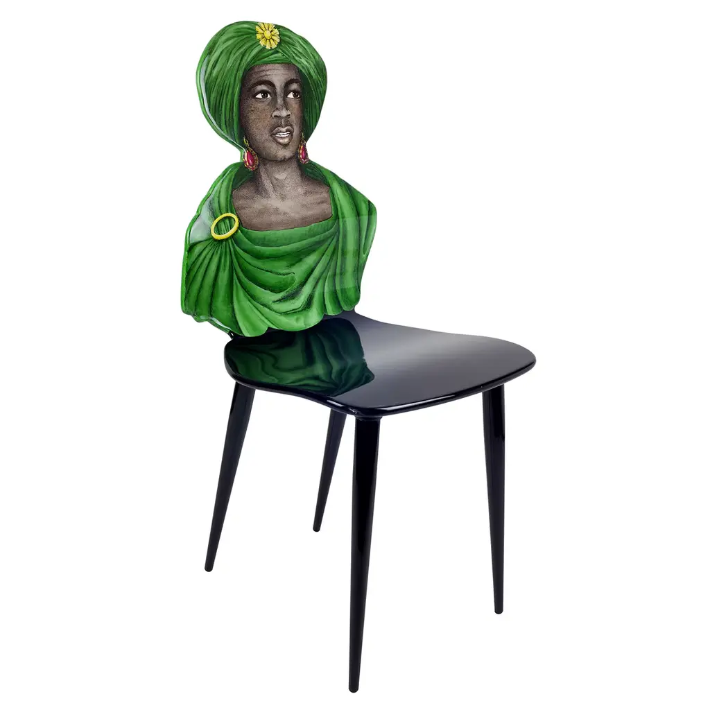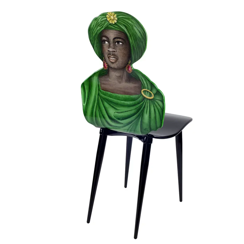 Hand-silkscreened, painted, and lacquered and with solid wood legs, this chair is an archetype of furniture and design that could not be missing from Fornasetti's repertoire. Created in the late 1950s, this decoration is a metaphysical tribute to the charm of exotic atmospheres. Any minor discrepancies between similar creations are the result of craftsmanship and attest to the uniqueness of each product.