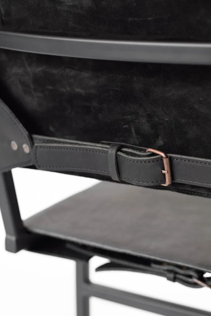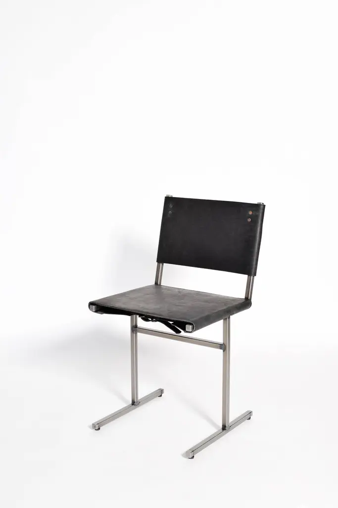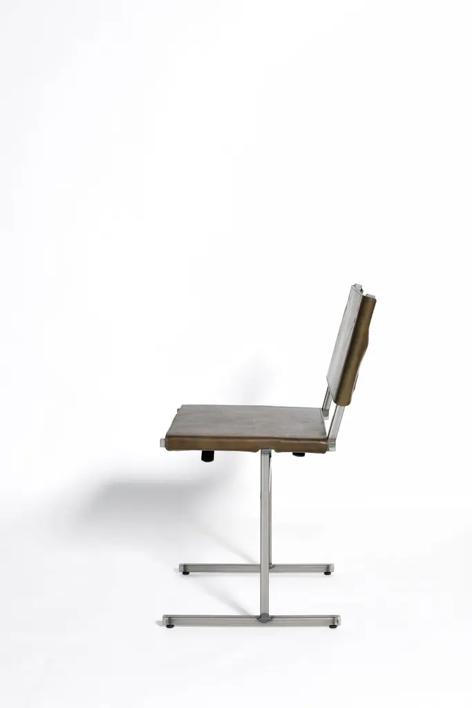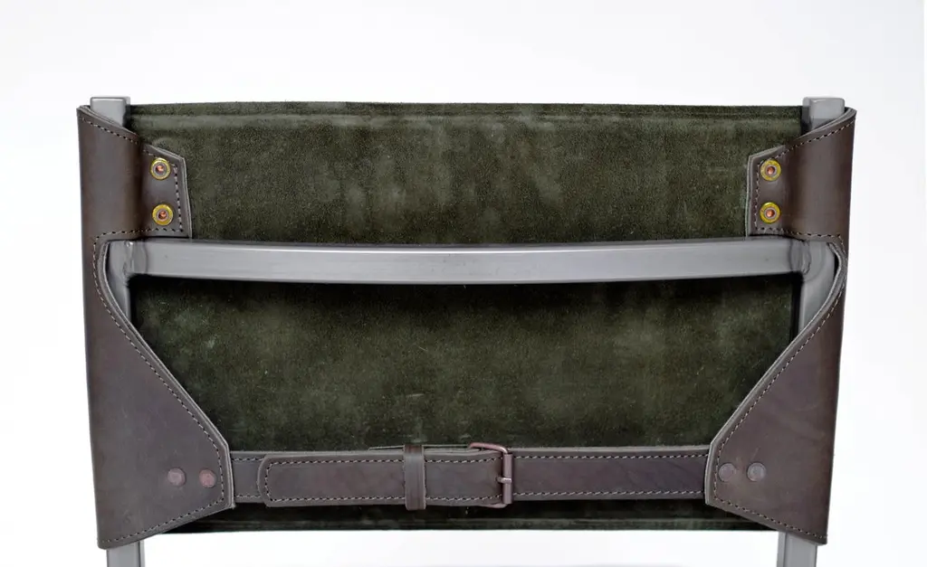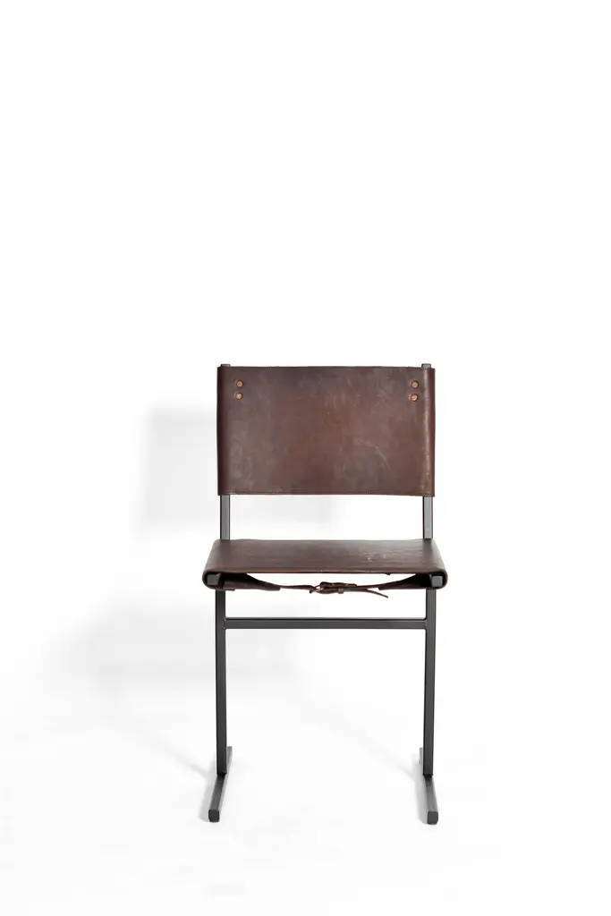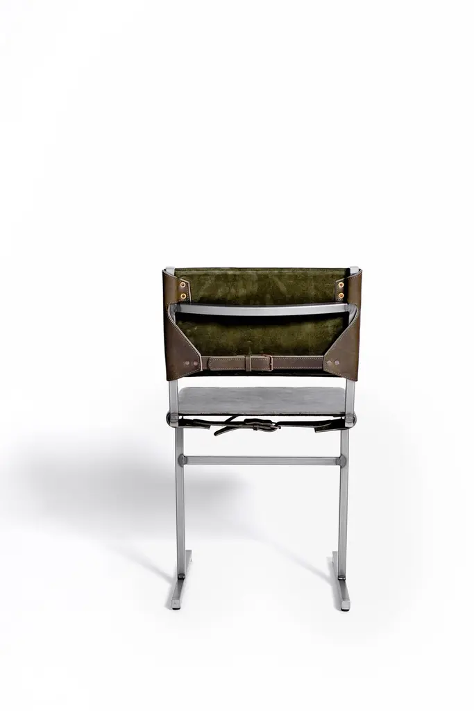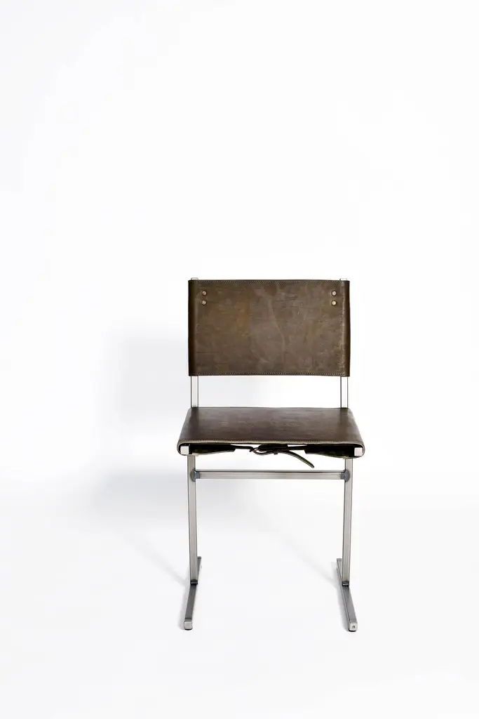 Moss green Memento chair, Jesse SandersonOriginal signed chair by Jesse SandersonMaterials: Leather, steelDimensions: W 43 x D 50 x H 80 cmSeating height 47 cmFrame finishes available in brass, bare steel, Matt black.Five lines and a circle, the human body can be as simple as the drawing of a five-year-old. Inspired by the same simplicity, the Memento was designed; A chair in its purest form with two leather rectangles on a steel lining. The leather is attached with straps and buckles, for switching the leather and the steel frame as you please. The thick saddle leather is ecologically tanned to accentuate the life that wore it as its skin. The scars and insect bites from the life in Transylvania are visible in the leather. By using the Memento chair, the leather becomes even more beautiful over time.Jesse Sanderson is a self-taught artist with a distinctive signature. He is fascinated by imperfection and allows natural forms to dictate his designs. Raw materials that are affected by weathering and aging tell a story about the origin and history which he aims emphasize wherever possible. By applying traditional craftsmanship and expressing his personal view, he designs intelligent yet simple-hearted objects.