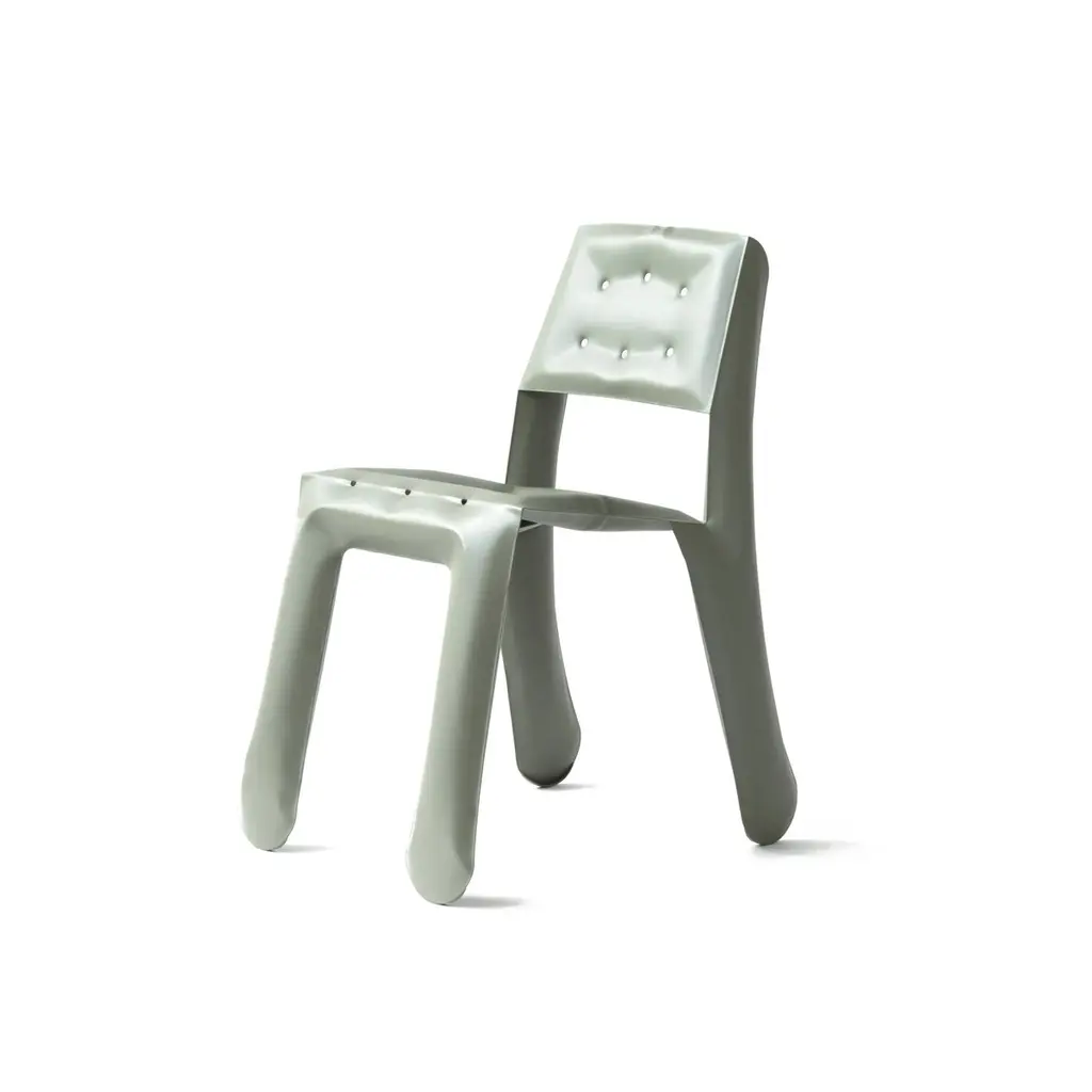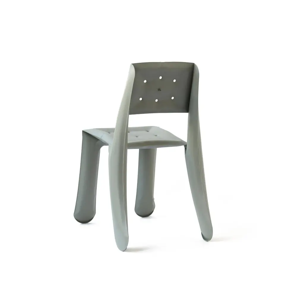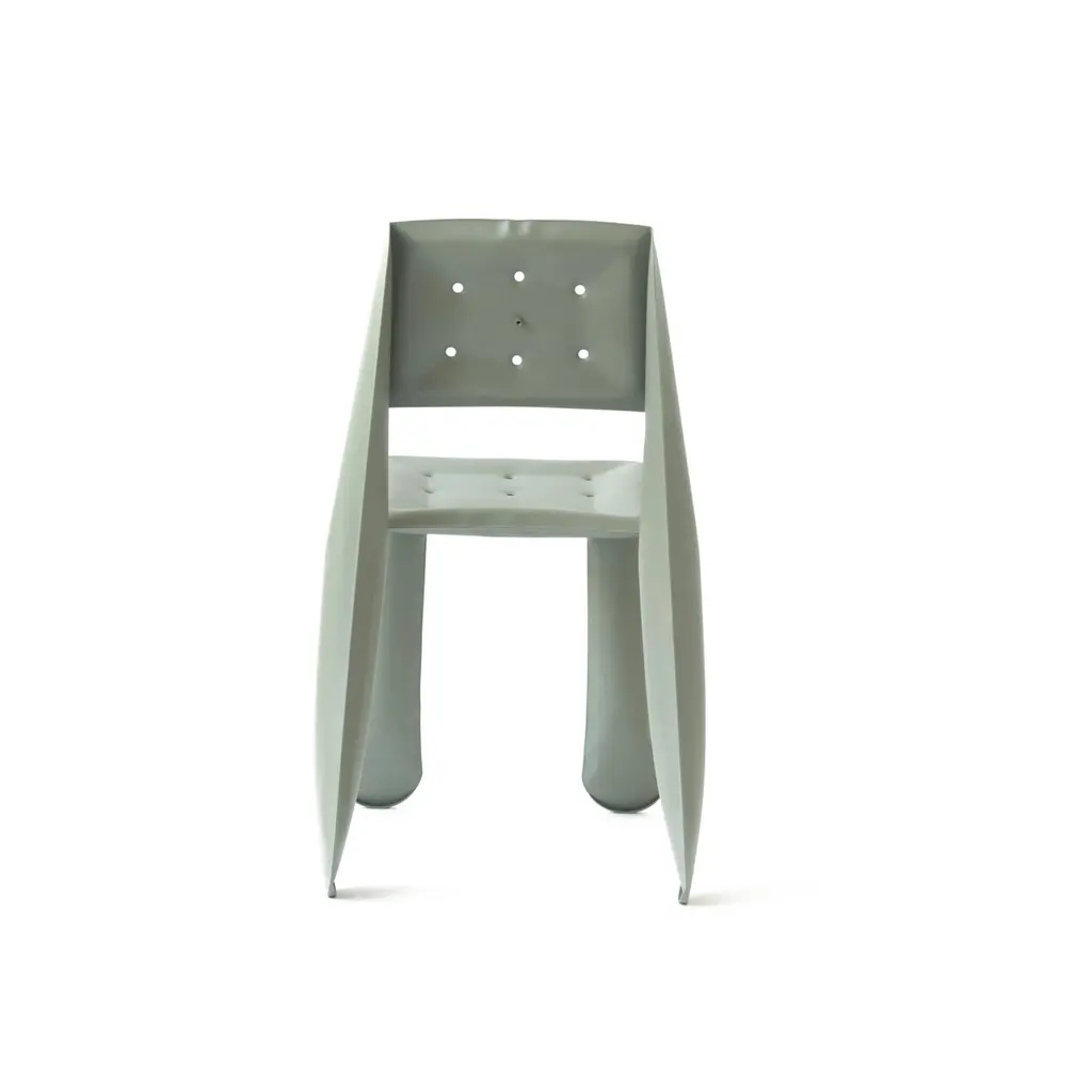 Moss Grey Aluminum Chippensteel 0.5 Sculptural Chair by ZietaDimensions: D 58 x W 46 x H 80 cm Material: Aluminum. Finish: Powder-coated. Matt finish. Available in colors: white matt, beige, black, blue-gray, graphite, moss-gray, and umbra-grey. Also available in Stainless Steel and Carbon Steel. Chippensteel 0.5 is a chair that delights the eye, mixes the senses, and plays with perception. Made of steel, aluminum or copper, its form refers to upholstered armchairs designed two centuries ago in England – it is a piece of furniture that combines ultra-modern technology with a nod to the rich history of design.Chippensteel 0.5 is a perfect example of combining craftsmanship with the original method of shaping steel called FiDU, developed and perfected by Oskar Zieta. The two-dimensional form is cut from metal sheets and welded in this process, finally getting transformed into a functional chair using compressed air. In the final stage, it goes through a finishing process performed by a designer and craftsman.The form of the chair was inspired by a classic model fashionable in the third quarter of the 18th century, named after the English carpenter Thomas Chippendale. The Chippensteel form deceives the eye with its inflated steel form, suggesting softness. Thanks to the use of evenly spaced holes, the artistically inflated steel imitates the irregularly arranged upholstery fabric on the armchairs. The combination of cold metal with an upholstery-like finish makes the Zieta Studio chair a unique work of art.Like other objects from the Zieta Studio offer, Chippensteel 0.5 is a mixture of craftsmanship with knowledge of the values ??of the material. The chair, made of polished steel and copper, thanks to its mirror surface, reflects light and the surroundings, focusing attention on itself and blending into space like a chameleon. On the other hand, the powder-coated finish emphasizes the chair’s irregular structure and gives it a more modern, industrial character.Chippensteel 0.5 is one of many objects designed by Oskar Zieta in the process of controlled deformation leading to the formation of unpredictable forms. As a result, the cool metal gains a “soft” appearance and becomes tame as a full-fledged interior material. Each Chippensteel chair contains the uniqueness of the material used: steel, copper, or aluminium.About Zieta: Zietas main goal is to deliver uniqueness and customization in design and construction while keeping the production, transport, and warehousing innovatively efficient.This is how they imagine the future world: Light, durable structures of customized applications produced on demand out of one-of-a-kind parts, yet efficiently.They use a computer-controlled production process. Customized pattern, customized form, customized function, one-of-a-kind product, and outstanding precision are what they deliver.You will find all of this philosophy reflected in the products. They research, they discover new possibilities, they play with forms and they deliver a beautiful, innovative, surprising outcome to people who love the design and who care about design development.They believe their work is a valuable contribution to the world of design not only by the unique beauty of the forms but most of all by opening ultra-innovative opportunities of forming and new paths for the world of the future.