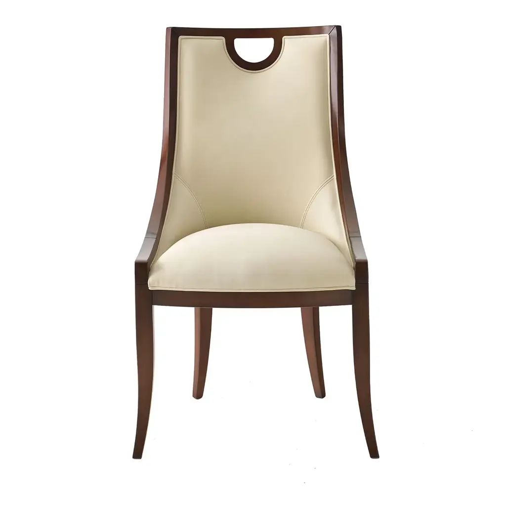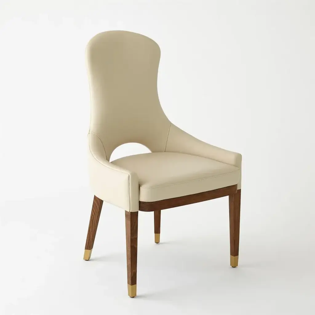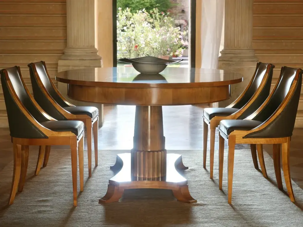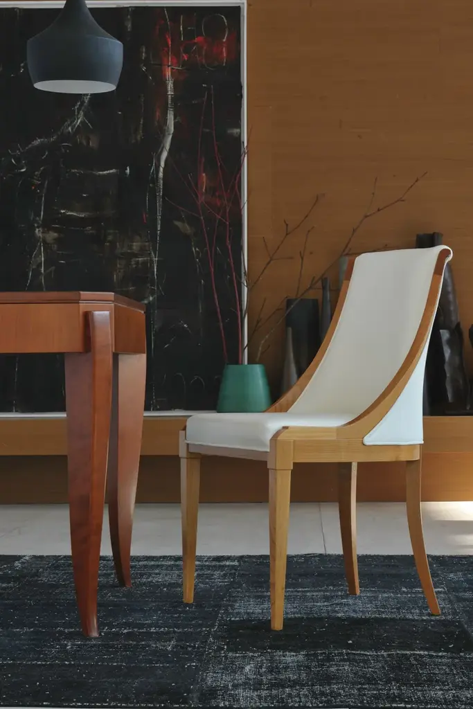 Chair made of cherry wood with shaped legs and curved upholstered backrest. Upholstered seat. Upon request with capitonnè padding.