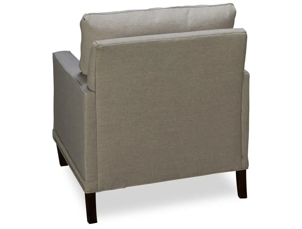 Clean, sharp lines define the My Style II Upholstered Chair from Rowe Furniture. Its light grey upholstery is framed in welt trim, with nailheads at the hem. Sleek track arms and tapered square legs complete the look of this traditional-style chair that will add comfort and elegance to any living space. Custom-order fabrics are available.