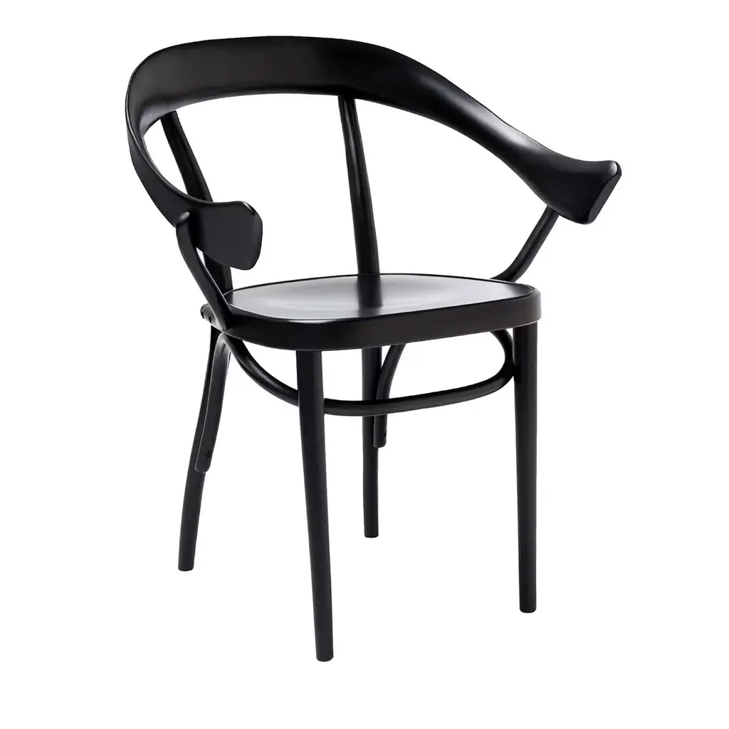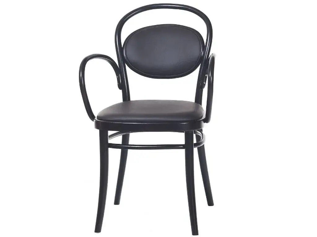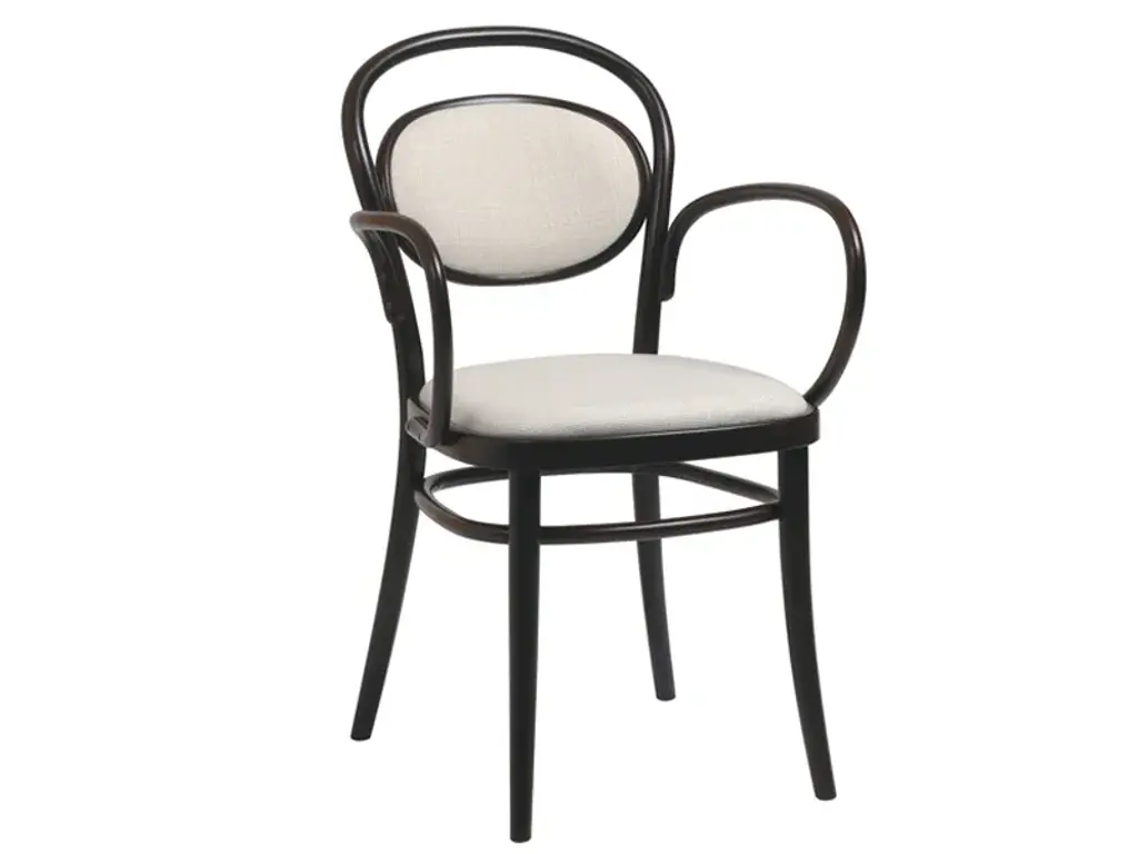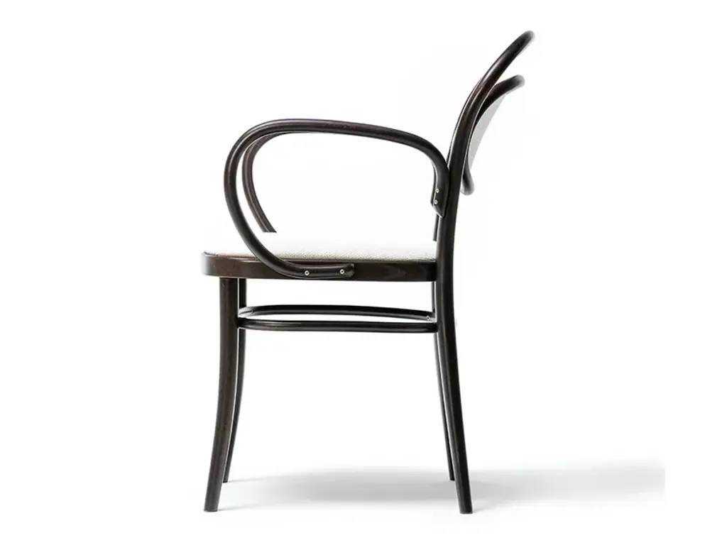 N° 20 is a wooden chair with armrests of Bentwood Collection by Ton A.S. This manually bent armchair has a seat and a backrest upholstered or covered with cane. This highlights the traditional shapes and gives a very fine and elegant impression.