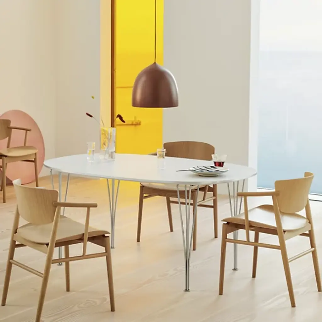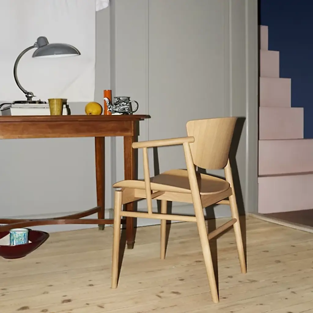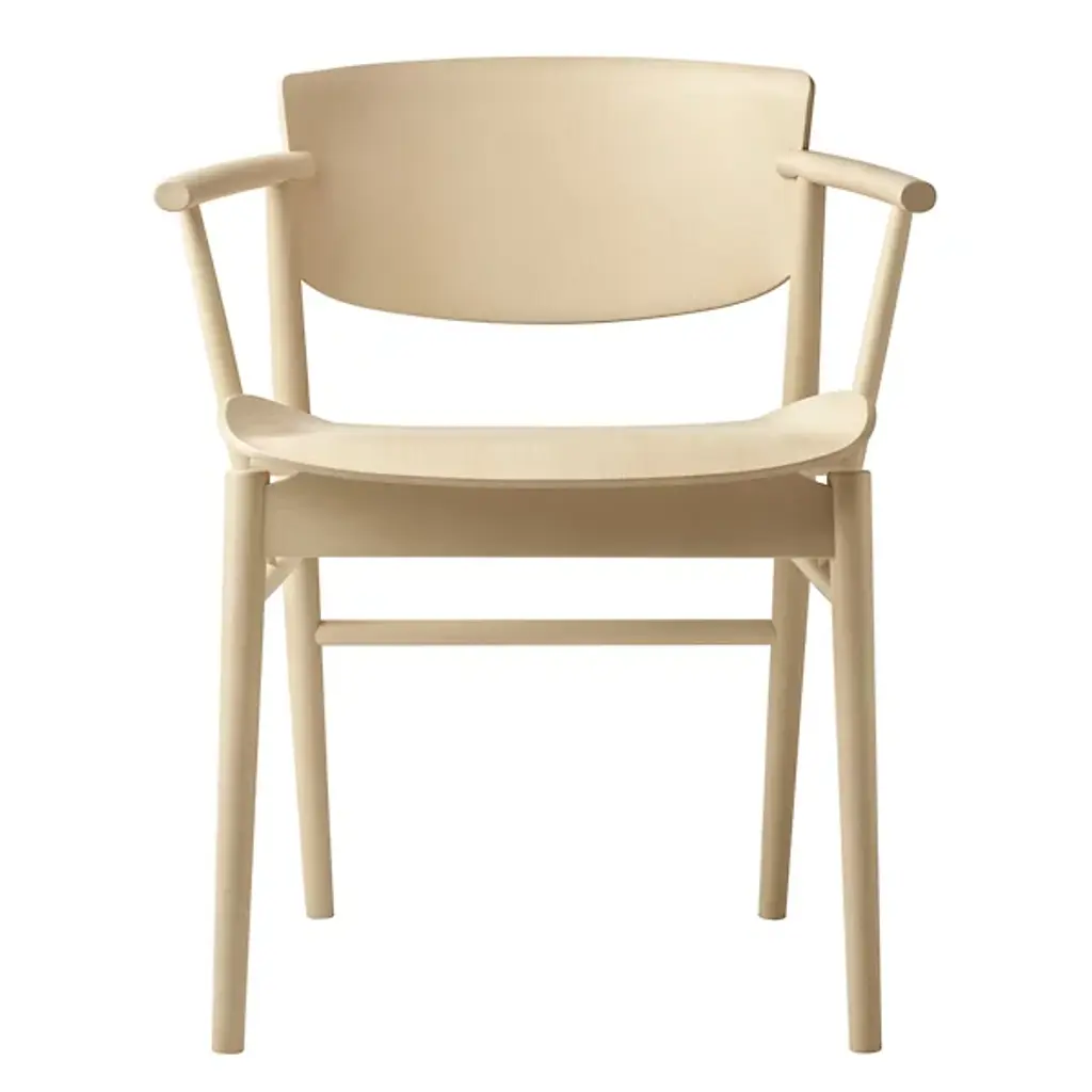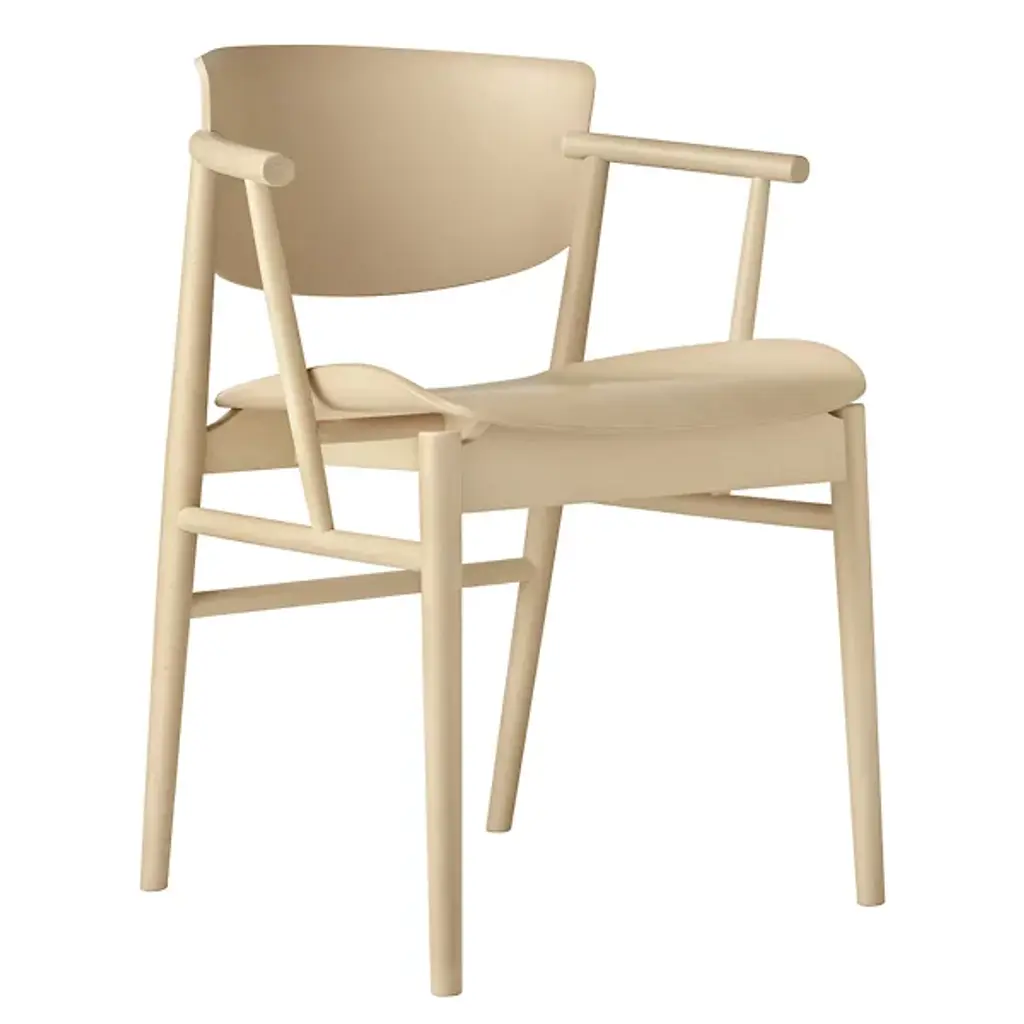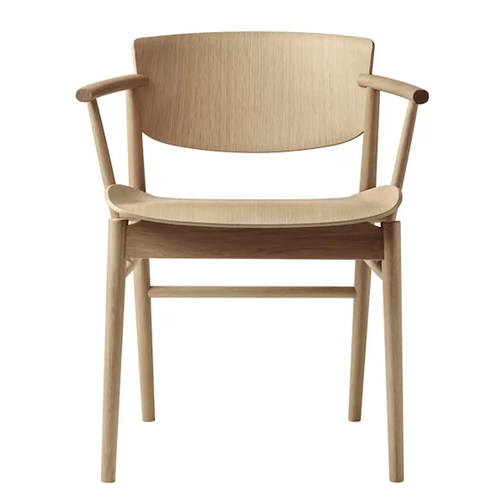 The N01 Chair from Fritz Hansen was designed by Nendo / Oki Sato. It beautifully combines Japanese Minimalism and Scandinavian design. It features a seat with elegant, upward curves. The contoured motif continues in the look of its seatback and cylindrical arms. It’s composed of solid wood for a natural touch, and it is Greenguard-Certified, adhering to strict low chemical emissions standards. It features 9 layers of pressure-molded veneer.