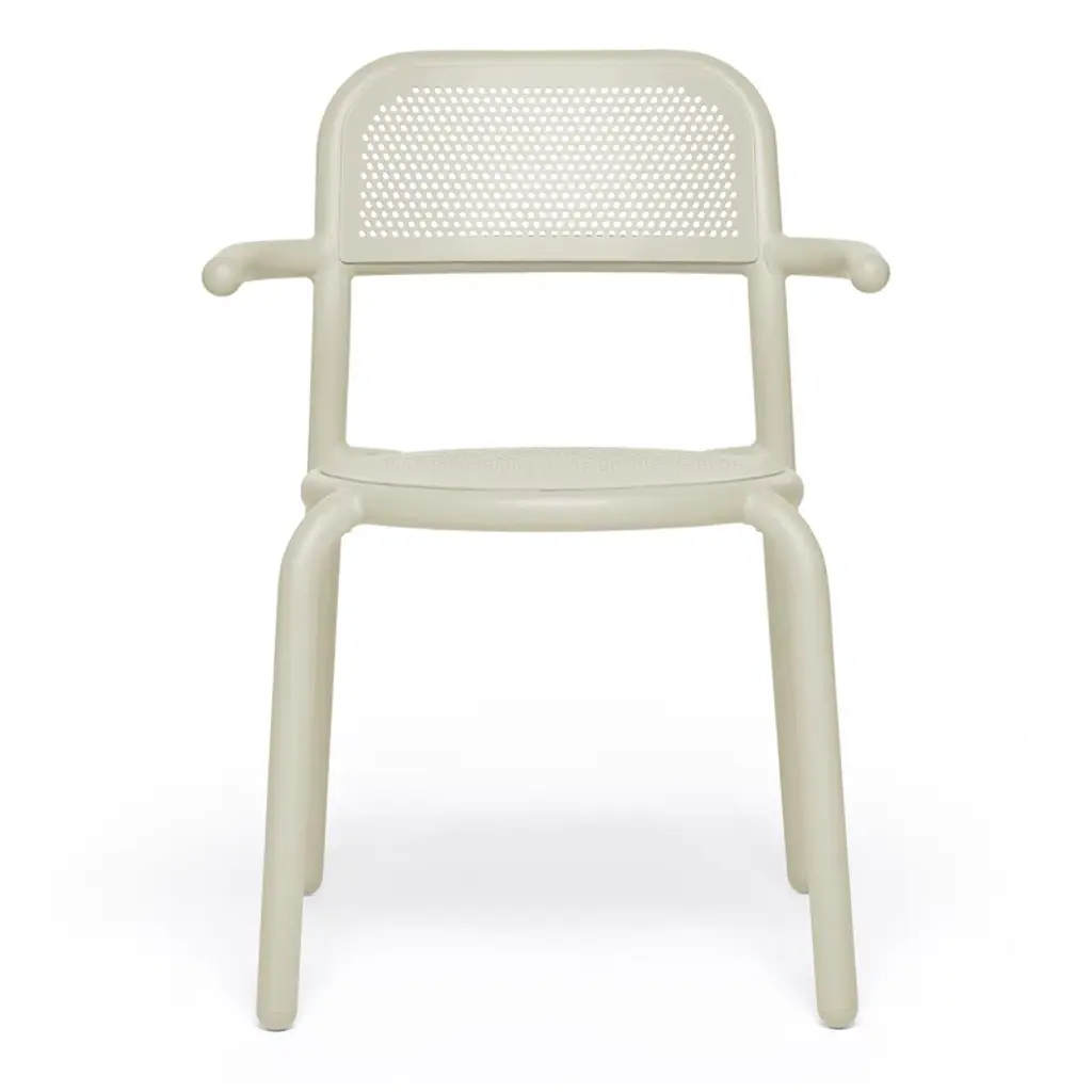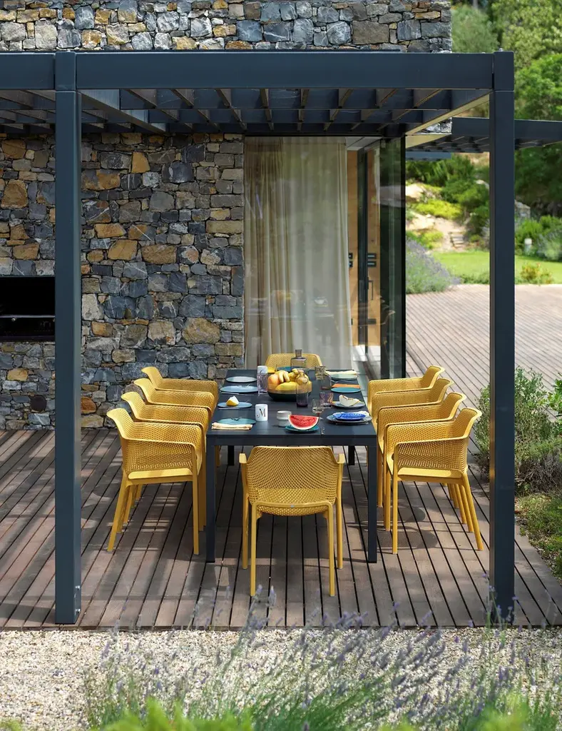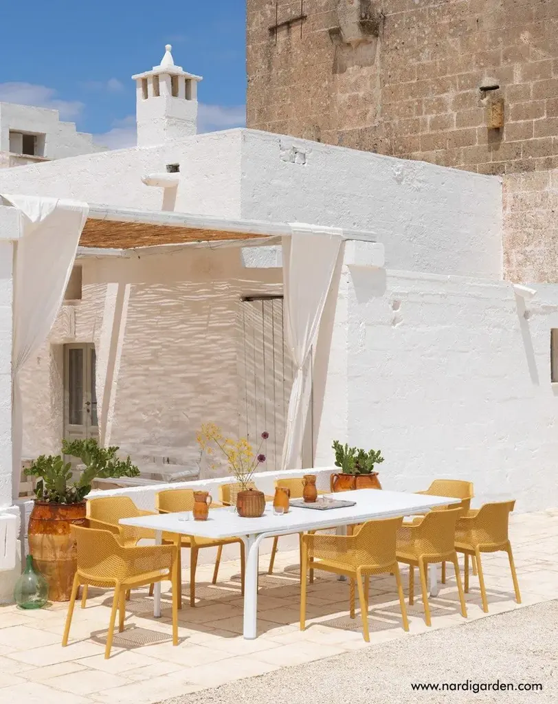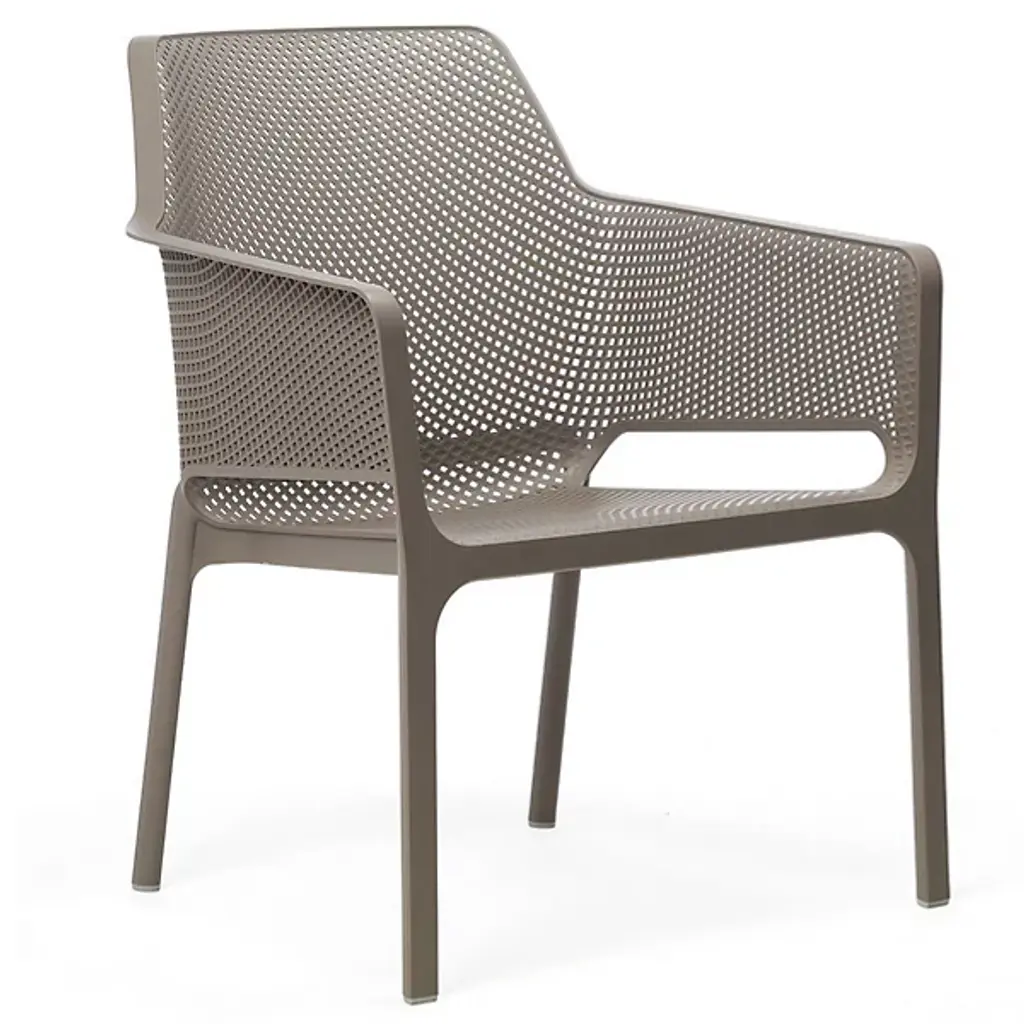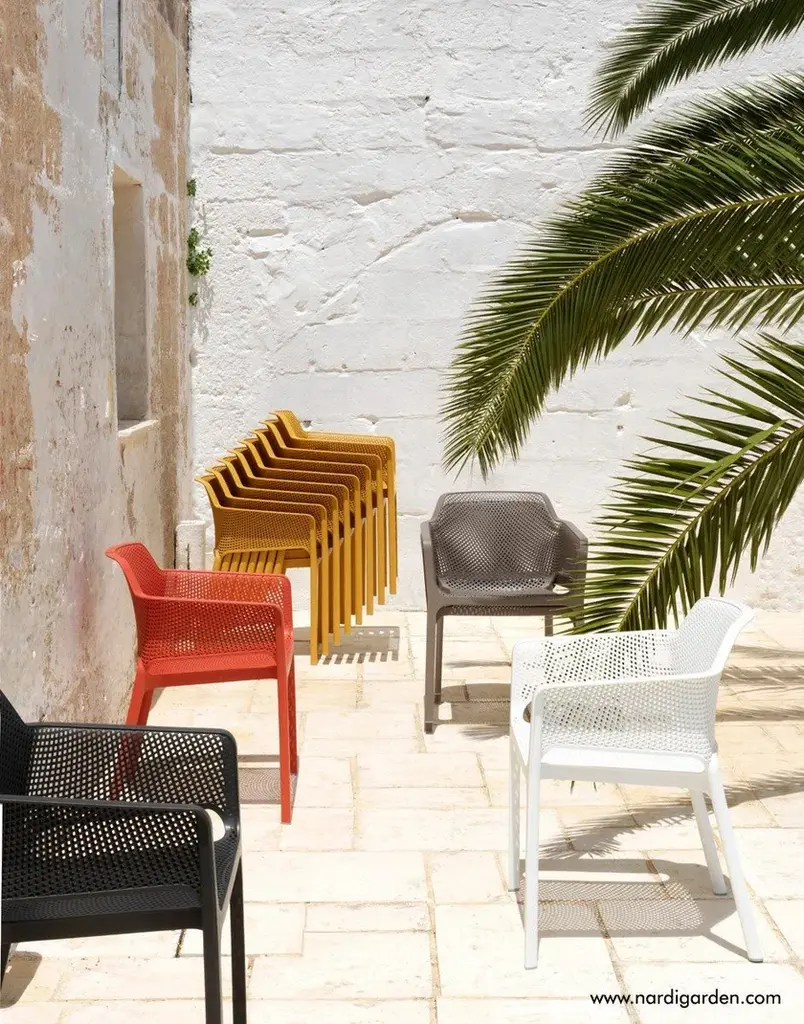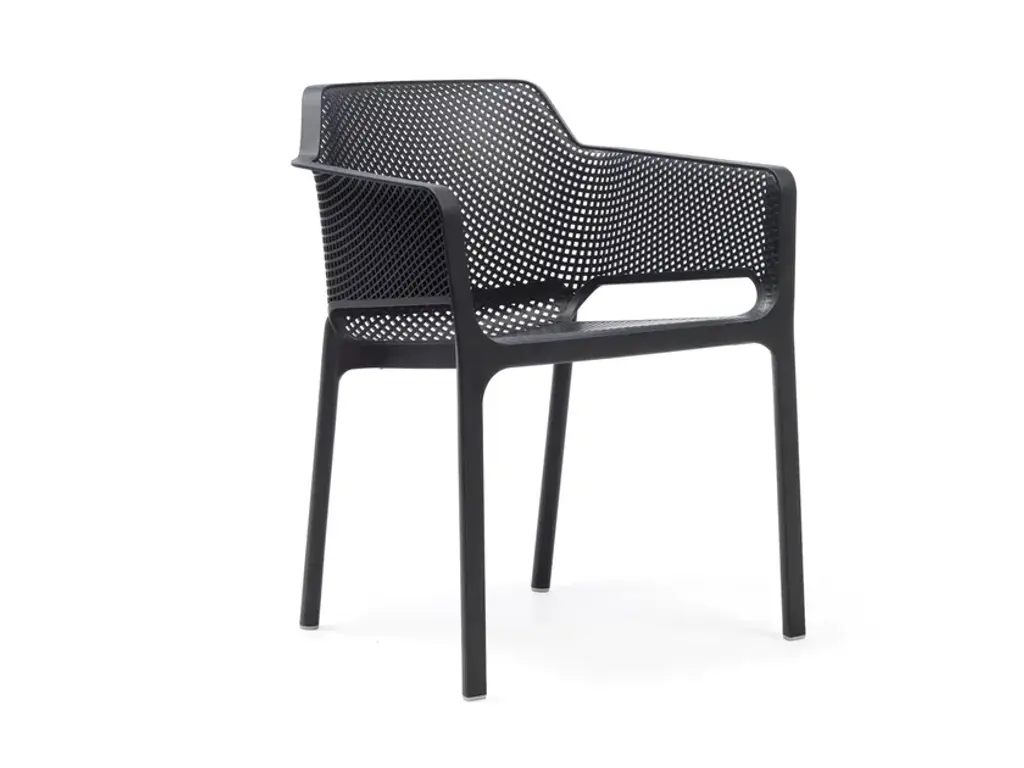 Embracing, refined and contemporary, Net is an outdoor single-body armchair in UV-treated fiber-glass resin, with non-slip feet, easily stackable and 100% recyclable. Featuring a radial pattern of square perforations, uniformly distributed over the surface of the seat and backrest, Net is available in six colours (white, anthracite, dove grey, coral, mustard and willow green). Ideal for both outdoor and indoor use, the Net armchair is available in the following dimensions: H. 80 cm, W. 60.5 cm and D. 58.5 cm, seat H. 46.5 cm.