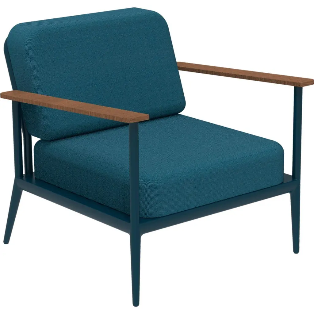 Nature navy longue chair by MOWEEDimensions: D85 x W83 x H81 cm (seat height 42 cm).Material: Aluminum, upholstery and Iroko Wood.Weight: 20 kg.Also available in different colors and finishes.An unmistakable collection for its beauty and robustness. A tribute to the Valencian manufacturing tradition as a challenge to innovation, making it sustainable and durable. A fresher version, Nature. It presents touches of natural and sustainable wood, which gives warmth and comfort, and makes it a unique collection.Möwee is part of the work, effort and commitment of Gaviota, a leading company in the outdoor sector. It was set up as an independent venture to broaden horizons in the outdoor furniture world, with its own distinctive character and way of doing things. Freshness, simplicity, quality and design are at the heart of its DNA.