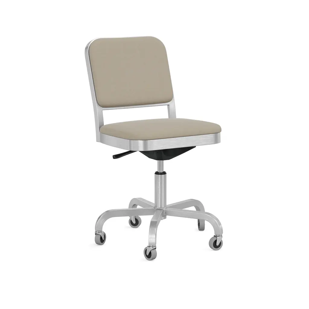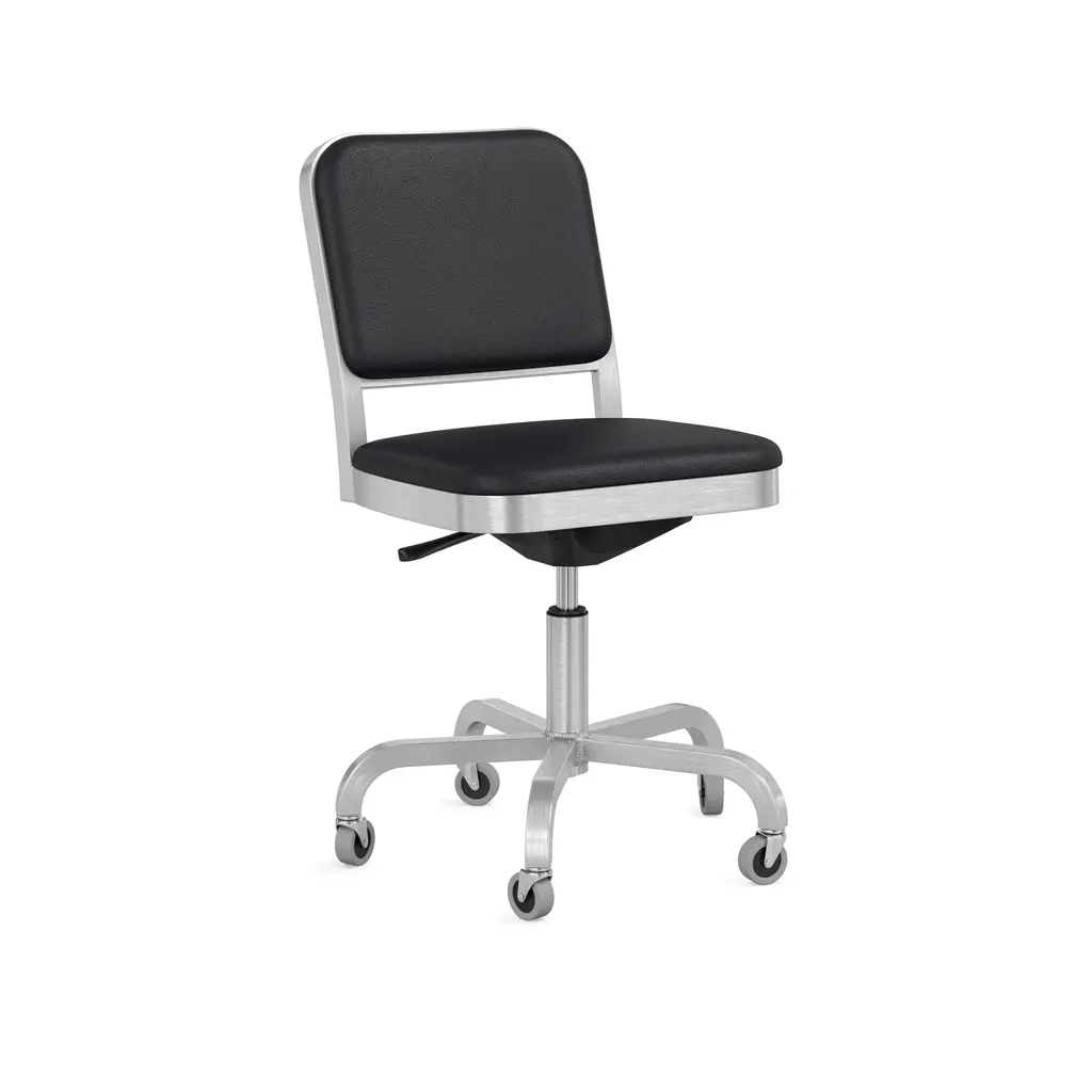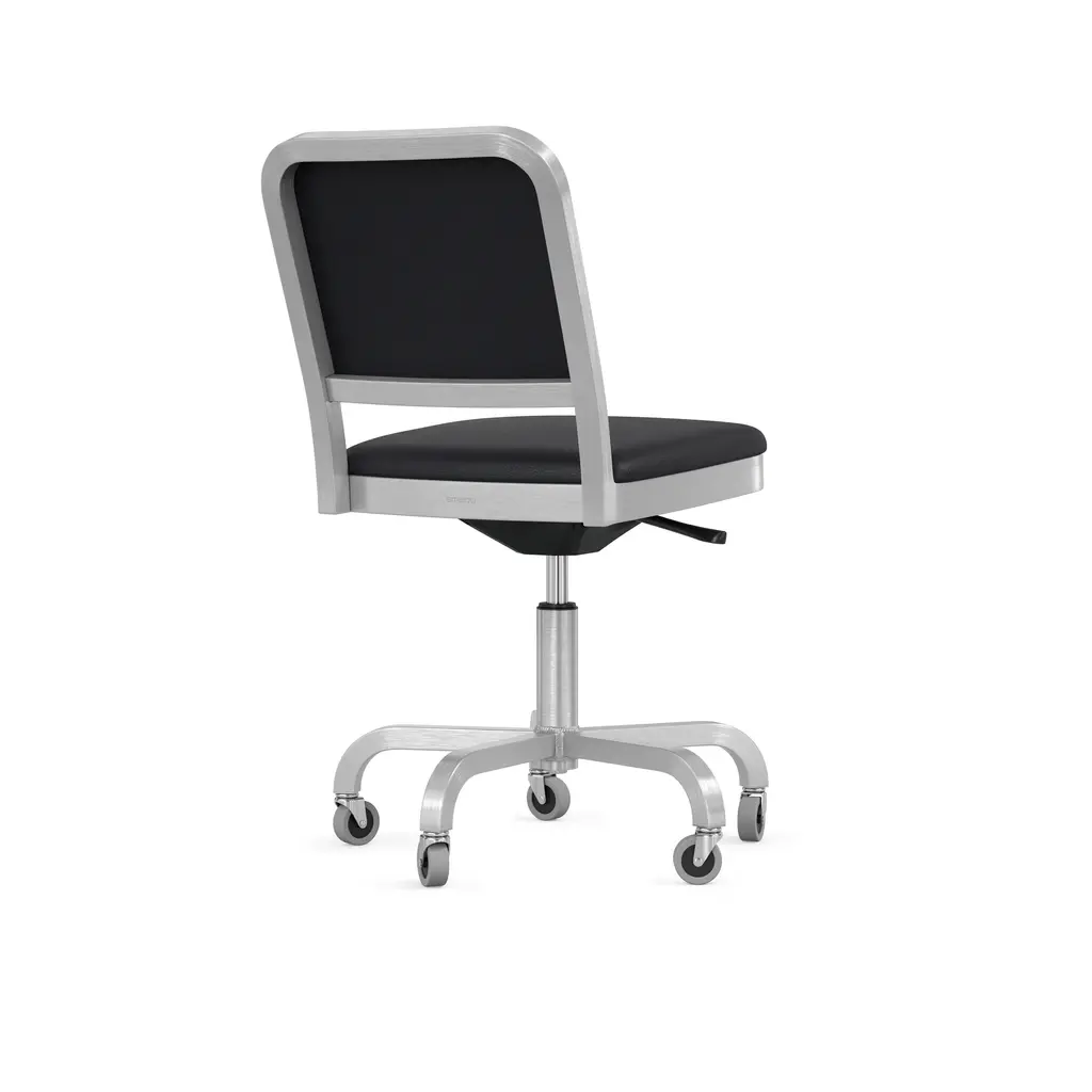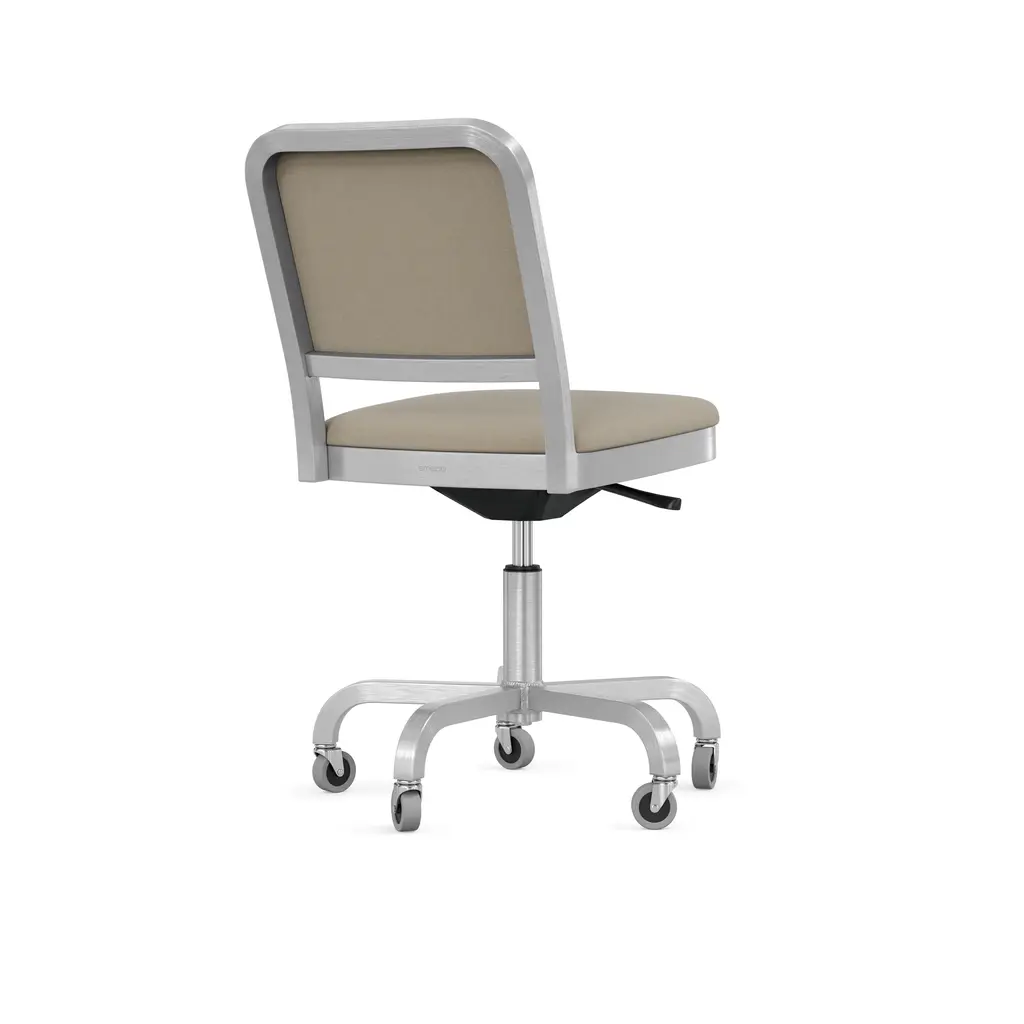 Navy Officer by Jasper Morrison, 2019 Jasper Morrison has given Emeco’s classic upholstered Navy Officer Collection a fresh, light and modern update with a range of upholstery options. The 80% recycled aluminum frame is available in Emeco's signature hand brushed finish or a black powder coat. Emeco's inhouse powder coat colors are available for all Navy Officer chair frames. We also offer COM/COL upholstery. Please contact us for details. The collection also features a side chair, a swivel chair and a swivel armchair.