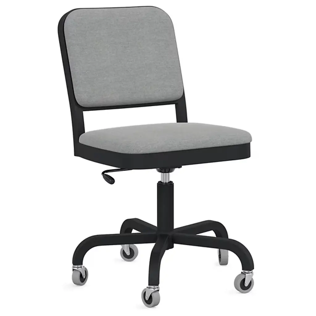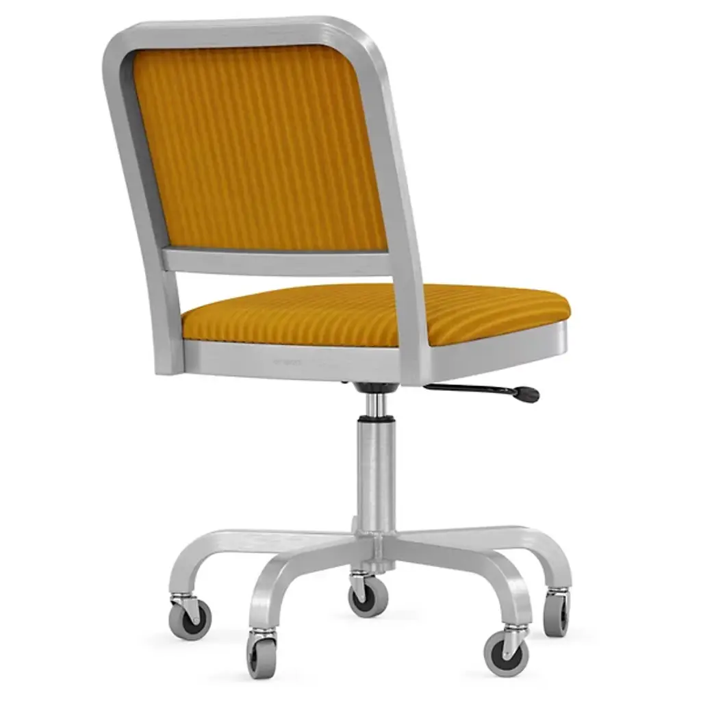 A time-honored silhouette dressed for the modern sensibility. The Navy Officer Swivel Chair from Emeco gets one rolling with comfortable curves and sumptuous materials. Jasper Morrison brings a ‘super normal’ design approach that sees shape and character balanced with tension and expression. Here, caster wheels glide across the floor while mounted to an elegant star base. An understated handle under the seat lets one adjust the height. The metal shell on top makes a statement with a classic Navy chair silhouette, one defined by soft, supportive fabric in contrasting colors.