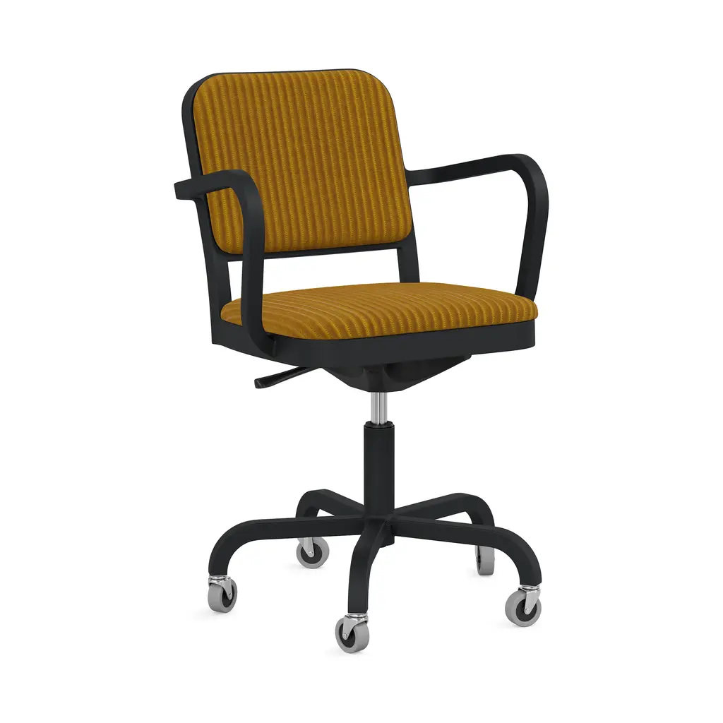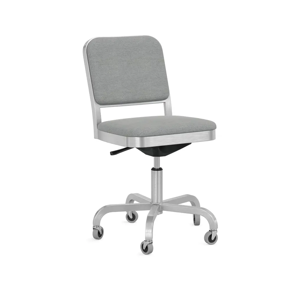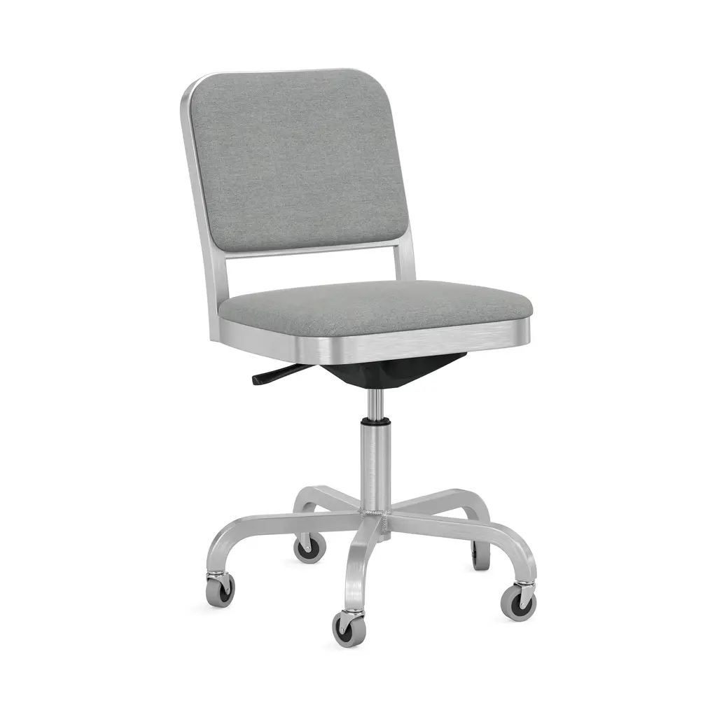 A time-honored silhouette dressed for the modern sensibility. The Navy Officer Swivel Chair from Emeco gets one rolling with comfortable curves and sumptuous materials. Jasper Morrison brings a ‘super normal’ design approach that sees shape and character balanced with tension and expression. Here, caster wheels glide across the floor while mounted to an elegant star base. An understated handle under the seat lets one adjust the height. The metal shell on top makes a statement with a classic Navy chair silhouette, one defined by soft, supportive fabric in contrasting colors.