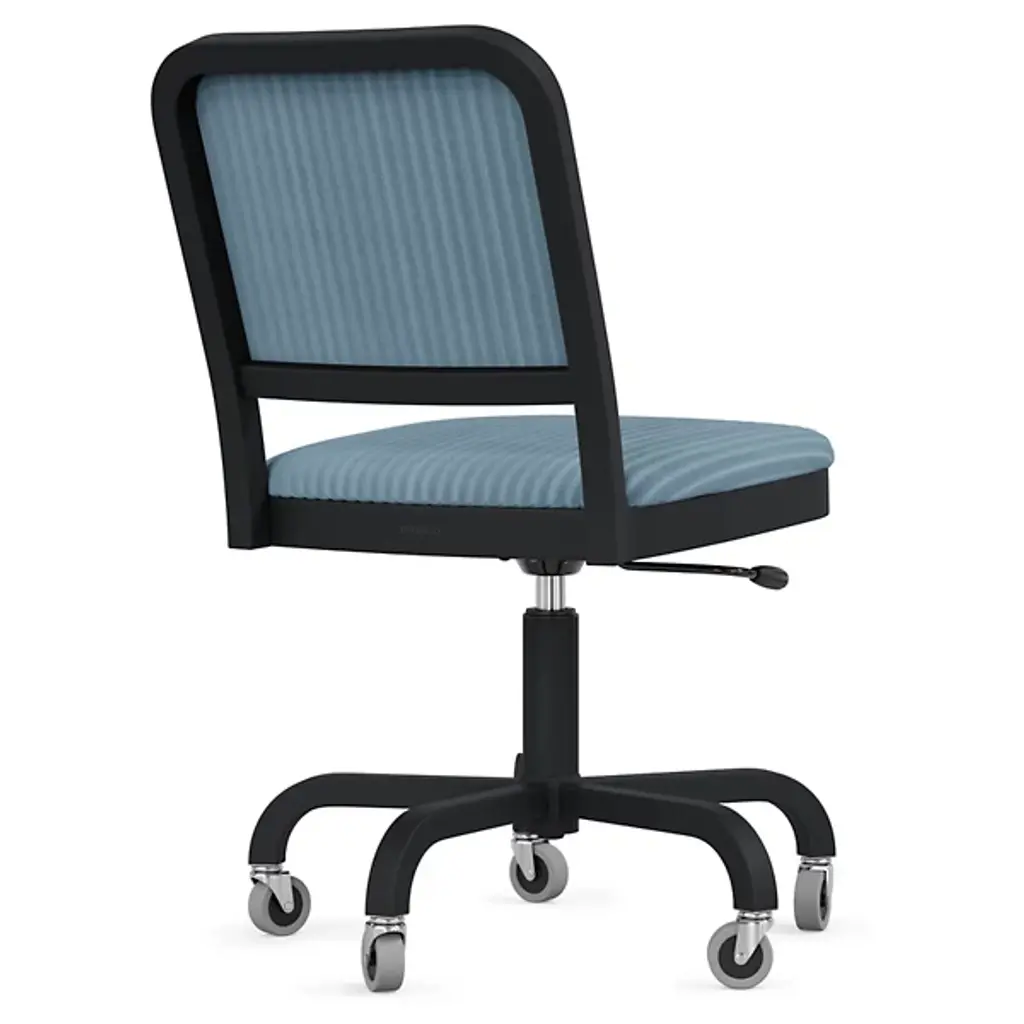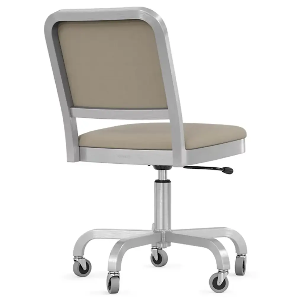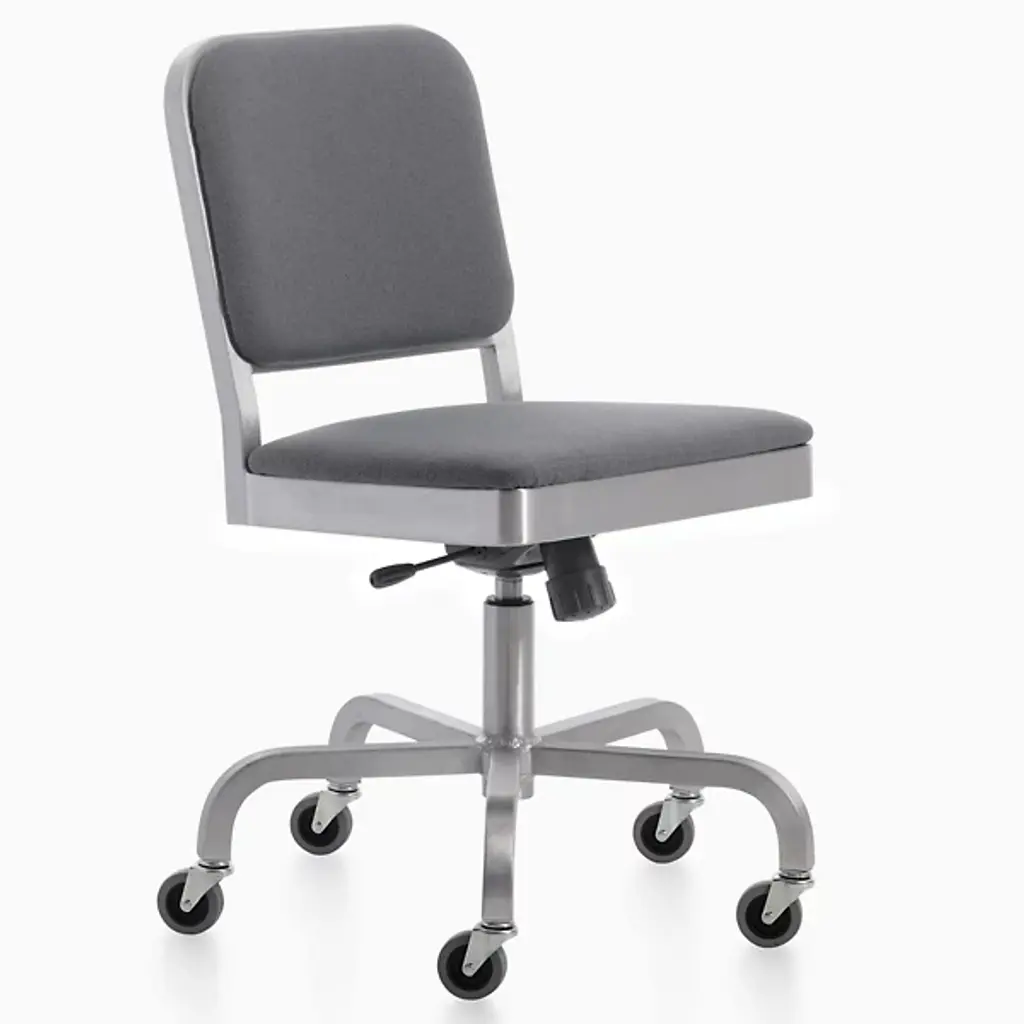 A time-honored silhouette dressed for the modern sensibility. The Navy Officer Swivel Chair from Emeco gets one rolling with comfortable curves and sumptuous materials. Jasper Morrison brings a ‘super normal’ design approach that sees shape and character balanced with tension and expression. Here, caster wheels glide across the floor while mounted to an elegant star base. An understated handle under the seat lets one adjust the height. The metal shell on top makes a statement with a classic Navy chair silhouette, one defined by soft, supportive fabric in contrasting colors.