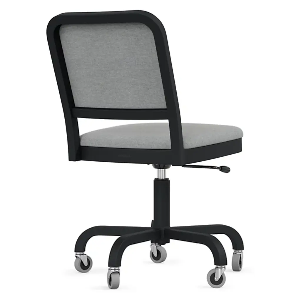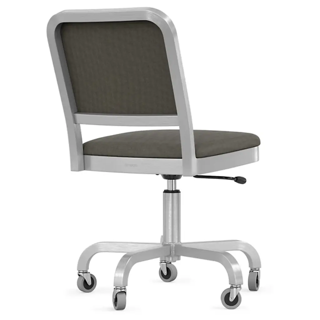 A time-honored silhouette dressed for the modern sensibility. The Navy Officer Swivel Chair from Emeco gets one rolling with comfortable curves and sumptuous materials. Jasper Morrison brings a ‘super normal’ design approach that sees shape and character balanced with tension and expression. Here, caster wheels glide across the floor while mounted to an elegant star base. An understated handle under the seat lets one adjust the height. The metal shell on top makes a statement with a classic Navy chair silhouette, one defined by soft, supportive fabric in contrasting colors.