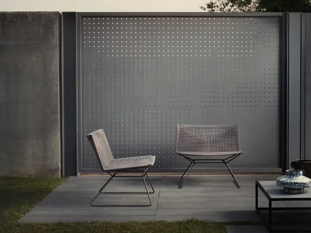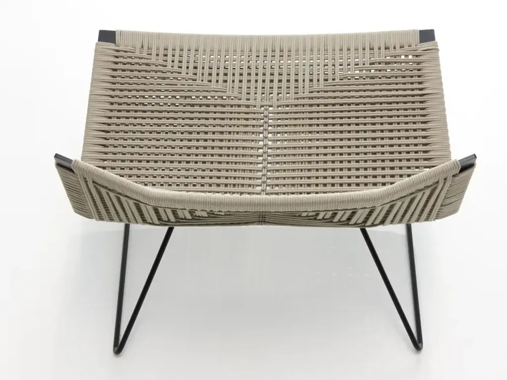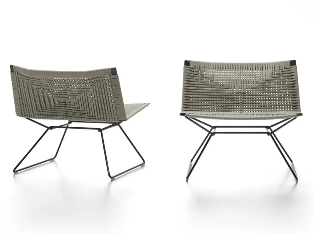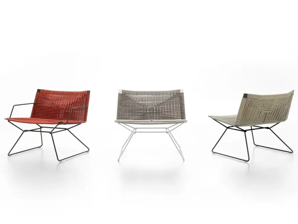 The seats are made with an original and exclusive weave. Handmade product.An extension of the Neil collection, with an inclusive image, NEIL TWIST makes functionality and versatility its primary features.Due to its iconic nature it is a perfect accessory in both indoor and outdoor environments, able of conferring character, thanks also to its bright colours, to modern gardens and terraces.StructureLoad-bearing seating structure made of steel, woven withhigh-tenacity polyester cord, solution-dyed, guaranteeing high resistance to atmospheric agents, light, and abrasions, with stretch resistance. Sled-base made of steel rod.The frames are powder painted with a specific treatment for outdoor use, in the following colours:• matt painted white X053;• painted matt lead black X138.Available in the low version, with or without armrests.Variants and typesCord weave available in the following colours:• Matt ecru (col. 23);• Matt anthracite grey (col. 03);• Glossy English green (col. 17);• Glossy orange (col. 11).*the pairing of cords/structure is fixed. See the next page.All Neil Twist models have a contrasting stitching detail, in glossy anthracite colour.AccessoriesProtective rain cover in light gray color, specifically for outdoor products, waterproof, made of 100% polyester, outside with acrylic coating, inside with acrylic resin coating.Its characteristics are emphasised by its fully fungicidal Teflon finish.Each rain cover comes with a closable slip cover, so that it can be folded and kept correctly when not in use.Use and maintenance of the protective rain coverFor correct washing, use a delicate neutral soap and water, and rinse thoroughly after washing, using only water.After cleaning, allow the fabric to dry correctly before folding it and putting it away, to avoid it getting mouldy.NB Avoid the fabric coming into direct contact with weed killers, fertilisers, and chlorine, as these may stain the protective rain cover indelibly.