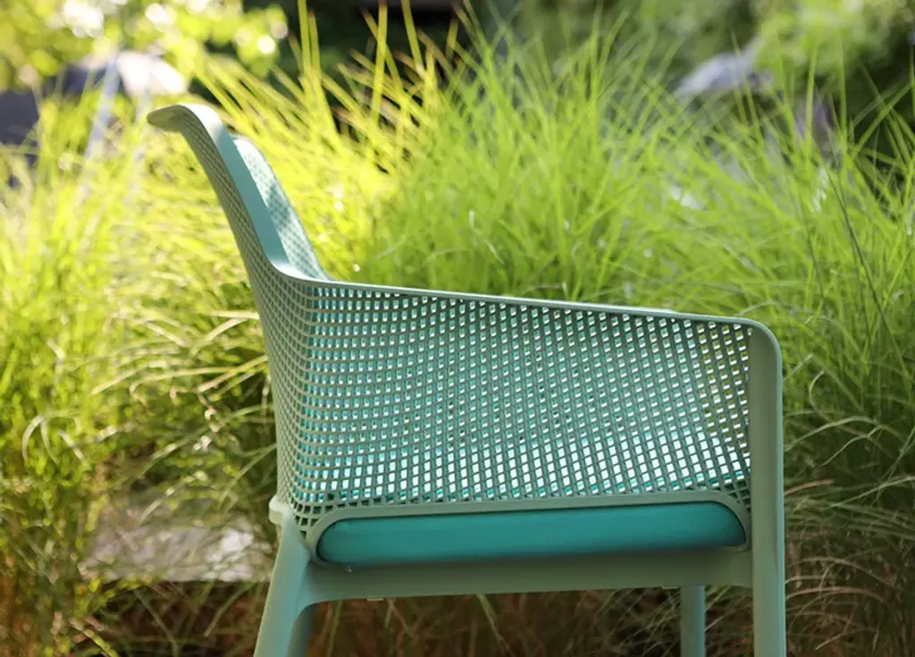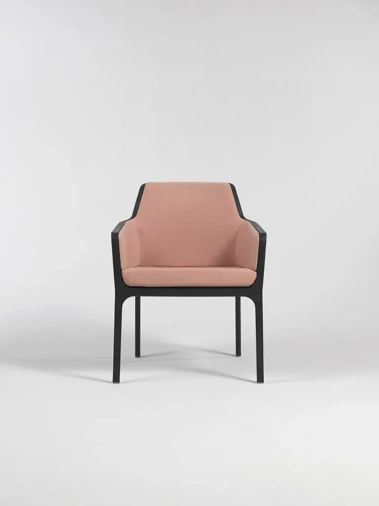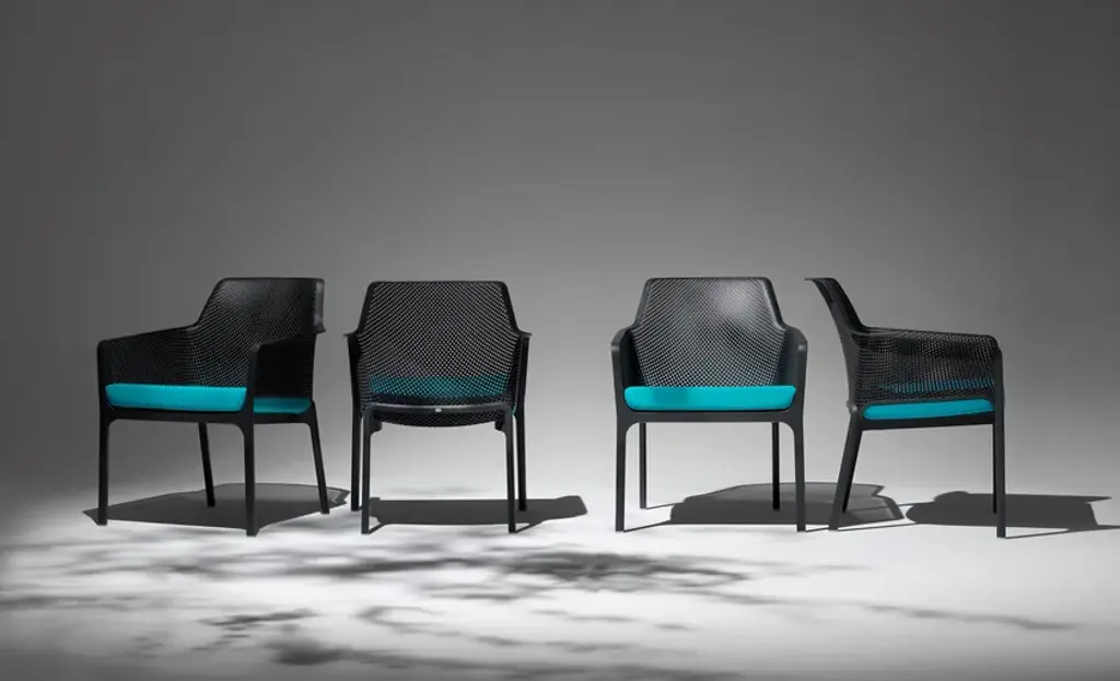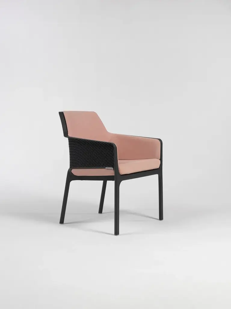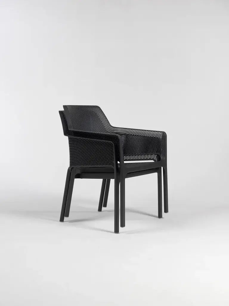 Net Relax is an armchair with a frame made of fiberglass resin, accessorised with a soft fabric cushion in delicately contrasting colours. Ideal for outdoor and indoor use.It has collected the following prizes and awards: ADI Design Index, Red Dot Design Award and Good Design Award.New and relaxing, the single-body of Net Relax is decorated with a square perforated pattern evenly distributed over the entire surface of the armchair, the result of a complex 3D shaping and milling process.The chair is matt, slightly rounded and very pleasant to the touch. The perimeter is edged with a band with a rectangular section that facilitates constant support of the arms, seamlessly, delineating the legs of the chair.This resin armchair, perfect for outdoor and indoor use, is available in an interesting colour range that enhances the light/dark effects of the fabrics chosen for the padded elements.Technical detailsStackable single-body armchair. UV-treated mass-coloured polypropylene fiberglass. Matt finish. Supplied with non-slip feet. Cushion available to order. Recyclable resin.