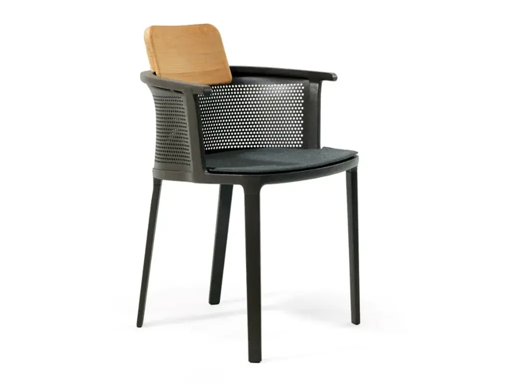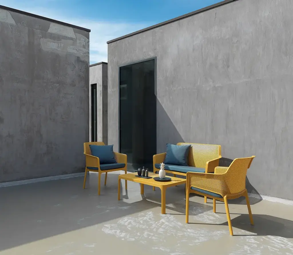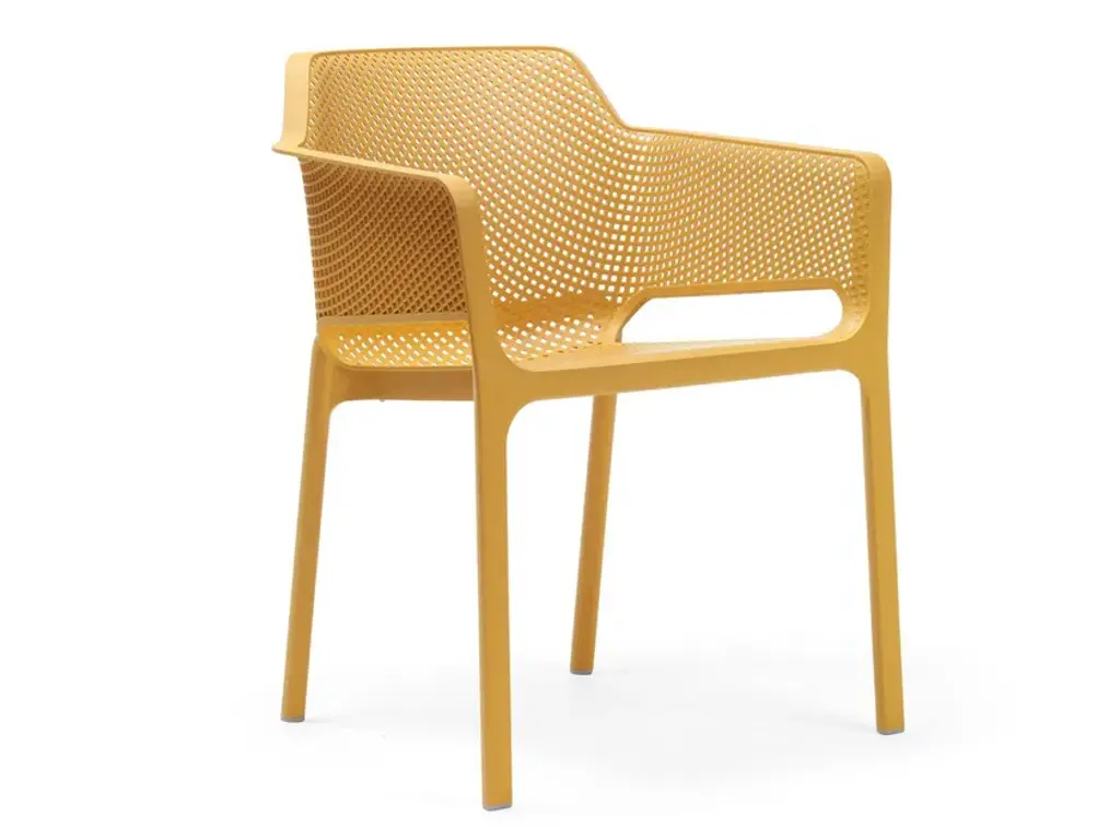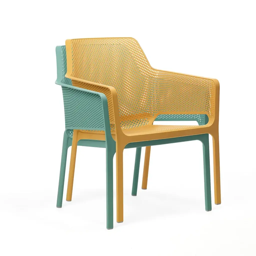 Net Relax is an armchair with a frame made of fiberglass resin, accessorised with a soft fabric cushion in delicately contrasting colours. Ideal for outdoor and indoor use.It has collected the following prizes and awards: ADI Design Index, Red Dot Design Award and Good Design Award.New and relaxing, the single-body of Net Relax is decorated with a square perforated pattern evenly distributed over the entire surface of the armchair, the result of a complex 3D shaping and milling process.The chair is matt, slightly rounded and very pleasant to the touch. The perimeter is edged with a band with a rectangular section that facilitates constant support of the arms, seamlessly, delineating the legs of the chair.This resin armchair, perfect for outdoor and indoor use, is available in an interesting colour range that enhances the light/dark effects of the fabrics chosen for the padded elements.Technical detailsStackable single-body armchair. UV-treated mass-coloured polypropylene fiberglass. Matt finish. Supplied with non-slip feet. Cushion available to order. Recyclable resin.