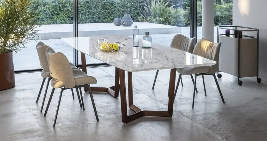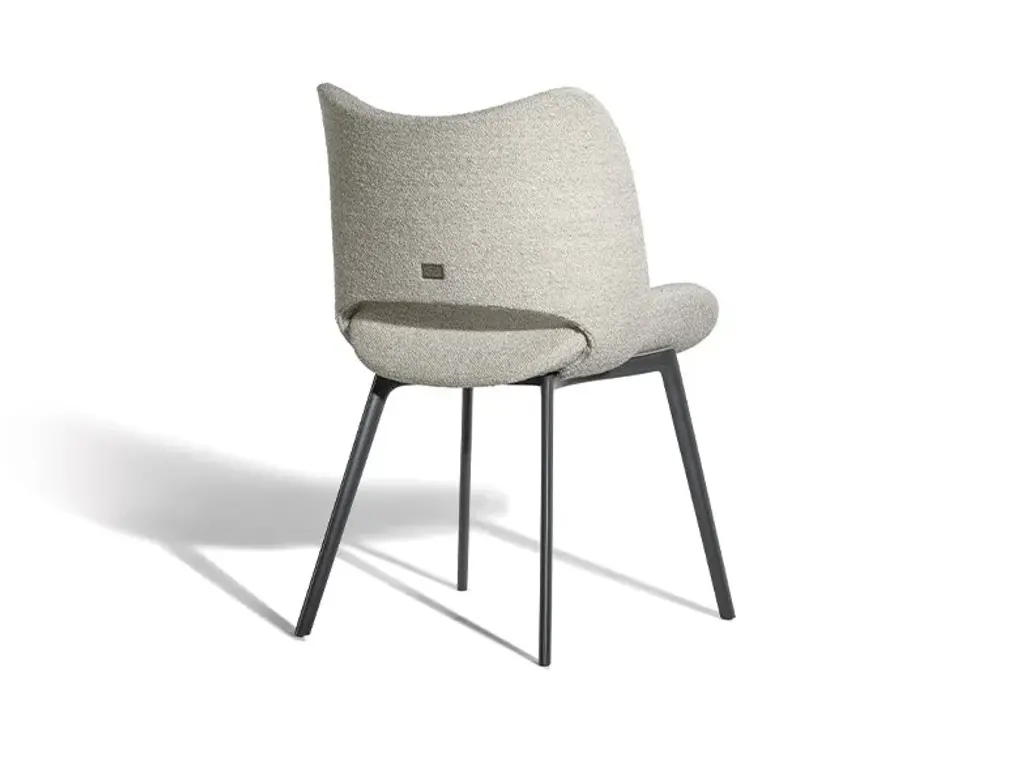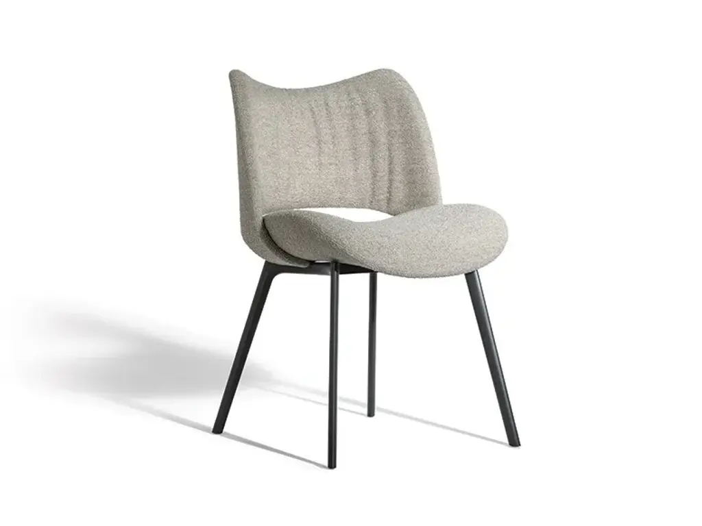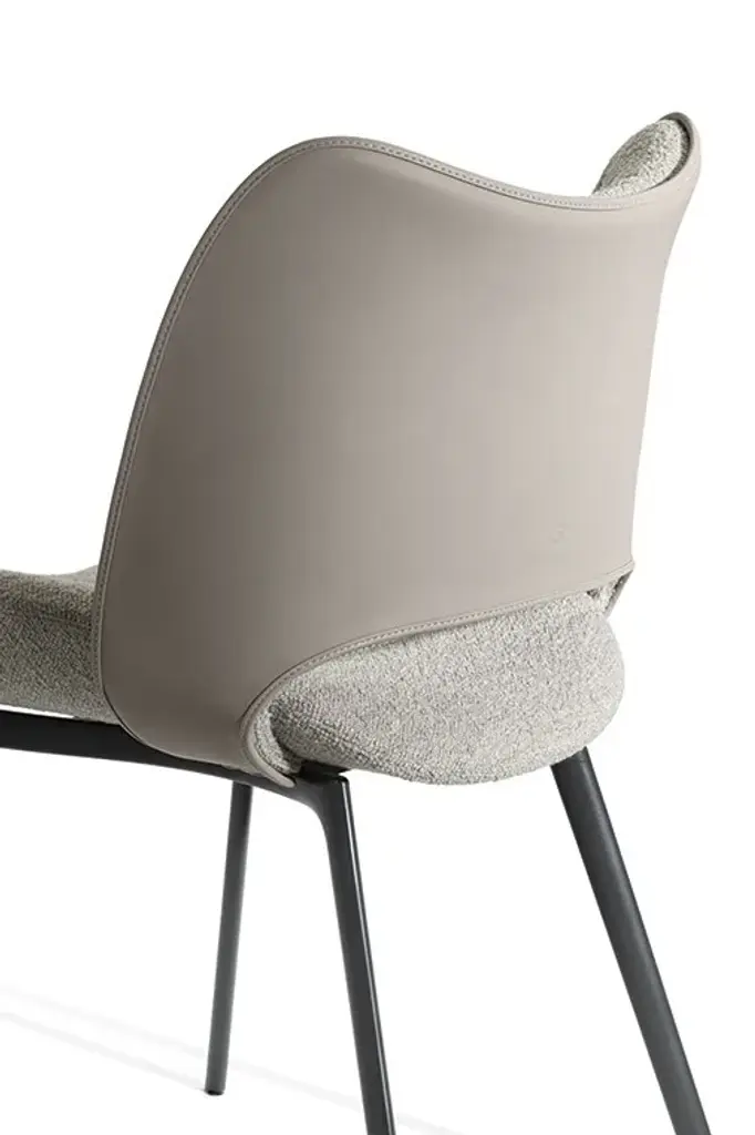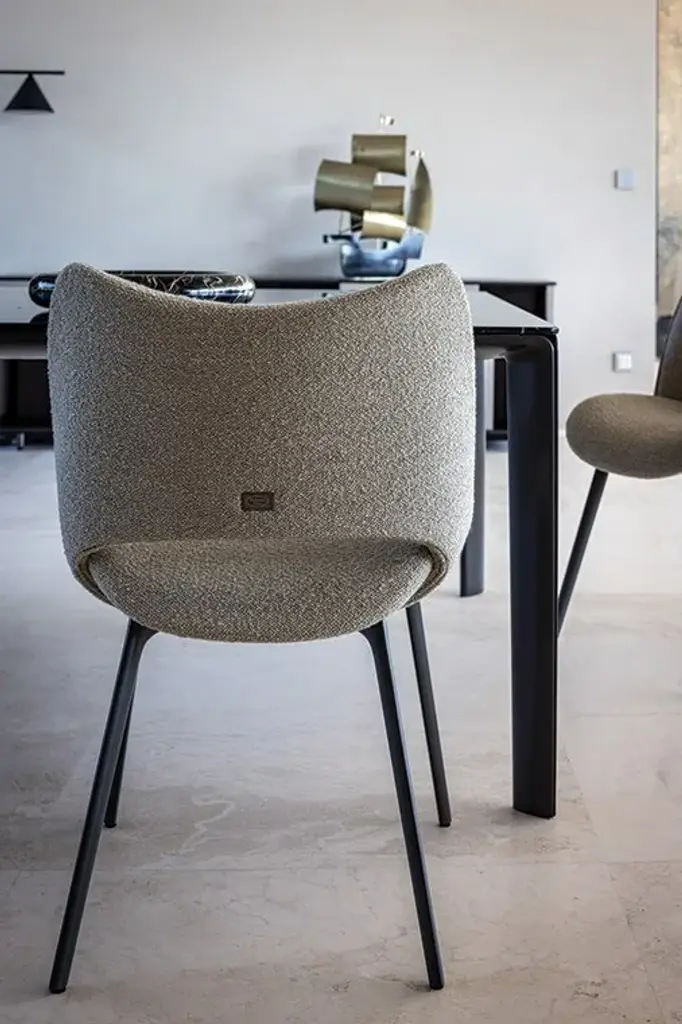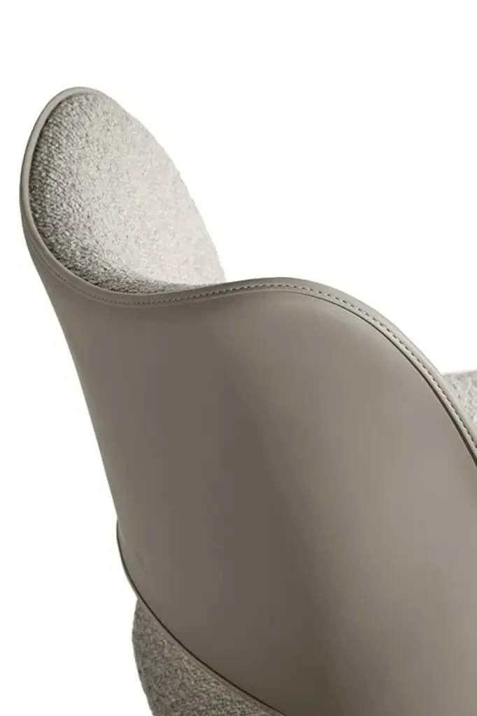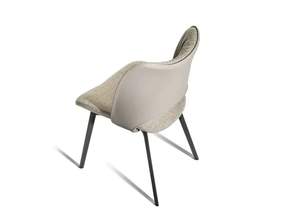 La sedia da tavolo è il risultato di soluzioni tecniche complesse, che conferiscono qualità e solidità al progetto, e di proporzioni armoniche, come tra la scocca e il basamento a quattro gambe in metallo o legno massello di frassino, che si innestano esili al di sotto del sedile, alleggerendo visivamente la seduta.Nice è pensata per spazi domestici e hospitality raffinati e dal gusto moderno, che cercano il comfort assoluto attraverso un prodotto caldo e accogliente, generoso ma allo stesso tempo leggero.A small table armchair with a strong presence in the lunchroom. Nice, designed by GamFratesi, exhibits a compact volume, with an organic and enveloping shape. The designer seat consists of the two cases of the backrest and the shell that flex and overlap like two folded sheets, ensuring comfort and support for the body.As they overlap, the two elements create a void in the rear part of the backrest which becomes a recognisable sign. The intimate welcome offered by Nice is emphasized by the sensual softness of the upholstery in Pelle Frau® leather or fabric. Both can also be combined with the saddle-leather provided on the external part of the backrest; upholstery whose tailored stitching, masterfully performed by Poltrona Frau's artisans, emphasizes the external profile in a strong silhouette.