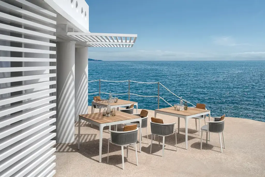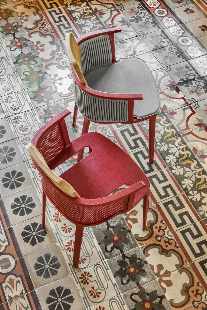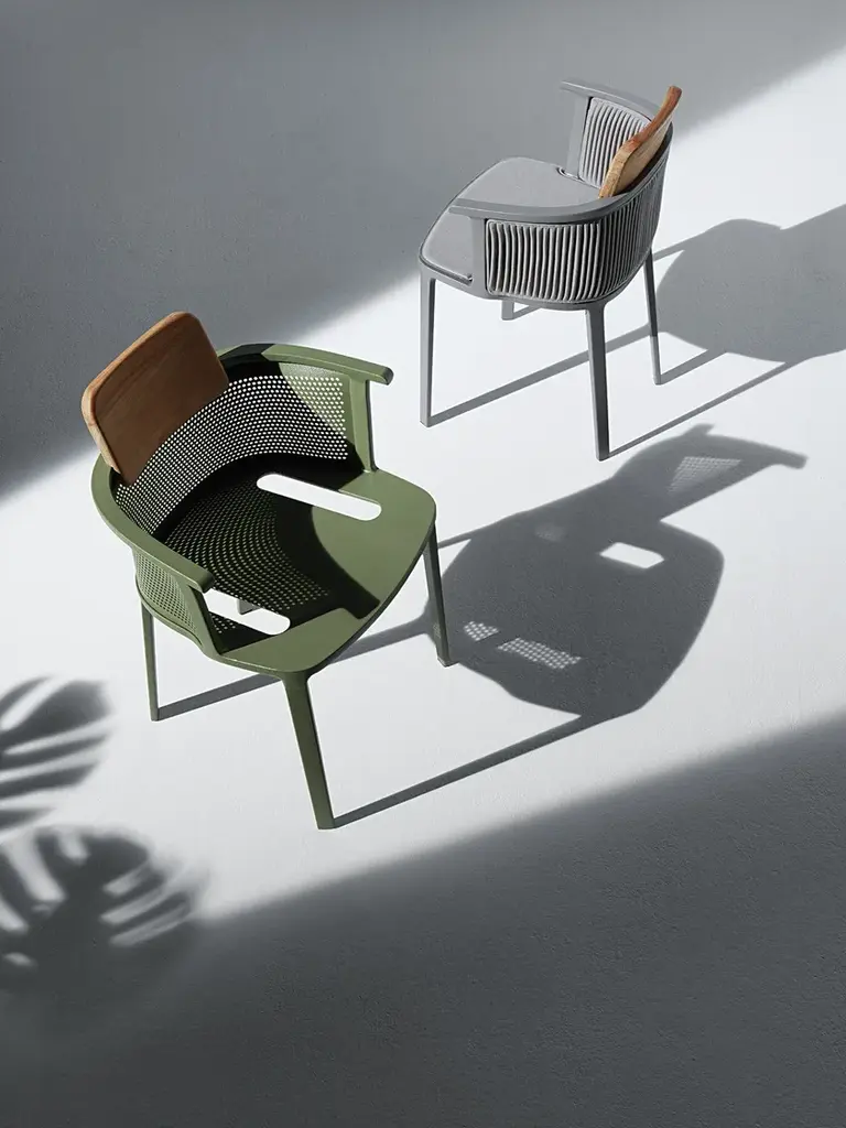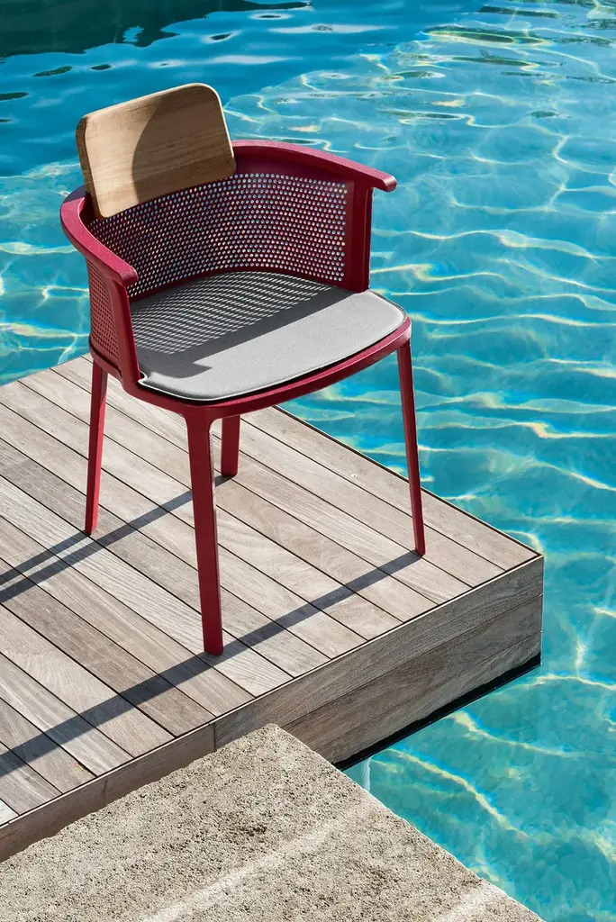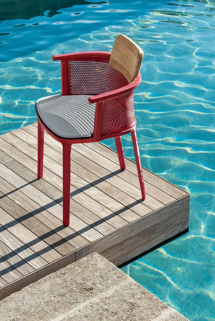 Nicolette grew from the idea of creating an aluminium chair with light and delicate lines yet robust enough for everyday use; a chair capable of withstanding the effects of time, designed for outdoors but suitable for a variety of uses; an original, well-made chair. Like an haute couture garment, Nicolette shows a certain sophistication, maintaining a simple character which imparts elegance. Ethimo and Patrick Norguet have created a chair that combines a variety of materials along with different techniques for working the aluminium: the structural parts in aluminium are injection-moulded, then assembled using components in extruded aluminium. The feature that sets Nicolette apart is the upholstery of the back, a true evolution in textiles for exteriors. Working to a specific industrial patent, they have achieved a rigid pleating of the fabric, while retaining intact its water-resistance and toughness, qualities that are fundamental in a product intended for outdoor use. Finally, the back includes a teak element, making the chair even ‘warmer’ and more comfortable. This characteristic of elegant simplicity, combining lightness and practicality with attention to detail and carefully sourced materials, makes the chair ideal for furnishing outdoor spaces as well as for enhancing the living area. The most sophisticated furnishing and relaxation requirements are satisfied in its all-enveloping form. Nicolette is a contemporary take on an unconventional elegance. A multipurpose design that springs from the desire to experiment with fresh combinations of materials.