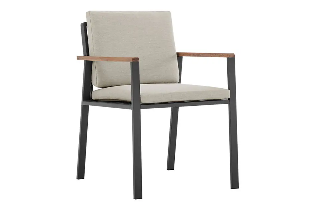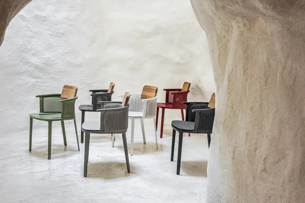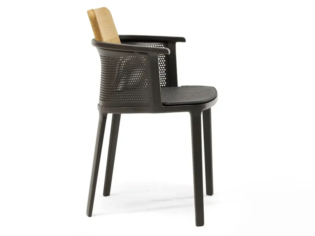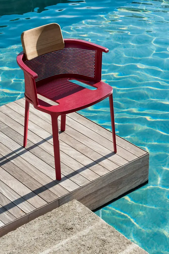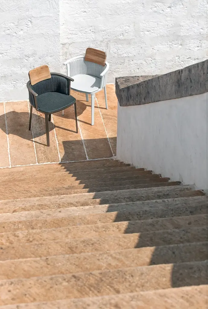 Nicolette grew from the idea of creating an aluminium chair with light and delicate lines yet robust enough for everyday use; a chair capable of withstanding the effects of time, designed for outdoors but suitable for a variety of uses; an original, well-made chair. Like an haute couture garment, Nicolette shows a certain sophistication, maintaining a simple character which imparts elegance. Ethimo and Patrick Norguet have created a chair that combines a variety of materials along with different techniques for working the aluminium: the structural parts in aluminium are injection-moulded, then assembled using components in extruded aluminium. The feature that sets Nicolette apart is the upholstery of the back, a true evolution in textiles for exteriors. Working to a specific industrial patent, they have achieved a rigid pleating of the fabric, while retaining intact its water-resistance and toughness, qualities that are fundamental in a product intended for outdoor use. Finally, the back includes a teak element, making the chair even ‘warmer’ and more comfortable. This characteristic of elegant simplicity, combining lightness and practicality with attention to detail and carefully sourced materials, makes the chair ideal for furnishing outdoor spaces as well as for enhancing the living area. The most sophisticated furnishing and relaxation requirements are satisfied in its all-enveloping form. Nicolette is a contemporary take on an unconventional elegance. A multipurpose design that springs from the desire to experiment with fresh combinations of materials.