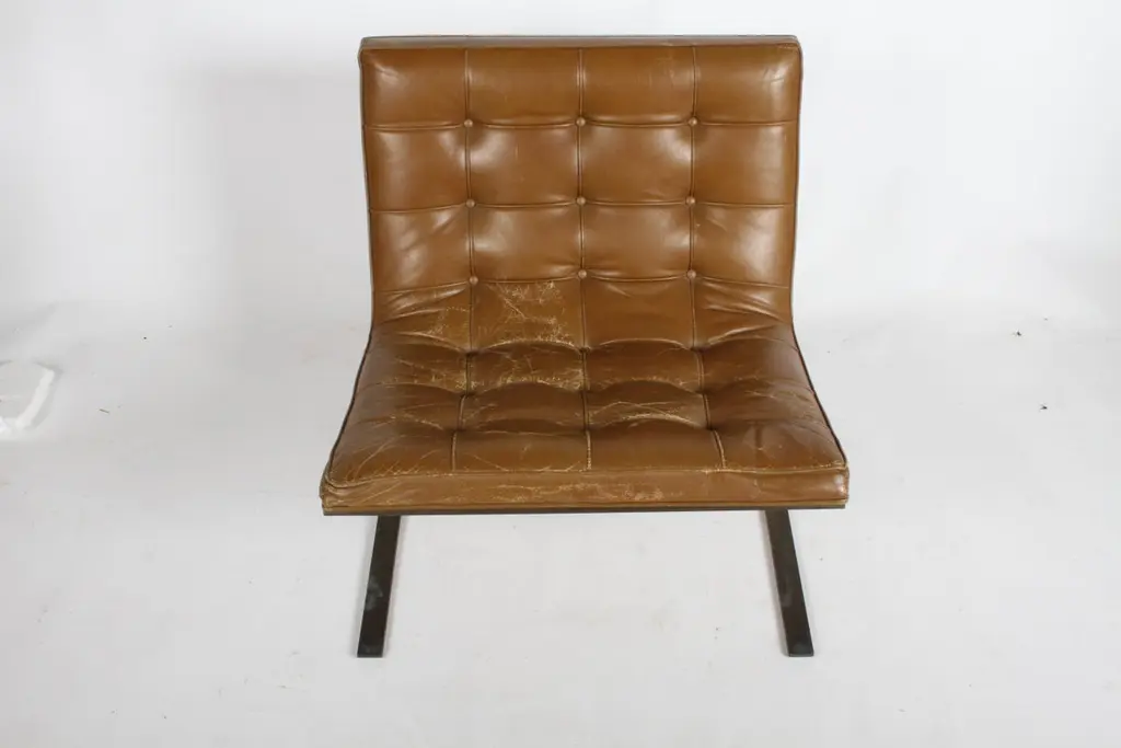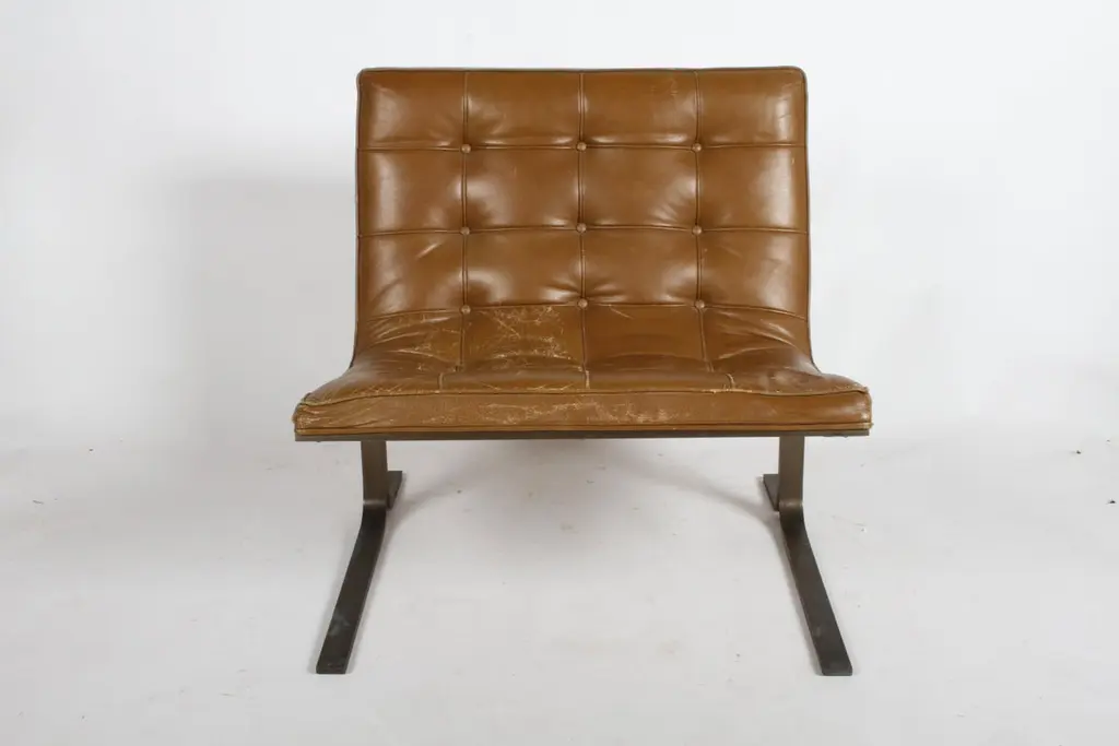 Mid-Century Modern CH28 lounge chairs by architect Nicos Zographos with Carmel tufted leather seats and bronze bases, circa 1960s. Pair available, priced per chair. Designed and manufactured by Nicos Zographos Designs Ltd. Nicos designed this chair while working at Skidmore, Owings and Merrill in the 1959. The CH28 lounge became the first chair in the Zograhos collection, and was awarded the NCBI top furniture design award. Similar In style of Mies Van Der Rohe's Barcelona chair for Knoll. Leather is worn and torn, should be updated, unless you like the worn look. Patina to bronze.