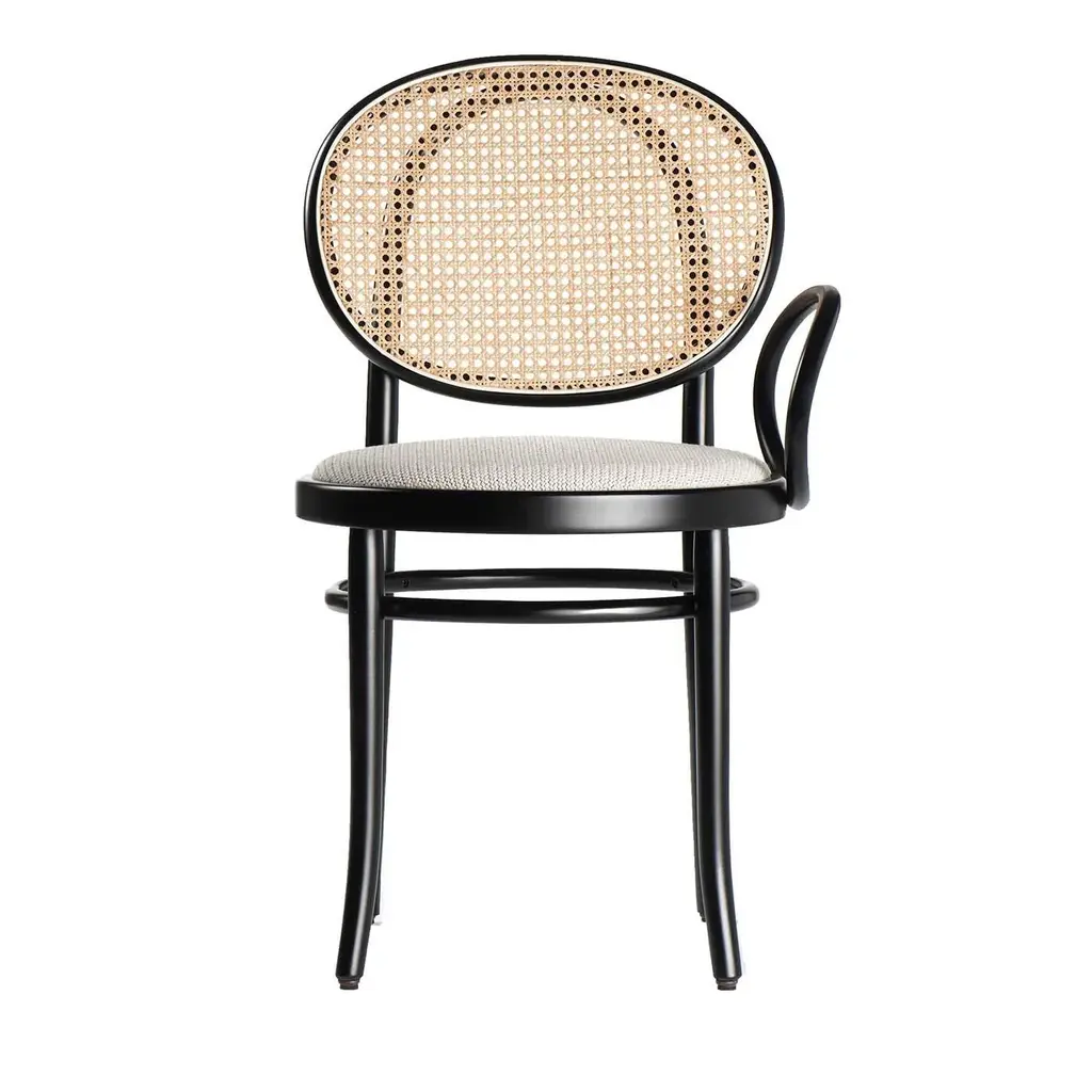 This unique piece was designed by Front in 2017 as part of the No. 0 collection of chairs. Combining the contemporary and playful aesthetic of the Swedish duo with the century-old tradition of Viennese furniture, this armchair boasts a steam-bent beechwood frame finished with black lacquer that features a single round armrest on one side. The frame envelops the round seat with white fabric upholstery and the backrest with stunning Viennese straw. Signed by Maker