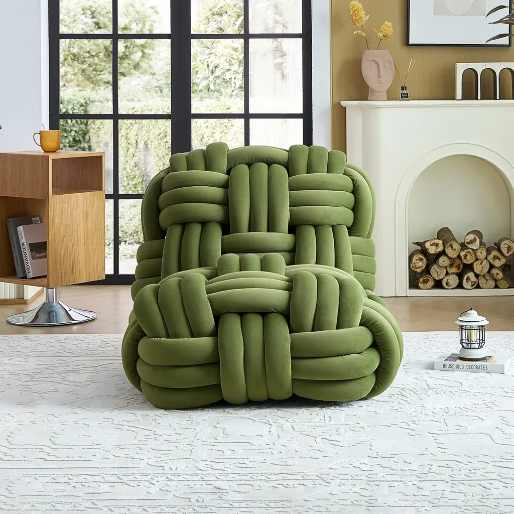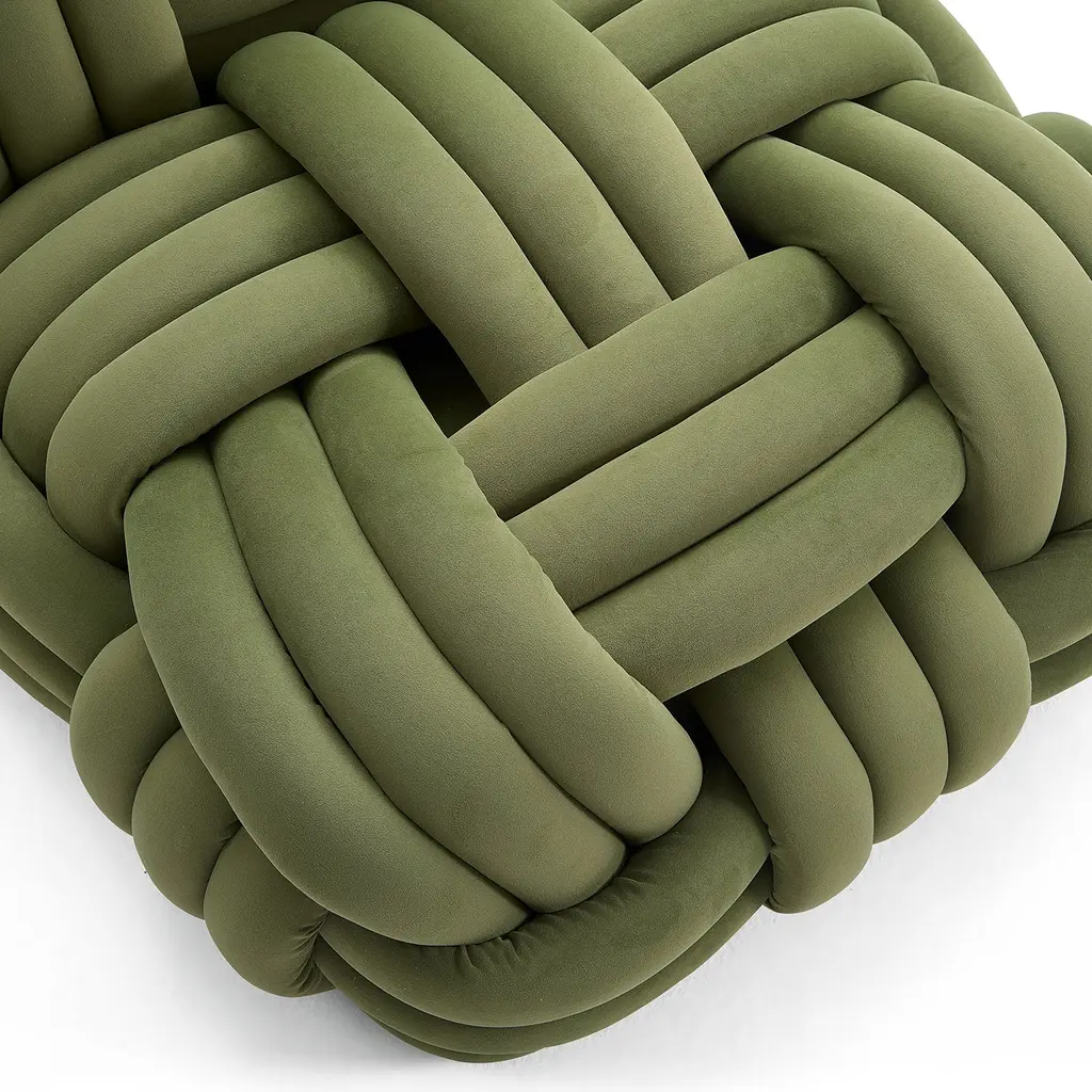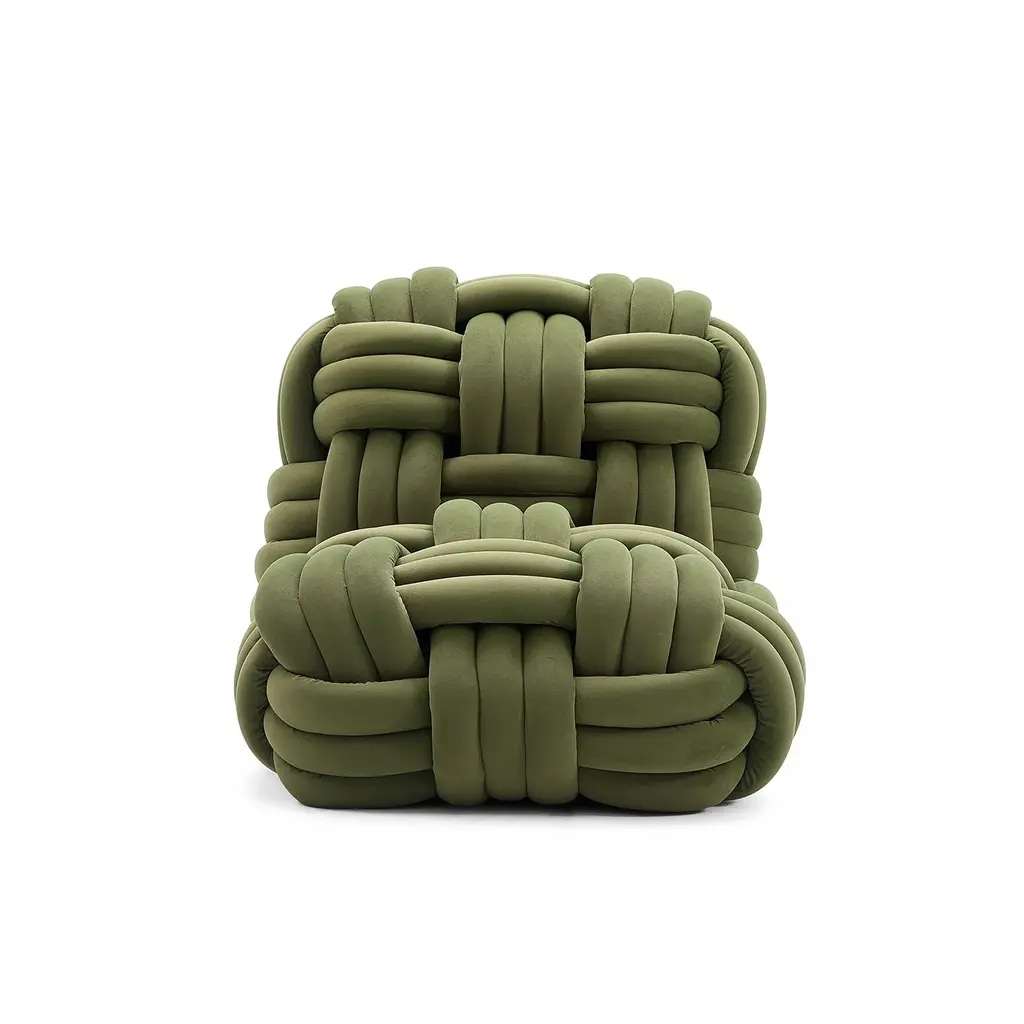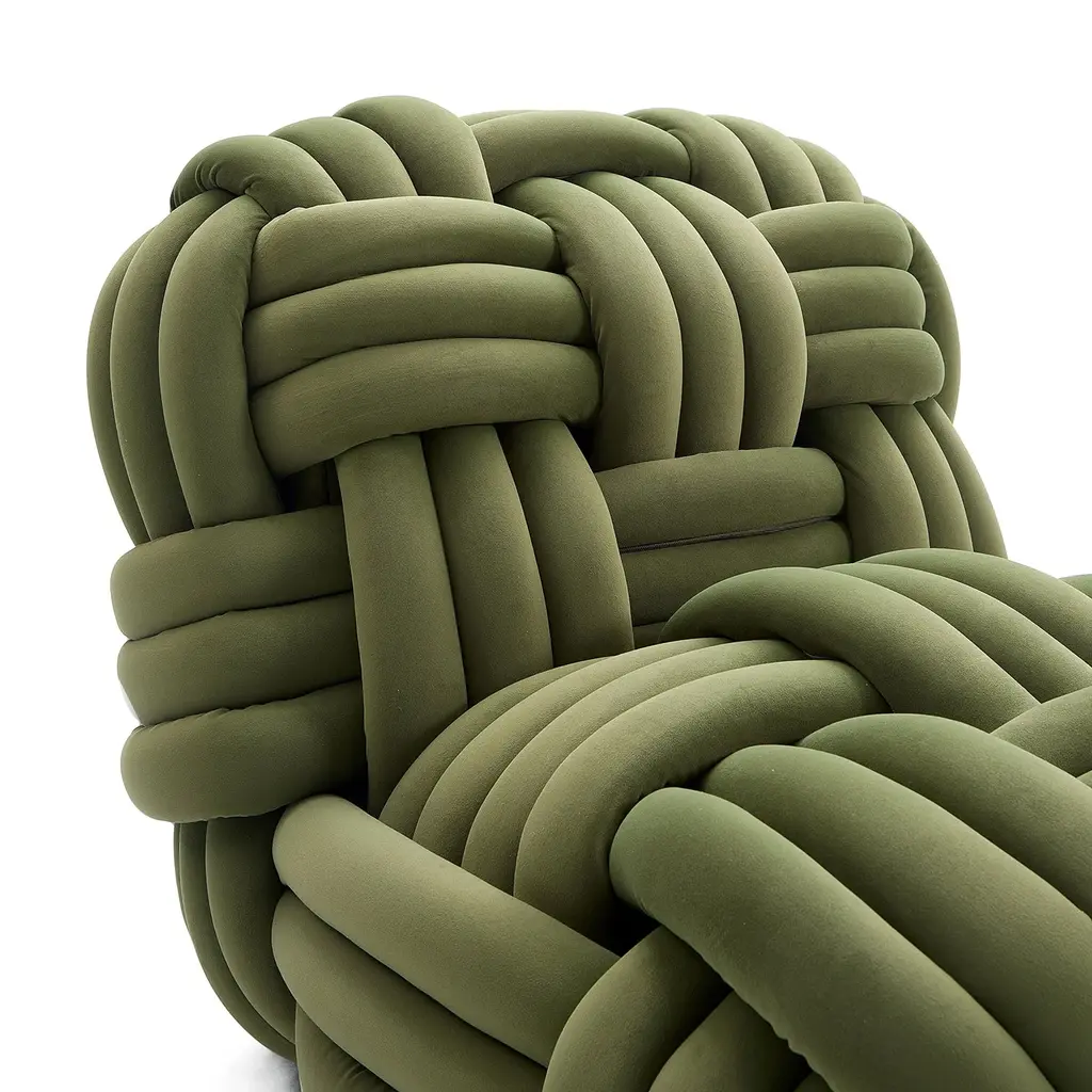 Unique Knotted Design The unique knotted design adds an element of artistry and elegance, while its vibrant colors - Orange, Green, and Grey - make a bold statement. Experience luxury and comfort in one with the Nodo chair. High Quality Materials Each cylinder foam piece is wrapped with luxurious fabric and then braided to the Nodo Chair unique woven design. I've used only high-quality materials and expert craftsmanship, to provide a comfortable and supportive seat. Art Of Comfort Indulge in this exclusive piece that will elevate your space with its elegant design and unparalleled comfort. Sit back, relax, and enjoy the art of comfort with the Nodo Chair.