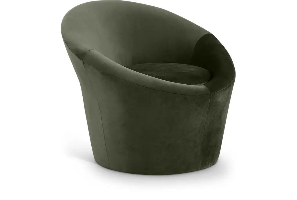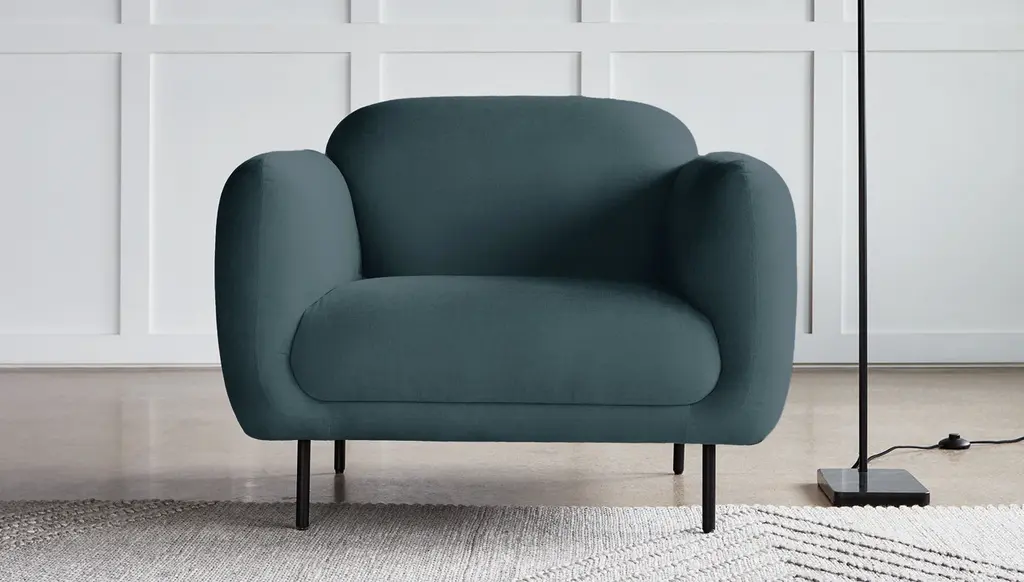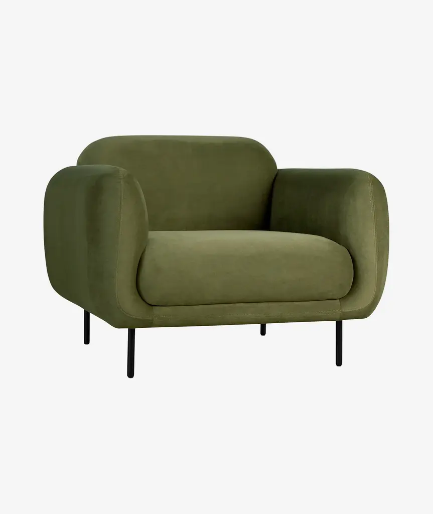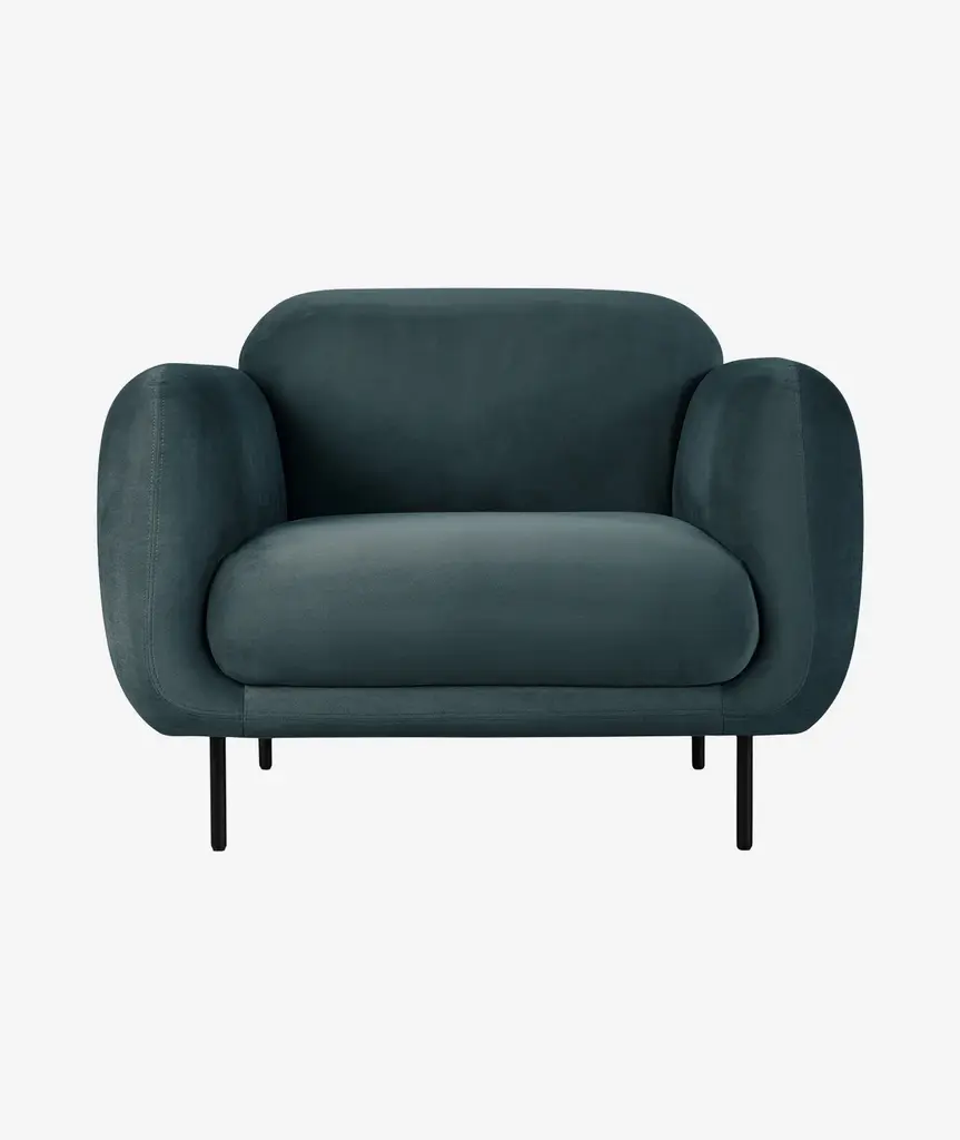 Envelop yourself in mod luxury with the plush and sophisticated Nord Chair. With an elegant, curved silhouette, the Nord Chair invites you to sink in and stay awhile, with a retro yet timeless shape that’s emphasized by an ample, low profile back and feminine curved arms. Each piece has been expertly crafted in lush fabric, with a tight seat and back atop black steel legs that add a modern touch to the piece’s striking ‘70s-inspired sensibilities.
