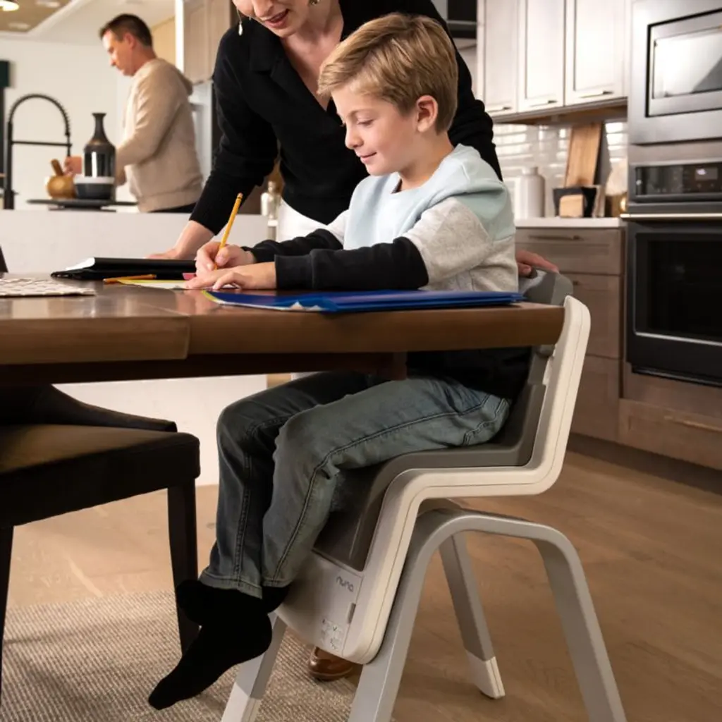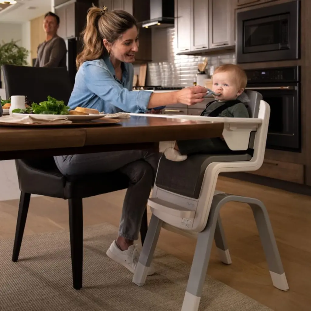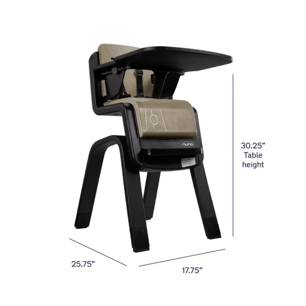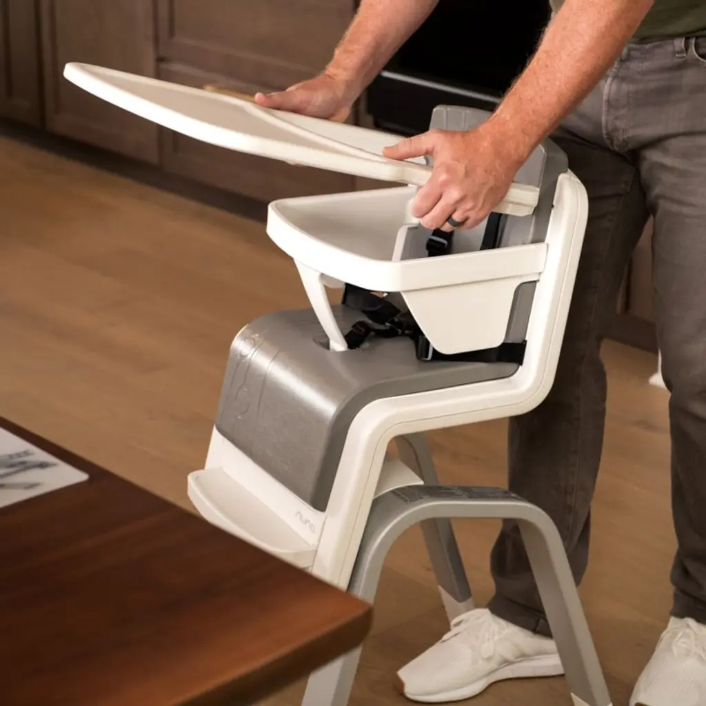The compact design of the Nuna® ZAAZ high chair makes it easy for your little one to grab a seat right at the table. The sleek, modern design converts from baby high chair to toddler chair to big-kid chair when the time comes. Its no-crevice design is also super easy to cleansimply wipe it down or just remove the tray and pop it in the dishwasher.