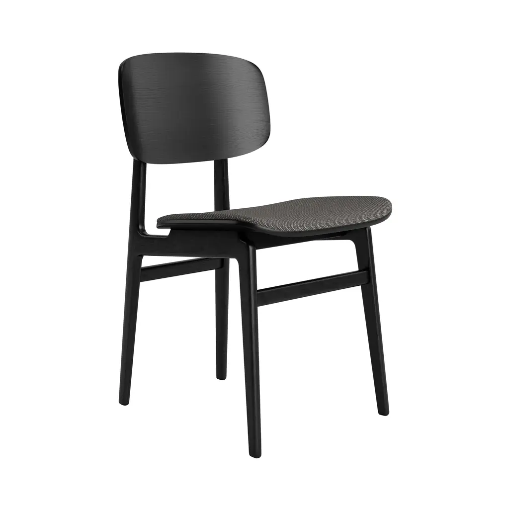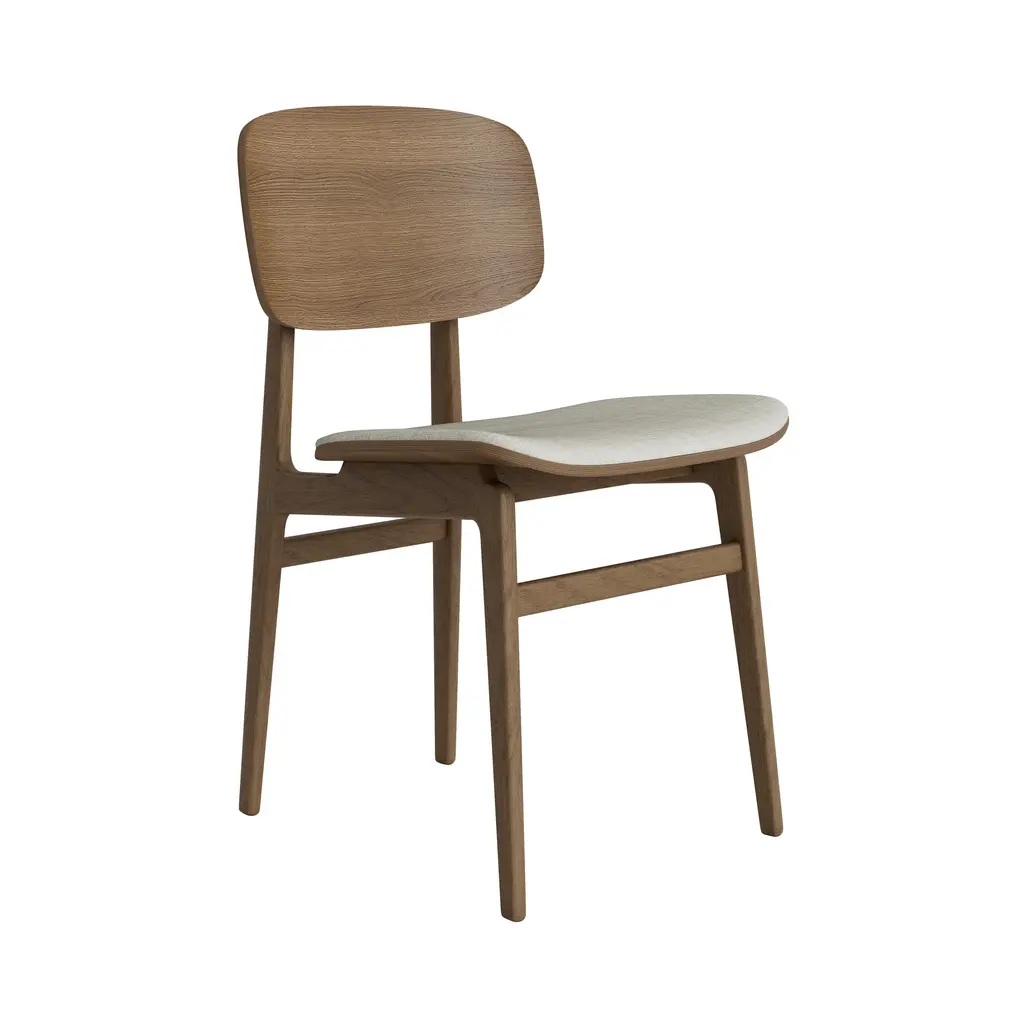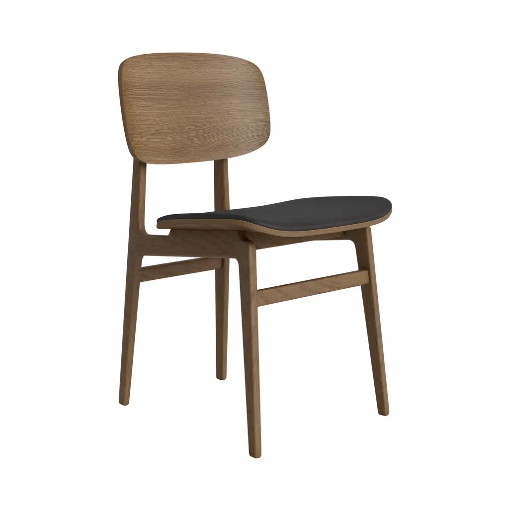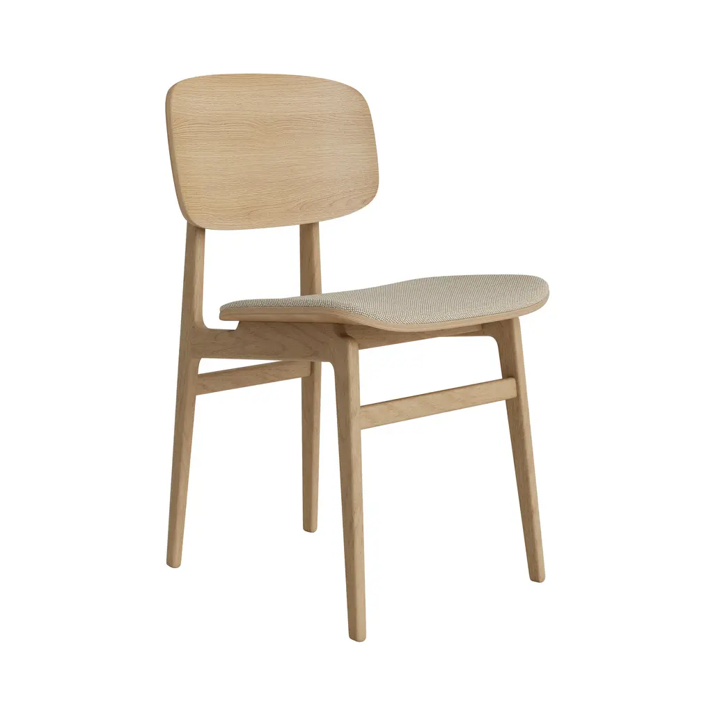 The NY11 Chair, designed by Rune Krøjgaard and Knut Bendik Humlevik, is inspired by mid-century Danish school chairs. Its frame is made from FSC-certified oak, with elegantly curved, laminated oak veneer forming the backrest and seat. The natural wood grain is left exposed, highlighting the craftsmanship and giving the chair a warm, organic look. This seat upholstered version of the NY11 includes padded seat upholstery, which adds softness to its simple, sturdy form.
