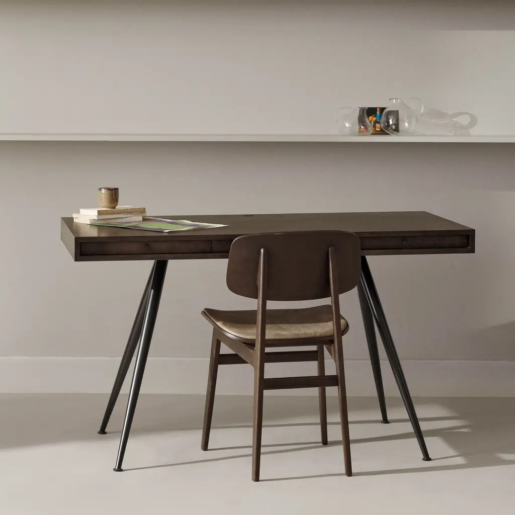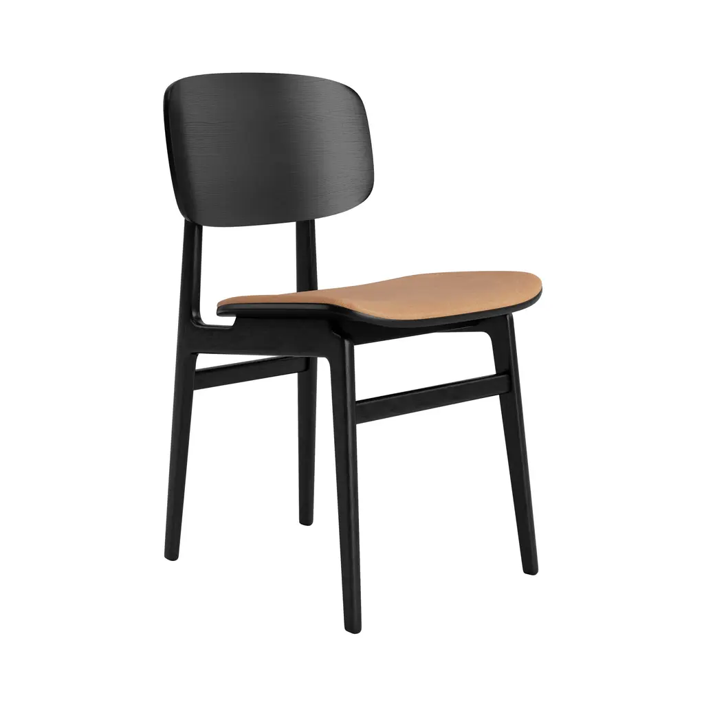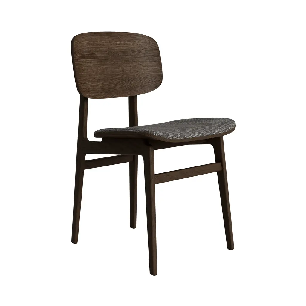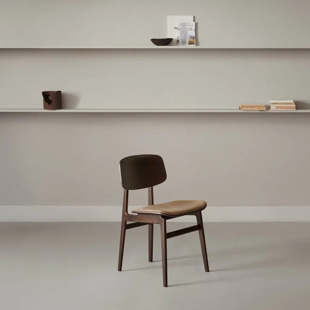 The NY11 Chair, designed by Rune Krøjgaard and Knut Bendik Humlevik, is inspired by mid-century Danish school chairs. Its frame is made from FSC-certified oak, with elegantly curved, laminated oak veneer forming the backrest and seat. The natural wood grain is left exposed, highlighting the craftsmanship and giving the chair a warm, organic look. This seat upholstered version of the NY11 includes padded seat upholstery, which adds softness to its simple, sturdy form.