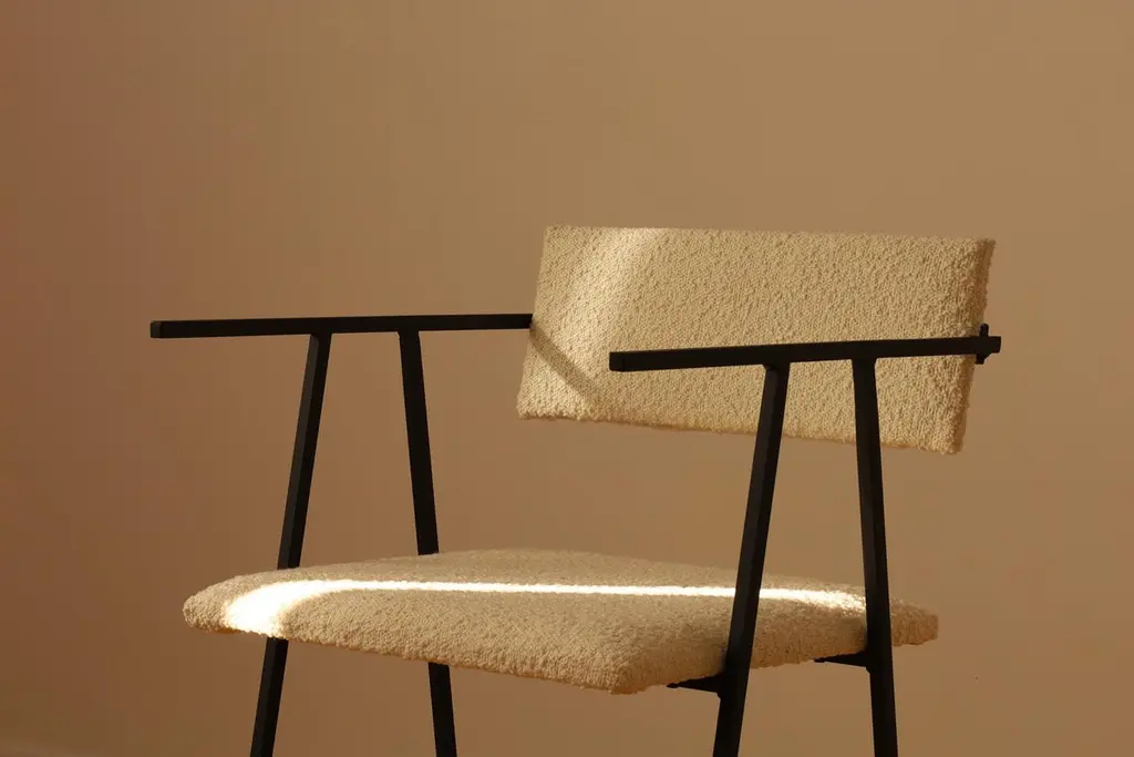 Object 058 black chair by NG DesignDimensions: D45 x W42 x H75 cmMaterials: Powder coated steel, Boucle upholstery.Also Available: All of objects available in different materials and colors on demandObject058 is a comfortable chair upholstered in Boucle fabric. The minimalist shape together with the soft seat and back create a very successful combination. The backrest hanging on the armrests gives the chair an original shape."Our brand was created out of a passion for unconventional design. The furniture we produce is characterized by the highest quality and attention to detail. Each piece of furniture is handmade in Poland and its design defies a traditional approach. standard of interior design. to an object of uniqueness, which makes it a form in itself".