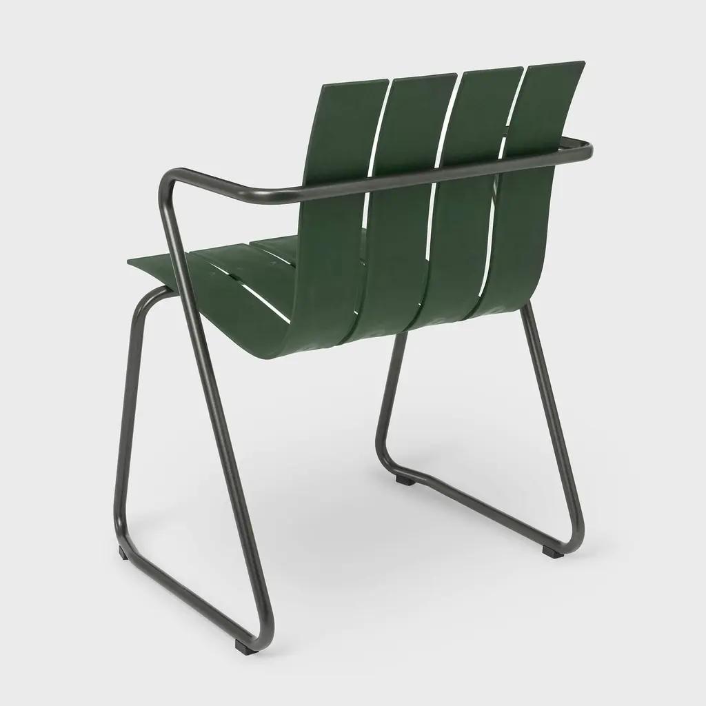 Simple shapes and a light profile characterize this outdoor chair, made with recycled materials that keep waste out of the ocean. It's crafted by Mater, a Danish brand that champions sustainability and ethical design.