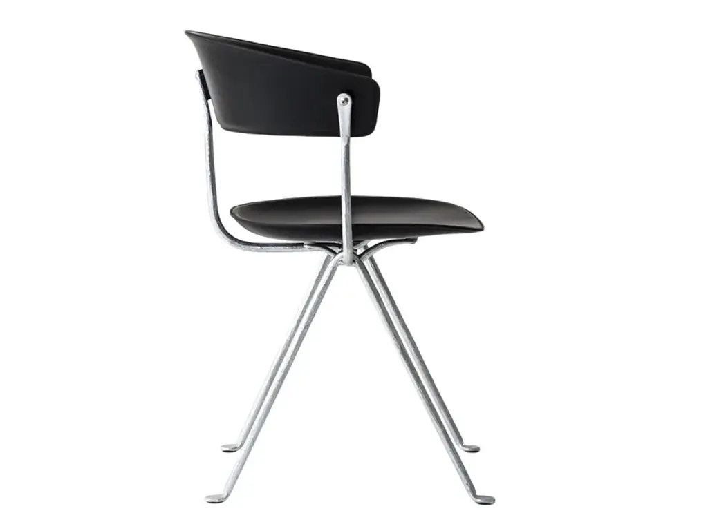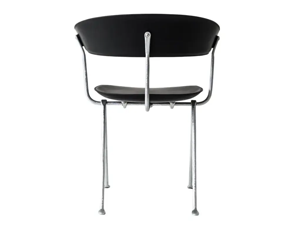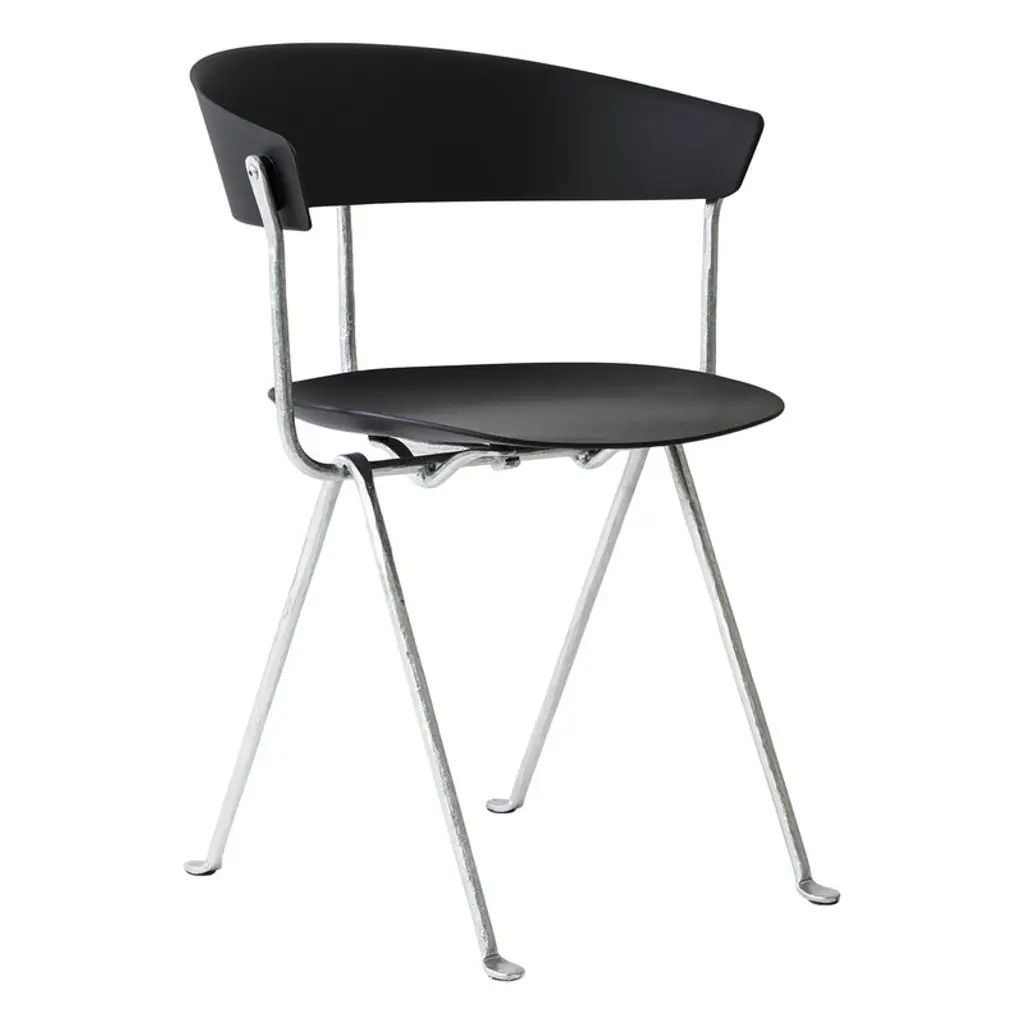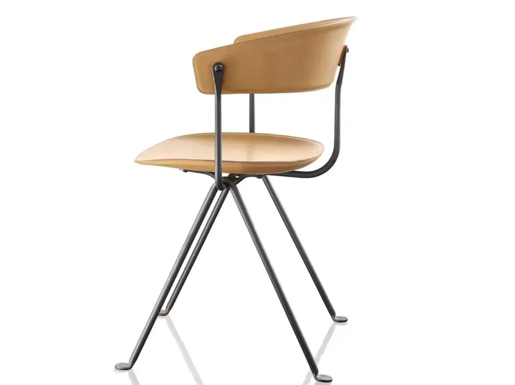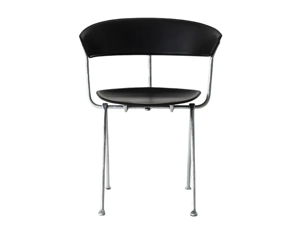 Chair.Material: frame in wrought iron, galvanized or cataphoretically treated and painted in polyester powder. Seat and back in standard injection-moulded polypropylene with glass fibre added (suitable for outdoor use) or in polypropylene covered in premium-grade leather.Italian design and traditional craftsmanship are harmoniously combined in the Magis Officina collection, which explores a new creative language through the ancient fabrication process that is iron forging. Throughout history, this technique has been used to create an infinite number of everyday objects and decorative artefacts. The products in this collection feature a typical wrought iron finish that makes them living design objects, and their distinctly industrial feel is guaranteed to create interesting contrasts in any setting. Following the tables, chairs and stools, the collection expands further with a series of accessories, with a low chair, with a twoseater bench and a collection of upholstered pieces (armchair, ottoman, two and threeseater sofas). All these pieces feature a forged iron structure, with the allure of a raw material handed down through the centuries, alive, with those slight imperfections that make each item in this collection unique, with a profoundly refined and elegant spirit.