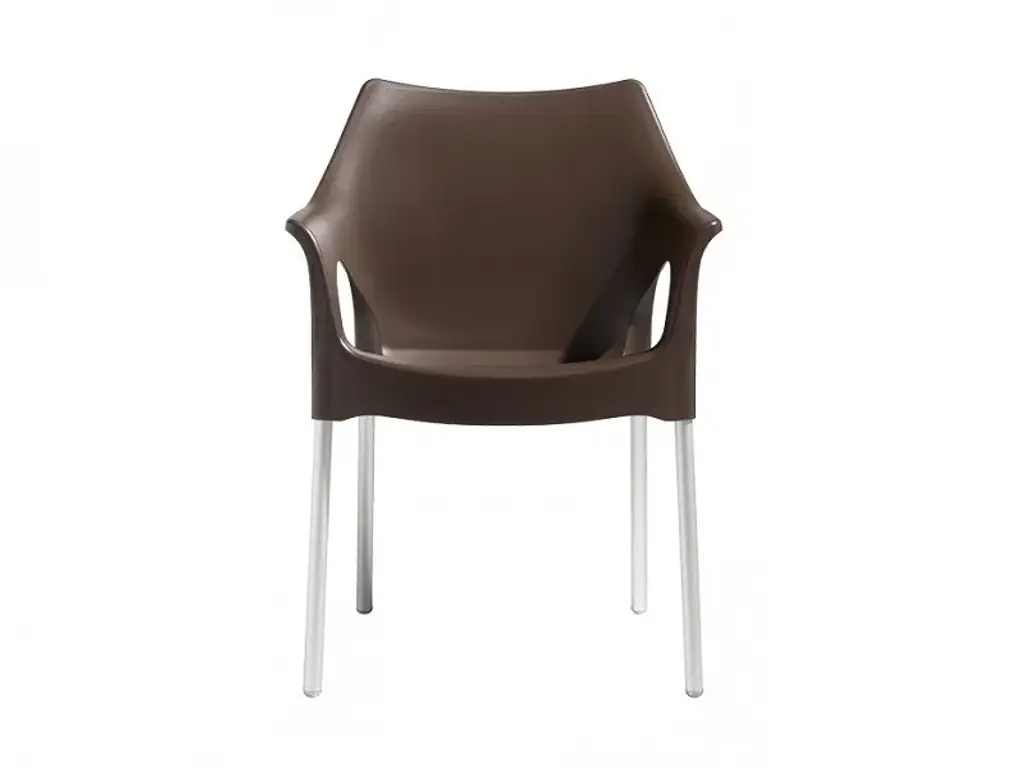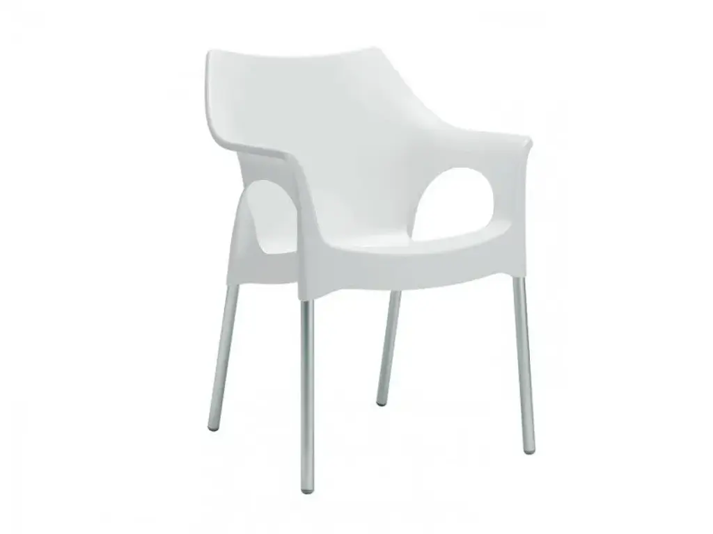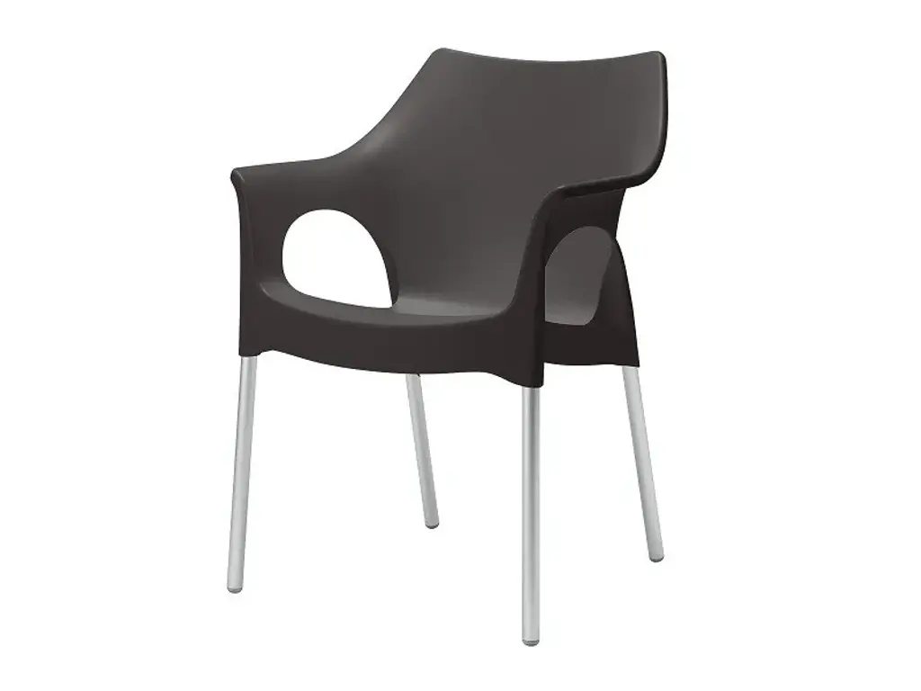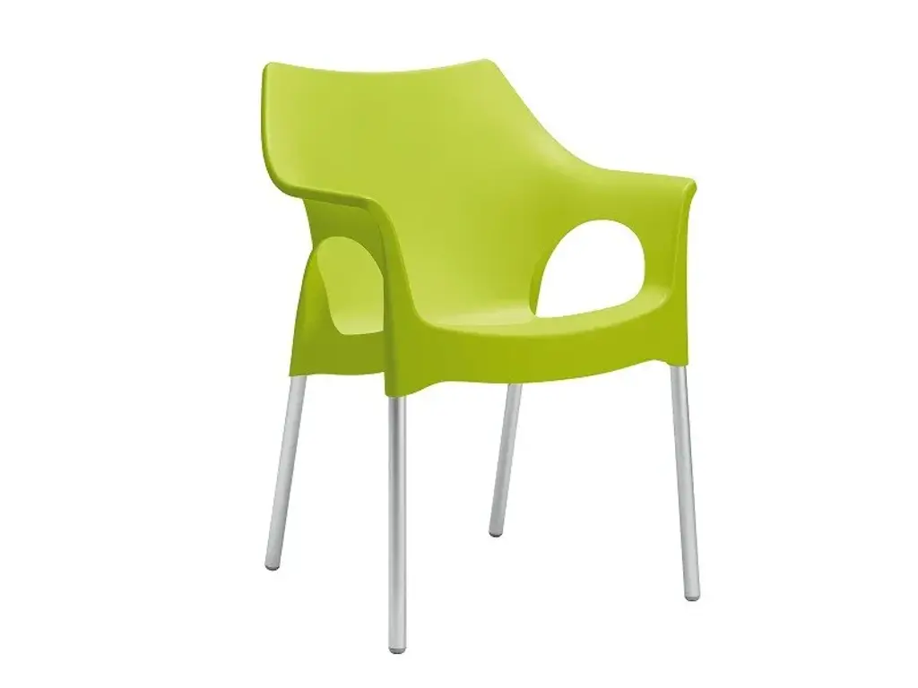A movement of shapes and....olè!Ola offers generous comfort through sinuous and exuberant lines, enhanced by the side opening and the clever contrast between curvilinear elements.Recyclable technopolymer seat and backrest.Anodised aluminium legs, diameter 25 mm.Stackable. For indoor/outdoor use.On demand dogs for linking in polypropylene are available to compose tip up chair rows.PURCHASE INFORMATION:Price includes 4 pcs. with the same configuration.